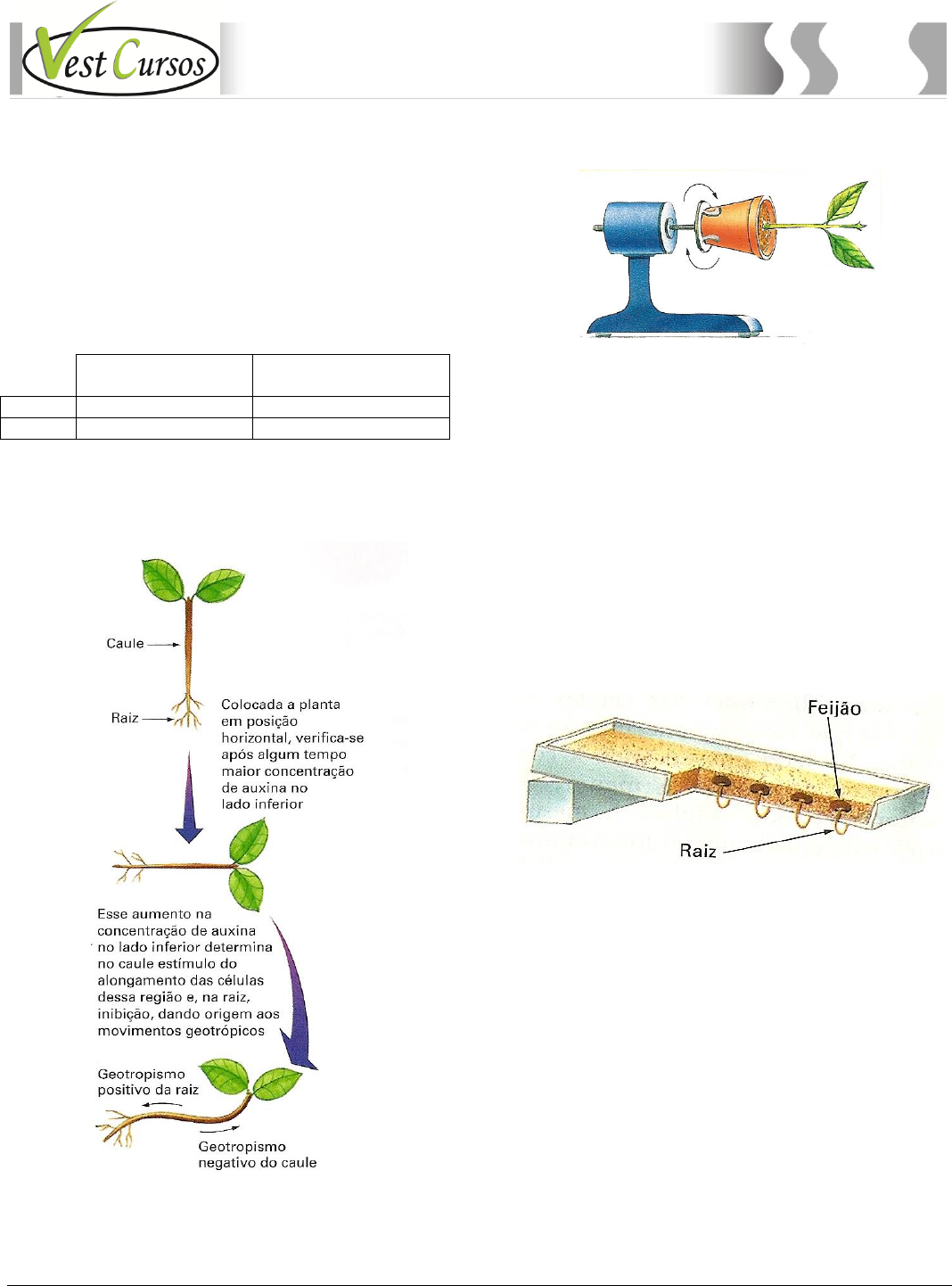 VestCursos – Curso de Biologia – Prof. Landim – www.VestCursos.com.br 151 Curso de Biologia Geotropismo ou gravitropismo No geotropismo ou gravitropismo, a planta cresce em direção ao centro da Terra, orientada pela gravidade. O caule possui geotropismo negativo, crescendo em sentido contrário ao da gravidade, enquanto a raiz apresenta geotropismo positivo, crescendo no sentido da gravidade. Uma planta mantida na horizontal apresentará em seu caule uma curvatura para cima e em sua raiz uma curvatura para baixo. Isso ocorre porque a gravidade faz com que os líquidos do corpo da planta (onde a auxina estará) se acumulem na parte mais inferior da planta. Assim, haverá mais auxina na parte inferior da planta que na sua parte superior. Lado inferior: muita auxina Lado superior: pouca auxina Caule Cresce Sem efeito Raízes Inibe Cresce Assim, a parte de baixo do caule na horizontal cresce e sua parte de cima não, o que leva a uma curvatura com geotropismo (-). Já na raiz, a parte de baixo com muita auxina não cresce e a parte de cima cresce, levando por sua vez a uma curvatura com geotropismo (+). Geotropismo. Caso a planta mantida na horizontal seja acondicionada a um dispositivo giratório que a faça girar ao longo de seu eixo longitudinal, passará a ocorrer uma distribuição homogênea de auxinas por todo o corpo da planta, e o geotropismo não mais serás percebido, pois ele se origina exatamente da distribuição heterogênea dessas substâncias em certas partes da planta. A rotação promove uma distribuição homogênea de auxinas: não há geotropismo. Hidrotropismo Além do geotropismo, as raízes realizam um outro movimento denominado hidrotropismo, que é provocado e orientado pela água. Uma interessante experimentação, na qual se pode verificar a um só tempo o geotropismo e o hidrotropismo da raiz é a seguinte: - tomamos uma pequena caixa triangular de madeira; fazemos uma série de furos no fundo da caixa, a espaços regulares de aproximadamente 2 cm; - pegamos alguns feijões e os colocamos, uma a um, ao lado de furos alternados; - molhamos bem a terra e colocamos a caixa em posição inclinada, conforme o desenho. Hidrotropismo. Ao iniciar a germinação, as raízes saem verticalmente da caixa, em direção ao centro da Terra, devido ao geotropismo positivo. Ficando expostas ao ar, perdem água, ressecam e retomam à caixa em busca de água, evidenciando o hidrotropismo positivo. O processo continua com as raízes saindo da caixa devido ao geotropismo positivo e a ela voltando devido ao hidrotropismo positivo. Essa experimentação deixa muito claro que o geotropismo refere-se ao movimento orientado pela Terra e relaciona-se com a força da gravidade, de modo que não tem relação com a terra (solo). É interessante observar que, nas condições da experimentação, o hidrotropismo superou o geotropismo, pois tomou-se condição de sobrevivência para a planta. Em raízes aquáticas, o geotropismo positivo manifesta-se sem nenhuma limitação imposta pelo hidrotropismo, pois as raízes estão mergulhadas na água. VestCursos – Curso de Biologia – Prof. Landim – www.VestCursos.com.br 152 Curso de Biologia Desenvolvimento dos frutos O crescimento dos frutos é estimulado pela auxina liberada pelas sementes em formação. Pode-se obter frutos partenocárpicos (sem sementes) pulverizando-se auxina sobre flores não-fecundadas. Agricultura e fruticultura Além das auxinas naturais, como é o caso do AIA, e auxinas artificiais, como é o caso do ANA (ou ácido α-naftaleno- acético) e o 2,4-D (ou ácido 2,4-diclorofenóxi-acético). Estas auxinas têm inúmeras aplicações na prática de agricultura e fruticultura. - Auxinas são aplicadas em estacas para estimular o de- senvolvimento de raízes nas mesmas e facilitar a pega das mudas em processos de estaquia. - Auxinas são também aplicadas em caules do tipo tubérculo, como a batata-inglesa, para evitar o brotamento de raízes, o que estragaria os mesmos para comercialização em consumo. Assim, aumenta-se o tempo de armazenamento da batata. - Plantas monocotiledôneas são menos sensíveis às auxinas do que as dicotiledôneas, provavelmente porque estas últimas teriam uma maior eficiência no transporte dessas auxinas: uma concentração de auxina que estimula uma monocotiledônea pode já ser suficiente para inibir a dicotiledônea. Assim, auxinas como a 2,4-D são usadas como herbicidas seletivos em plantações de monocotiledôneas para impedir o desenvolvimento de ervas daninhas dicotiledôneas que concorreriam com a plantação pelos nutrientes e água do solo. - Auxinas como o ANA são utilizadas para estimular a floração em algumas plantas como as bromeliáceas, que possuem representantes de utilidade na alimentação humana como é o caso do abacaxi. - Auxinas induzem à partenocarpia em flores, ou seja, promove o desenvolvimento do ovário em fruto mesmo que não haja fecundação do óvulo, o que forma frutos sem sementes (o ovário forma o fruto mas o óvulo não é fecundado para formar a semente). Dessa maneira, pode-se obter uvas, melancias e tomates, dentre outras frutas, sem sementes. - Auxinas inibem a senescência e abscisão de folhas e frutos, pois bloqueiam a síntese de etileno, o que permite que se mantenham os frutos por mais tempo nas árvores sem que caiam, até que estejam prontos para a colheita (se os frutos caíssem, estragariam e não poderiam ser comercializados). O mecanismo de ação do etileno será analisado mais a frente. - O agente laranja, um produto desfolhante utilizado como arma química pelas tropas norte-americanas na guerra do Vietnã, é uma mistura de ésteres butíricos do 2,4-D e do ácido 2,4,5- triclorofenoxiacético (2,4,5-T), outra auxina sintética. O agente laranja contém um contaminante do 2,4,5T, a dioxina 2,3,7,8- TCDD, que é tóxica para animais e pessoas, além de ser provavelmente cancerígena, a dioxina causa lesão severa da pele 