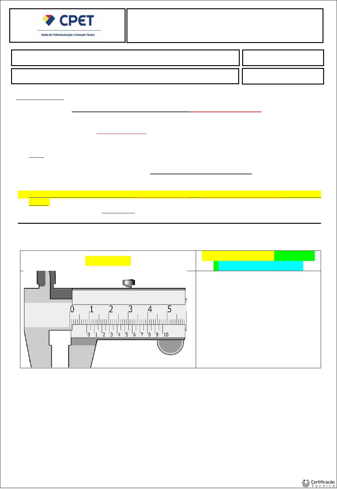 Metrologia I Data: / / Aluno (a): Avaliação Prática Final INSTRUÇÕES: POR FAVOR, LEIA AS INSTRUÇÕES: · Preencha os dados no Cabeçalho para sua identificação; · Esta Avaliação contém 01 (uma) questão, com 10 subitens, totalizando 10 (dez) pontos; · Leia com atenção os enunciados e faça o que se pede; · As respostas devem ser digitadas abaixo de cada pergunta; · NÃO serão aceitas respostas e textos retirados da íntegra Internet, assim como imagens (desde que seja pedida). A interpretação e execução fazem parte do processo. · Ao terminar grave o arquivo com o nome A.P. Disciplina – Nome do Aluno; · Só serão aceitas as extensões .docx (M.S. Word) ou .PDF; · Envie o arquivo pelo sistema no local indicado; · Atividades enviadas “em branco”, plagiadas de sites ou repetidas de outros alunos, terão notas ZERO. · Verifiquem no campo de comentário o feedback dado pelo tutor. · Em caso de dúvidas consulte o seu Tutor. 1) Execute a leitura das medidas e informe o nome dos instrumentos. Instrumento Valor da medida – Resolução – Nome do instrumento Metrologia I Metrologia I