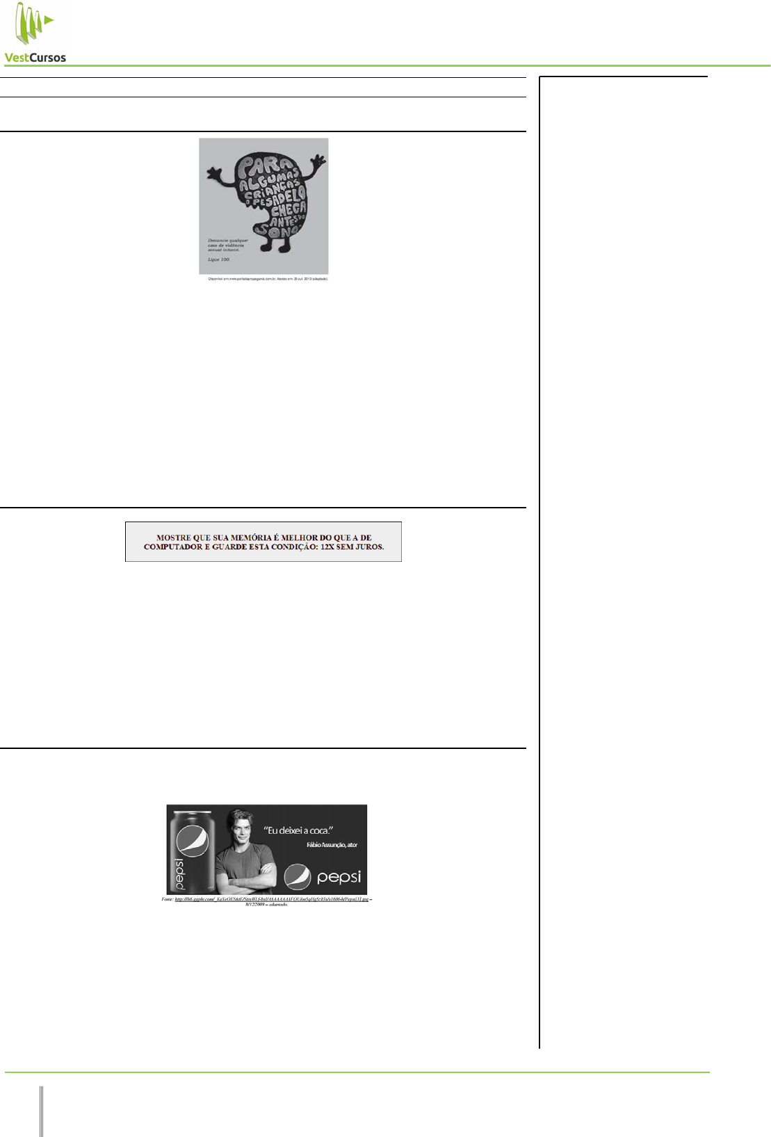 SEMANA 15 – Vírgula e Anúncios 169 VestCursos – Especialista em Preparação para Vestibulares de Alta Concorrência EXERCÍCIOS DE APRENDIZAGEM Questão 01 (ENEM) Os meios de comunicação podem contribuir para a resolução de problemas sociais, entre os quais o da violência sexual infantil. Nesse sentido, a propaganda usa a metáfora do pesadelo para a) informar crianças vítimas de violência sexual sobre os perigos dessa prática, contribuindo para erradicá-la. b) denunciar ocorrências de abuso sexual contra meninas, com o objetivo de colocar criminosos na cadeia. c) dar a devida dimensão do que é abuso sexual para uma criança, enfatizando a importância da denúncia. d) destacar que a violência sexual infantil predomina durante a noite, o que requer maior cuidado dos responsáveis nesse período. e) chamar a atenção para o fato de o abuso infantil ocorrer durante o sono, sendo confundido por algumas crianças com um pesadelo. Questão 02 (ENEM) Ao circularem socialmente, os textos realizam-se como práticas de linguagem, assumindo configurações específicas, formais e de conteúdo. Considerando o contexto em que circula o texto publicitário, seu objetivo ba ́sico e ́ a) influenciar o comportamento do leitor por meio de apelos que visam a ̀ adesa ̃o ao consumo. b) definir regras de comportamento social pautadas no combate ao consumismo exagerado. c) defender a importância do conhecimento de informa ́tica pela populaça ̃o de baixo poder aquisitivo. d) facilitar o uso de equipamentos de informa ́tica pelas classes sociais economicamente desfavorecidas. e) questionar o fato de o homem ser mais inteligente que a ma ́quina, mesmo a mais moderna. Questão 03 As questões 3 e 4 referem-se à sátira de imagem utilizada num blog, ironizando a brincadeira de uma suposta dica de outdoor para o refrigerante PEPSI, com determinada situação interdiscursiva relacionada ao ator Fábio Assunção. A suposta frase utilizada pelo ator Fábio Assunção como um personagem, no intuito de ironizar a propaganda do refrigerante PEPSI – “Eu deixei a coca.” –, associa a ambiguidade de uma mensagem de dois sentidos a) com o fato de começar a tomar o refrigerante PEPSI, deixando o refrigerante concorrente, COCA- COLA, um dos mais vendidos e utilizados em todo o mundo. b) com o fato de deixar de usar cocaína (droga alcalóide derivada do arbusto coca), além de deixar de usufruir o refrigerante concorrente da PEPSI, a COCA-COLA. c) com a situação de saúde enfrentada pelo ator, como usuário de cocaína, causando, provavelmente, vários problemas durante as gravações de uma novela exibida em 2008 pela Rede Globo de Televisão. Anotações 170 VestCursos – Especialista em Preparação para Vestibulares de Alta Concorrência CURSO ANUAL GRAMÁTICA E INTERPRETAÇÃO – (Prof. Cláudio Neves) d) pelo grande sucesso do ator associado ao refrigerante PEPSI, o contrário do grande sucesso da concorrente COCA-COLA, uma das mais vendidas em todo o mundo. Questão 04 O humor negro identificado na imagem que brinca com uma propaganda “criativa” do refrigerante PEPSI está relacionado ao elemento mordaz (ironia um tanto cruel) originado pela situação em relação ao a) fato de o ator destacar o refrigerante PEPSI, dizendo que deixou a concorrente COCA-COLA mesmo estando impossibilitado, ainda, em virtude da crise de abstinência causada pela dependência, de abandonar o uso abusivo de cocaína, o que traz graves doenças. b) outro sentido com o vocábulo deixar, demonstrando a nova embalagem e a nova logomarca exibida pela PEPSI desde 2008, evidenciado a modernidade em deixar determinada etapa, evoluindo a novos sucessos e facilitar as vendas. c) sarcasmo associado ao sucesso do ator como protagonista na última novela em que participou, exibida pela Rede Globo de Televisão, além da dificuldade causada pelo uso de cocaína, tornando-o dependente da situação que ocasiona problemas de saúde. d) vício do uso de drogas por algumas pessoas na sociedade, o que causa prejuízos psicológicos, além de doenças caracterizadas pela dependência incapaz de ser controlada e abandonada pelo paciente, trazendo síndrome de abstinência. Questão 05 De acordo ao efeito político comunicativo de publicidade e propaganda divulgado pelo governo federal, querendo expor em seu bom desempenho administrativo, a linguagem não-verbal, no intuito de chamar a atenção de todos os interlocutores no Brasil, pode ser identificada, principalmente, além dos pequenos layouts nas mãos dos personagens – moradia, saneamento, energia, estradas e água –, pela a) colocação da sigla PAC (Programa de Aceleração do Crescimento). b) estrutura social da etnia racial brasileira: negros, índios e brancos. c) afinidade de estruturas que se coincidem: asfaltos e meio ambiente. d) necessidade em usar um capacete protetor na área de construção. Questão 06 O anúncio acima tem por objetivo ajudar a resolver um problema social, que é a disseminação do vírus da Aids. Para isso, ele recorre, fundamentalmente, a um(a): a) argumento de autoridade, decorrente da assinatura da peça por um organismo renomado na área. b) metáfora, que associa uma ação cuja eficácia está implícita e que denota um conhecimento prévio do leitor. c) recurso de nonsense, que rompe com a expectativa do leitor, e cuja eficácia decorre da intensidade do impacto dessa ruptura. d) argumento que rompe com o senso comum, apontando para uma dimensão inédita do combate à doença. e) dramaticidade inerente ao gesto que se oferece ao leitor, fazendo-o ter contato com aspectos normalmente negligenciados da doença. Anotações SEMANA 15 – Vírgula e Anúncios 171 VestCursos – Especialista em Preparação para Vestibulares de Alta Concorrência EXERCÍCIOS DE FIXAÇÃO Questão 01 A imagem 1 é um anúncio de uma marca italiana de máquinas de café expresso. A imagem 2 é uma reprodução do “Homem vitruviano”,