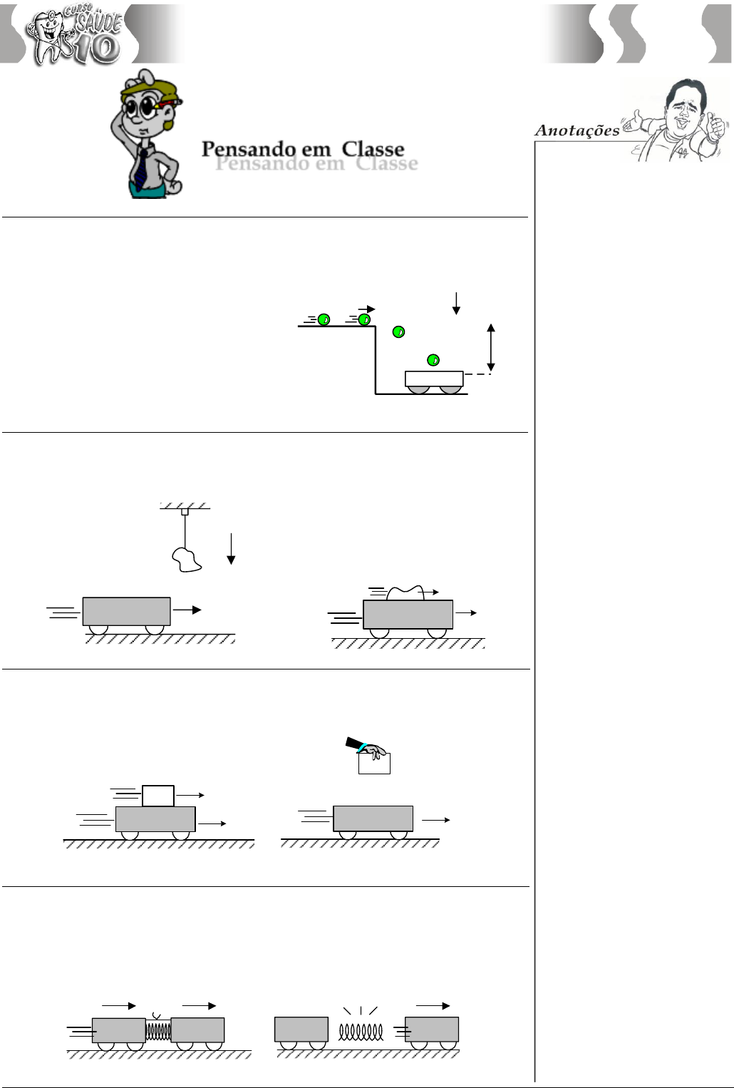 Física Simétrico Pré-Universitário – Há 25 anos ensinando com excelência os estudantes cearenses – www.simétrico.com.br 183 Questão 01 Uma bolinha de chiclete de massa m, que se move com velocidade Vo num plano horizontal liso, cai de uma altura h e “gruda” num carrinho de massa M, inicialmente em repouso (veja a figura a seguir). O prof Renato Brito pede para você determinar qual velocidade adquirida pelo carrinho, após esse episódio. h v o g Questão 02 A figura mostra um carrinho de massa M que se move num solo horizontal liso com velocidade constante V. Uma massa plástica de massa m que encontrava-se suspenso ao teto através de um fio, irá cair e aderir ao carrinho durante a sua passagem. Pede-se determinar a nova velocidade V ’ do sistema (carrinho + bloco) após esse episódio. g m M V V 'm M V ' Questão 03 A figura mostra um carrinho de massa M que se move num solo horizontal liso com velocidade constante V, carregando um bloquinho de mesma massa M. Rapidamente, uma pessoa retira suavemente o bloquinho de cima do carrinho. O prof Renato Brito pede que você determine a nova velocidade do carrinho. M M V V antes M M ? V = 0 depois Questão 04 A figura mostra dois carrinhos de mesma massa M que se movem juntos num solo horizontal liso com velocidade constante V, conectados entre si por um fio ideal. Presa entre eles existe uma mola comprimida. Considere que, de repente, o fio se rompe, a mola se solta impulsionando os carros. Sabendo que o carro de trás perde toda a sua velocidade quando a mola se solta, o prof Renato Brito pede que você determine a velocidade final do carro da frente. V antes ?V = 0 depois M M V M M Física Simétrico Pré-Universitário – Há 25 anos ensinando com excelência os estudantes cearenses – www.simétrico.com.br 184 Questão 05 A figura mostra dois carros A e B que estavam se movendo em movimento uniforme com velocidade V para a direita, sobre um solo horizontal liso carregando água, quando de repente, as válvulas de contenção do líquido se rompem e ambos os veículos passam a derramar água. O carro A derrama água lateralmente, ao passo que B derrama água por um orifício em sua parte inferior. Sobre o movimento posterior dos veículos, pode-se afirmar que: A B a) A e B ganharão velocidade crescente para a direita; b) A se moverá com velocidade cada vez menor até parar. c) B se moverá com velocidade decrescente d) as velocidades de A e B não sofrerão alteração e) A se moverá com velocidade crescente, ao passo que B permanecerá em movimento uniforme Questão 06 Dois patinadores A e B, de massas MA e MB, encontram-se inicialmente em repouso quando, de repente, se empurram mutuamente, adquirindo velocidades respectivamente iguais a VA e VB. O prof. Renato Brito pede que você determine: a) a relação entre VA e VB; b) o quociente EcinA / EcinB entre as energias cinéticas adquiridas pelos patinadores, nesse episódio em função apenas das massas MA e MB. Questão 07 (UECE 2003) Um núcleo radioativo de Urânio-235 decai espontaneamente para Tório-231 pela emissão de uma partícula alfa(). A partícula alfa de massa m = 4,00u, tem uma energia cinética K = 4600 KeV. A reação nuclear é: 235 231U Th Então a energia cinética do núcleo de Tório – 231 de massa (mth = 231u) é aproximadamente, em keV, igual a: a) 80 b) 50 c) 20 d) 110 Questão 08 Um canhão de massa M, inicialmente em repouso, dispara um projétil de massa m com velocidade inicial vo fazendo um ângulo com a horizontal. O prof Renato Brito pede para você determinar a velocidade horizontal de recuo do canhão. m V o M Física Simétrico Pré-Universitário – Há 25 anos ensinando com excelência os estudantes cearenses – www.simétrico.com.br 185 Questão 9 (Vunesp-SP) Um tubo de massa M contendo uma gota de éter de massa desprezível é suspenso por meio de um f io leve, de comprimento L, conforme ilustrado na f igura. No local, despreza-se a influência do ar sobre os movimentos e adota-se para o módulo da aceleração da gravidade o valor g. Calcule o módulo da velocidade horizontal mínima com que a rolha de massa m deve sair do tubo aquecido para que ele atinja a altura do seu ponto de suspensão. Questão 10 Um projétil de massa m = 0,05 kg incide sobre um bloco de madeira de massa M = 29,95 kg suspenso ao teto por duas cordas inextensíveis, conforme mostra a figura abaixo. No local, a aceleração da gravidade tem módulo de 10 m/s2. Desprezam-se os atritos do ar. O projétil fica alojado no bloco e a máxima altura atingida pelo conjunto, após o impacto, vale 5 cm. A velocidade da bala, antes do impacto, vale: a) 100 m/s b) 200 m/s c) 300 m/s d) 400 m/s e) 600 m/s v m M Questão 11 (ITA-SP) Na figura a seguir, temos uma massa M = 132 gramas, inicialmente em repouso, presa a uma mola de constante elástica K = 1,6 · 104 N/m, podendo deslocar-se sem atrito sobre a mesa em que se encontra. Atira-se um projétil de massa m = 12 gramas, que encontra o bloco horizontalmente, com velocidade vo = 200 m/s, incrustando-se nele. Qual é a máxima deformação que a mola experimenta? Física Simétrico Pré-Universitário – Há 25 anos ensinando com excelência os estudantes cearenses – www.simétrico.com.br 186 Questão 12 A granada representada na figura tem velocidade vertical de módulo 40 m/s no momento em que explode, dividindo-se em 2 fragmentos de massas iguais cujas velocidades têm módulos iguais e direções que formam entre si um ângulo de 720 . O módulo da velocidade, em m/s, de cada fragmento, imediatamente após a explosão, será : a) 80 m/s b) 60 m/s c) 50 m/s d) 45 m/s ( dado sen 36o = 0,6 e cos 36o = 0,8) Questão 13 (UFRN) A figura a seguir mostra dois pequenos veículos, 1 e 2 de massas 2M e M, que estão prestes a colidir no ponto P, que é o ponto central do cruzamento de duas ruas perpendiculares. Toda região em torno do cruzamento é plana e horizontal. Imediatamente antes da colisão, as velocid