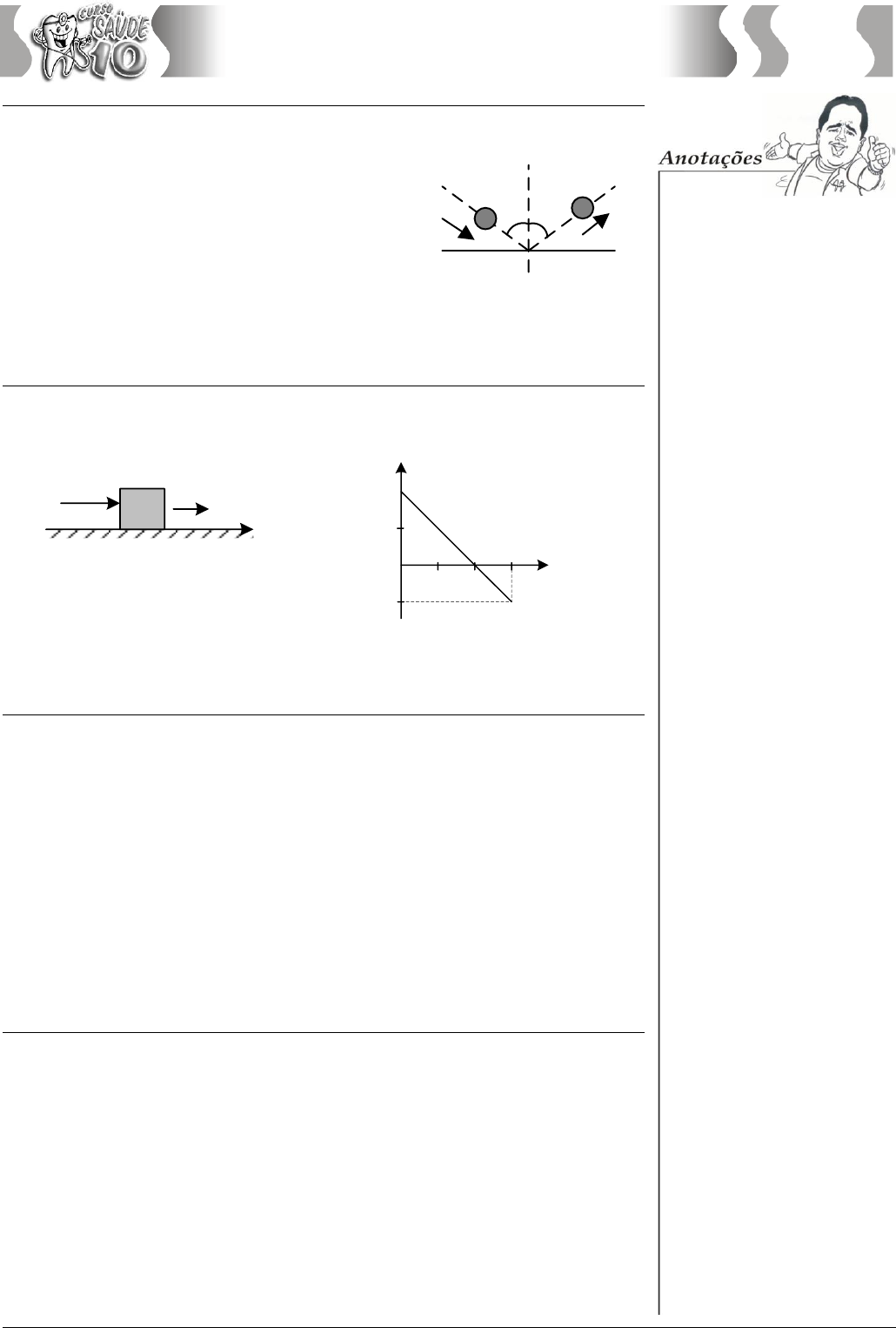 Física Simétrico Pré-Universitário – Há 25 anos ensinando com excelência os estudantes cearenses – www.simétrico.com.br 189 Questão 20 Uma bola de tênis, movendo-se a 40 m/s, colide elasticamente com uma superfície horizontal lisa. Se a massa da bola vale 50 g e = 36, a força média que age na bola, durante o impacto de 0,2 s de duração, vale: ( sen 36 = 0,6 , cos 36 = 0,8) a) 6 N b) 8N c) 12 N d) 24 N e) 16N Questão 21 Um bloco de massa m = 2 kg desliza sobre uma superfície horizontal sob ação de uma força resultante horizontal F cuja intensidade é dada pelo gráfico F x t abaixo. Sabendo que a velocidade inicial da caixa (t = 0 s) vale Vo = 3 m/s, determine a sua velocidade no instante t = 6 s. F Vo F(N) t(s)2 4 6 0 40 20 0 -20 Questão 22 Uma caixa A de massa 6 kg se move com velocidade 40 m/s sobre o eixo x indo ao encontro de uma caixa B de massa 4 kg que se move em sentido contrário com velocidade 20 m/s. O prof. Renato Brito pede que você determine a velocidade do centro de massa desse sistema após a colisão: a) 10 m/s b) 12 m/s c) 16 m/s d) Não pode ser determinado sem conhecer o coeficiente de restituição da colisão Questão 23 Uma caixa A de massa 3m se move com velocidade v sobre o eixo x indo ao encontro de uma caixa B de massa 2m que se move sobre o eixo y (do mesmo sistema cartesiano) com velocidade 2v. O prof. Renato Brito pede que você determine a velocidade do centro de massa desse sistema após a colisão elástica entre as caixas: a) v/2 b) v c) 2v/3 d) 3v/4 V V Física Simétrico Pré-Universitário – Há 25 anos ensinando com excelência os estudantes cearenses – www.simétrico.com.br 190 Pensando em Casa Pensando em Casa ATENÇÃO: É absolutamente necessário ler a teoria desse capítulo antes de resolver as questões referentes a ele. As questões que se seguem não são mera aplicação de fórmulas, requerem uma real compreensão dos aspectos teóricos do assunto. Se você não leu TODA A TEORIA relativa a esse capítulo, NÃO INICIE A TAREFA DE CASA AGORA. Questão 01 (Fuvest-SP) Uma quantidade de barro de massa 2 kg é atirada de uma altura de h = 0,45 m, com uma velocidade horizontal v = 4 m/s, em direção a um caminho parado, de massa igual a 6 kg, como mostra a figura. Se todo o barro ficar grudado no carrinho no instante em que o atingir, o carrinho iniciará um movimento com velocidade, em m/s, igual a: a) 3/4 b) 1 c) 5/4 d) 2 e) 3 h v Dica: veja questão 1 de classe Questão 02 - O prof Renato Brito conta que um caminhão carregado e um pequeno automóvel movem-se ambos com a mesma quantidade de movimento. Sobre esse movimento, considere as afirmativas a seguir: I - A velocidade do automóvel é maior que a do caminhão; II - O impulso que deve ser aplicado para frear o caminhão é maior que o impulso que deve ser aplicado para fazer parar o automóvel; III- Se ambos são freados (até parar) por meio de forças de mesma intensidade, o caminhão leva mais tempo até parar completamente que o carro; IV- Se ambos são freados (até parar) por meio de forças de mesma intensidade, a distância percorrida pelo caminhão será maior do que a percorrida pelo automóvel durante a frenagem. Pode-se afirmar que: a) apenas I é verdadeira; b) apenas I e II são verdadeiras; c) apenas I e III são verdadeiras; d) apenas II e IV são verdadeiras; Questão 03 A figura mostra um carinho de madeira de massa m que se move com velocidade v sobre um solo horizontal liso, carregando um bloco de ferro de massa 2m. Subitamente, ao passar por um eletroímã fixo ao teto, o bloco de ferro é abruptamente retirado de cima do carrinho. ferro ferro V Assim, após essa brusca remoção, o carrinho passa a se mover com velocidade: a) 3v/2 b) 2v/3 c) 3v d) 2v e) v Dica: veja questão 3 de classe Questão 04 A figura mostra um carinho de madeira de massa m que se move com velocidade v sobre um solo horizontal liso quando, de repente, o eletroímã deixa cair verticalmente, sobre o carrinho, um bloco de ferro de massa 2m, que adere ao carrinho (devido ao atrito entre eles) que prossegue em movimento uniforme. ferro ferro V antes depois A velocidade final do conjunto carro+bloco, na situação final, vale: a) 3v/2 b) 2v/3 c) 3v d) 2v e) v /3 Dica: veja questão 2 de classe Questão 05 Um carrinho de massa M carrega pendurada uma bola de mesma massa M, conforme a figura a seguir. O conjunto (carrinho+bola) se move com velocidade constante V sobre um plano horizontal sem atrito. Em dado instante, o fio que sustenta a bola se rompe. A velocidade do carrinho, a partir de então, será: a) (1/2)V. b) V. c) 2V. d) –V. e) – V / 2 M M v Dica: veja questão 3 de classe Questão 06 - (CESGRANRIO-RJ) Um carrinho de massa M = 3 kg move-se em linha reta sobre um piso horizontal sem atrito. A velocidade do carrinho é de 6 m/s. Sobre o carrinho, encontra-se fixada uma mola que é comprimida por um objeto de massa m = 0,50kg. Inicialmente, tal objeto se desloca solidário ao carrinho, atado ao mesmo por um fio. Em um instante, o fio é rompido e a mola empurra o objeto para trás, projetando-o, horizontalmente, para fora do carrinho com uma velocidade de 6 m/s em relação ao piso. Física Simétrico Pré-Universitário – Há 25 anos ensinando com excelência os estudantes cearenses – www.simétrico.com.br 191 Uma vez livre do objeto de massa m, qual a velocidade do carrinho? a) 6 m/s b) 8 m/s c) 10 m/s d) 12m/s e) 14m/s Questão 07 (Cefet 2005 1ª Fase) Um carrinho de massa M, contém uma massa m0 de água e se movimenta com velocidade constante V , sobre um plano horizontal sem atrito. Num instante t = 0s, a água contida no carrinho começa a vazar através de um furo na sua base. A partir desse instante, o módulo da velocidade do carrinho em função do tempo é mais bem representado pelo gráfico: a) b) c) d) Dica: veja questão 5 de classe Questão 08 - Um projétil de massa M incide sobre um bloco de madeira de massa 9M suspenso ao teto por duas c