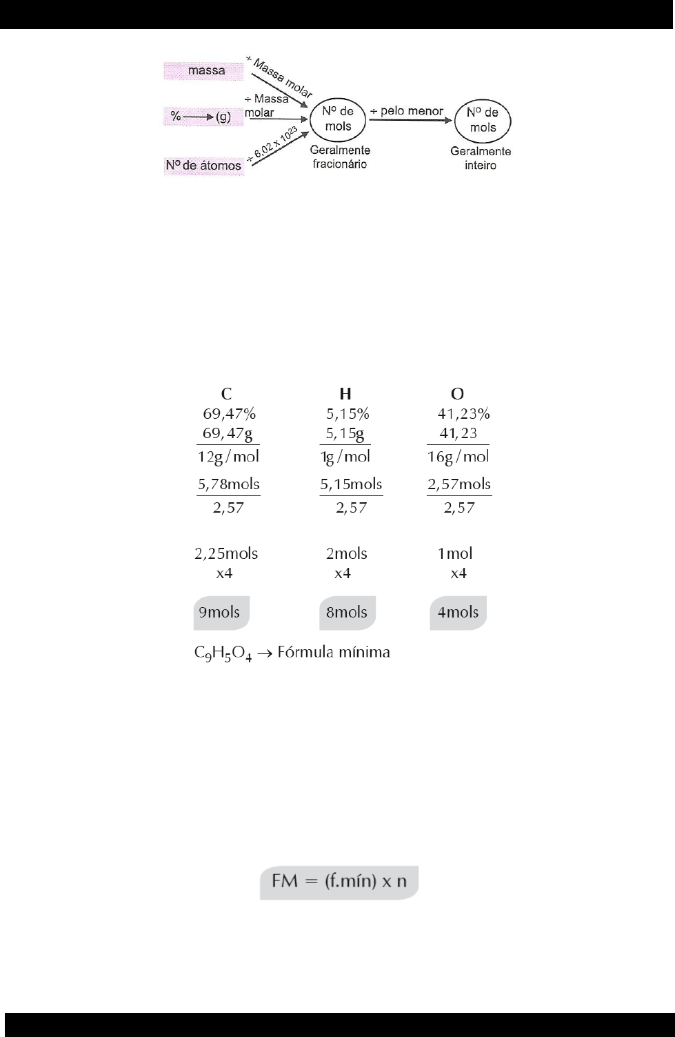 11 www.cursoanualdequimica.com – e-mail: cursodequimica@gmail.com II. dividir os dados obtidos em (I) pelo menor deles. Esta operação indica o índice do elemento na fórmula mínima. III. Caso um dos números não seja inteiro, multiplique todos por um menor número, de modo que se obtenha números inteiros. Exemplo 2: A análise de um determinado composto determinou que a sua composição centesimal é: 69,47% de “C”, 5,15% de “H” e 41,23% de “O”. Qual a sua fórmula mínima? 7. Fórmula molecular (F.M) A fórmula molecular de um composto é muito mais importante que a sua fórmula mínima, pois a fórmula molecular indica: • Os elementos formadores da substância; • O número exato de átomos de cada elemento na molécula do composto. A fórmula molecular de um composto é múltiplo da sua fórmula mínima. Onde “n” é um número inteiro que indica quantas vezes a fórmula mínima está contida na fórmula molecular. 12 www.cursoanualdequimica.com – e-mail: cursodequimica@gmail.com Exemplo 3: Um determinado hidrocarboneto apresenta 85,71% de C e 14,29% de H em massa. Sabendo que a massa molecular do hidrocarboneto é 42, determine sua fórmula mínima e a sua fórmula molecular. Dados: (C = 12u; H = 1 u) Cálculo da fórmula mínima: Desta forma a fórmula molecular é: (CH2)x3 = C3H6. 8. Cálculo da percentagem de carbono, hidrogênio e oxigênio a partir de uma dada massa do composto orgânico Em uma análise quantitativa dificilmente um composto é separado completamente em seus elementos, embora nossos exemplos possam ter levado você a pensar que isto acontece. Ao invés disso, o composto é transformado em outros compostos. As reações separam os elementos capturando cada um deles inteiramente (em termos quantitativos) em um composto separado cuja fórmula é conhecida. No exemplo a seguir ilustramos uma análise indireta de uma substância constituída exclusivamente por carbono, hidrogênio e oxigênio. Tais compostos queimam completamente na presença de oxigênio puro — uma reação denominada combustão — e os únicos produtos resultantes são dióxido de carbono e água. (Esta modalidade particular de análise indireta é algumas vezes chamada análise por combustão.) A combustão completa de álcool metílico (CH3OH), por exemplo, é representada pela seguinte equação. 2CH3OH + 3O2 → 2CO2 + 4H2O O dióxido de carbono e a água podem ser separados e suas massas podem ser medidas. Note que todos os átomos de carbono do composto original estão agora nas moléculas de CO2 e todos os átomos de hidrogênio estão nas moléculas de H2O. Deste modo, pelo menos dois entre os elementos originais, CH, estão totalmente separados. Calcularemos a massa de carbono no CO2 recolhido, que é idêntica à massa do carbono na amostra original. De modo semelhante, calcularemos a massa de hidrogênio na H2O recolhida, que é igual à massa de hidrogênio na amostra inicial. Quando adicionadas, as massas de C e H são menores que a massa total da amostra, pois parte desta é composta por oxigênio. Subtraindo a 13 www.cursoanualdequimica.com – e-mail: cursodequimica@gmail.com soma das massas de C e H da massa total da amostra, obtemos a massa de oxigênio na quantidade dada do composto. Procedimento: I. Efetua-se a combustão completa do composto. Os produtos resultantes são CO2 e H2O. II. Relacionar as massas de “C” com CO2 e “H” com H2O. • Todo “C” do CO2 se encontrava no composto orgânico. • Todo “H” do H2O se encontrava no composto orgânico. III. Determina-se as massas de “C” e de “H” no composto orgânico. IV. Calcular as percentagens de “C” e “H”. A% de oxigênio é encontrado subtraindo-se de 100 as duas percentagens de “C” e de “H”. Exemplo 4 Uma amostra de 4,24mg de ácido acético (CH3COOH) sofre uma combustão completa e produz 6,21mg de CO2 e 2,54mg H2O. Determine a composição centesimal do ácido acético. Dados: C = 12u; H = 1u; O = 16u Solução: • Combustão completa do composto. CH3COOH + 2O2 2CO2 + 2H2O • Todo “C” do CO2 se encontrava no composto orgânico. CO2 C 44g ––––––––––––– 12g 6,21mg –––––––––– x Todo “H” do H2O se encontrava no composto orgânico. H2O 2H 18g –––––––––––––– 2g 2,54mg –––––––– y No composto orgânico existem 1,69mg de C e 0,28mg de H. • Cálculo da percentagem de C, H e O: % de O = 100% - (39,9% + 6,72%) = 53,4% O cálculo da percentagem de oxigênio poderia ter sido feito calculando-se a massa de oxigênio no composto orgânico: m(O) = 4,24mg – (m(C) + m(H)) 4,24mg -------------- 100% 1,69 mg ----------------X% X = 39,9% % de C 4,24mg -------------- 100% 0,29 mg ----------------y% y = 6,7% % de H 14 www.cursoanualdequimica.com – e-mail: cursodequimica@gmail.com m(O) = 4,24mg – (1,69 mg + 0,28 mg) m(O) = 2,27g de O Observação: Fórmula centesimal = C39,9% H6,7% O53,4%. 15 www.cursoanualdequimica.com – e-mail: cursodequimica@gmail.com CÁLCULOS QUÍMICOS E CÁLCULOS DE FÓRMULAS Exercícios de Aprendizagem 01. Sabendo que a massa atômica da prata é igual a 108u, podemos afirmar que um átomo de prata pesa: I. 108g. II. 108u. III. 108 vezes mais que o átomo de 12C. IV. 108 vezes mais que 1/12 do átomo de 12C. V. 9 vezes mais que um átomo de 12C. Estão corretas somente as afirmações: a) I, III e V b) II, III e V c) II, IV e V d) II e IV e) I 02. Considere as seguintes afirmações relativas ao isótopo 39K: I. Um átomo de 39K pesa aproximadamente 39g. II. Um átomo de 39K tem massa atômica aproximadamente igual a 39u. III. Um átomo de 39K tem massa aproximadamente 39 vezes maior que a massa do átomo de 12C. IV. Um átomo de 39K tem massa aproximadamente igual a 3,25 vezes a massa de um átomo de 12C. V. 12 átomos de 39K tem massa aproximadamente igual à de 39 átomos de 12C. Estão corretas somente as afirmações: a) II, IV e V b) II e IV c