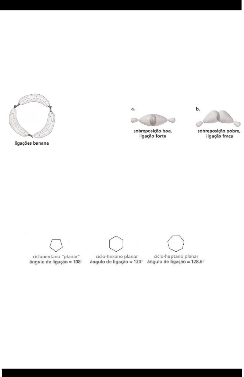 211 www.cursoanualdequimica.com.br e-mail: alexandrequimica.ce@gmail.com ângulo de ligação de um ângulo ideal causa uma tensão chamada tensão angular. A tensão angular em um anel de três membros pode ser observada ao se olhar para a sobreposição dos orbitais para formar as ligações no ciclopropano. Ligações normais são formadas pela sobreposição de dois orbitais Sp3 que apontam diretamente um para o outro. No ciclopropano, a sobreposição dos orbitais não pode ser apontada diretamente um para o outro. Portanto, ela é menos efetiva do que uma ligação C-C normal. Como os orbitais ligantes C-C no ciclopropano não podem apontar diretamente um para o outro, eles têm um formato que lembra uma banana e, consequentemente, são algumas vezes chamados ligações banana. Em adição à tensão angular, anéis de três membros também possuem tensão torsional porque todas as ligações C-H adjacentes estão eclipsadas. Os ângulos de ligação em um ciclobutano planar teriam de ser comprimidos de 109,5° para 90°, o ângulo associado com um anel planar de quatro membros. Seria esperado que o ciclobutano planar tivesse menos tensão angular que o ciclopropano porque os ângulos de ligação no ciclobutano estão distantes apenas 19,5° do ângulo de ligação ideal. (a) sobreposição de orbitais Sp3 em uma ligação normal. (b) Sobre posição de orbitais sp3 no ciclopropano. Baeyer previu que o ciclopentano seria o mais estável dos cicloalcanos porque os ângulos de ligação (l08°) são próximos do ângulo tetraédrico ideal. Ele previu que o ciclo-hexano, com ângulos de 120°, seria menos estável e que o aumento do número de lados em cicloa1canos diminuiria a estabilidade. Ao contrário do que Bayer previu, o ciclo-hexano é mais estável que o ciclopentano; além disso, substâncias não se tornam cada vez menos estáveis quando o número de lados aumenta. O erro que Baeyer cometeu foi presumir que todas as moléculas cíclicas são planares. Como três pontos definem um plano, os carbonos do ciclopropano devem estar no plano. Os outros cicloa1canos, entretanto, não são planares. Substâncias cíclicas se torcem e se curvam a fim de obter uma estrutura que minimize os três tipos diferentes de tensão que podem desestabiJizar uma substância cíclica: 1. Tensão angular é a tensão induzida em uma molécula quando os ângulos de ligação são diferentes do ângulo de ligação tetraédrico ideal de 109,5°. 2. Tensão torsional é causada pela repulsão entre os elétrons ligantes de um substituinte e os elétrons ligantes de um substituinte próximo. 3. Tensão estérica é causada por átomos ou grupos de átomos muito aproximados uns dos outros. Embora o ciclobutano planar tivesse menos tensão angular que o ciclopropano, ele poderia ter maior tensão torsional porque possui oito pares de hidrogênios eclipsados, comparado com os seis pares do ciclopropano. Assim, o ciclobutano não é uma molécula planar - é uma molécula inclinada. Um de seus grupos metileno é inclinado a um ângulo em torno de 25° fora do plano definido pelos outros três átomos de carbono. Isso aumenta a tensão angular, mas o aumento é compensado pelo decréscimo da tensão torsional como resultado de os hidrogênios adjacentes não estarem eclipsados como estariam se estivessem em um anel planar. Se o ciclopentano fosse planar, como Baeyer tinha previsto, ele essencialmente não teria tensão angular, mas dez pares de hidrogênios eclipsados estariam sujeitos a tensão torsional considerável. O ciclopentano dobra, permitindo que os 212 www.cursoanualdequimica.com.br e-mail: alexandrequimica.ce@gmail.com hidrogênios fiquem quase em oposição. No processo, entretanto, ele adquire alguma tensão angular. A forma dobrada do ciclopentano é chamada forma de envelope porque seu formato lembra um envelope retangular com a aba levantada. Representações do ciclopentano 6.5. Conformações do Ciclo-hexano Os ciclo-hexanos substituídos são os ciclo-alcanos mais comuns na natureza. Um grande número de compostos, incluindo muitos agentes farmacêuticos importantes, contém anéis de ciclo-hexano. Ao contrário da concepção de Baeyer, o ciclo-hexano não é plano, e ocorre em conformações tridimensionais que não têm tensão. Os ângulos C – C – C do ciclo-hexano podem assumir a configuração do tetraedro livre de tensão, se o anel adotar a conformação em cadeira, assim chamada devido à sua semelhança com uma espreguiçadeira — um encosto, um assento e um descanso para as pernas. Olhando qualquer ligação carbono- carbono na projeção de Newman, é fácil verificar que o ciclo-hexano na conformação em cadeira não possui tensão de torção: todas as ligações C – H adjacentes estão em oposição. Conformação em cadeira, livre de tensão, do ciclo-hexano. Todos os ângulos de ligação C – C – C são iguais a 111,5º (próximos ao valor ideal de 109,5º do tetraedro) e todas as ligações adjacentes C – H estão em oposição. É importante lembrar que, quando se desenha o ciclo-hexano em cadeira, as ligações inferiores estão na frente e as superiores atrás. 213 www.cursoanualdequimica.com.br e-mail: alexandrequimica.ce@gmail.com 1. Desenhe duas linhas paralelas inclinadas para baixo e levemente afastadas uma da outra. Isto representa quatro dois seis átomos de carbono do ciclo-hexano em um plano. 1. Posicione um quinto átomo de carbono acima e à direita do plano dos outros quatro e completa as ligações. 2. Posicione o sexto átomo de carbono abaixo e à esquerda do plano dos quatro e complete as ligações. Repare que as ligações do átomo de carbono inferior são paralelas às ligações do carbono elevado. Como desenhar a conformação em cadeira do ciclo-hexano. 6.6. Ligações Axiais e Equatoriais no Ciclo-hexano A conformação em cadeira do ciclo-hexano tem muitas consequências. Veremos que o comportamento químico de muitos ciclo-he