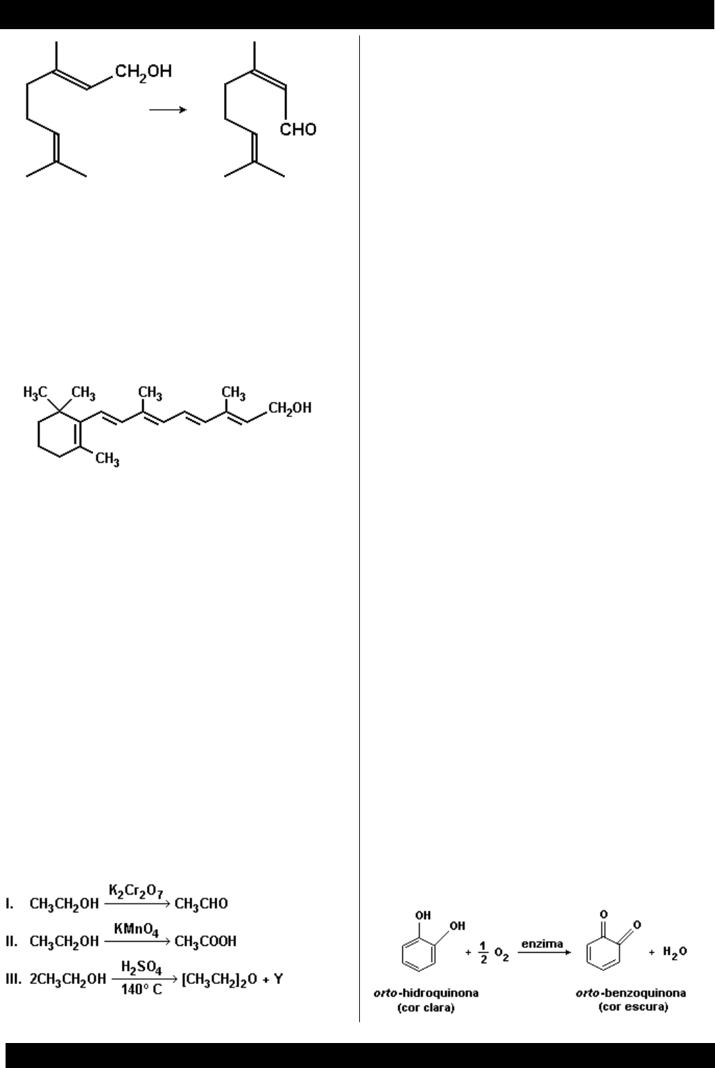 133 www.cursoanualdequimica.com – e-mail: cursodequimica@gmail.com Nesse processo, ocorre a) somente tautomerização. b) redução de um ácido carboxílico para aldeído. c) isomerização entre isômeros geométricos. d) oxidação de um álcool para aldeído. e) somente adição de hidrogênios. 16. (Ufu) O retinol ou vitamina A, cuja estrutura é mostrada abaixo, desempenha um importante papel no nosso organismo, pois favorece a visão, o crescimento e participa ativamente do metabolismo de diversos hormônios. Dentre os reagentes químicos abaixo, aquele que NÃO reage com o retinol é a) solução aquosa de permanganato de potássio (KMnO4). b) ácido sulfúrico concentrado (H2SO4). c) solução aquosa de hidróxido de sódio (NaOH). d) solução de bromo (Br2) em tetracloreto de carbono (CCl4). 17. (Ufv) A reação de oxidação de um álcool de fórmula molecular C5H12O com KMnO4 forneceu um composto de fórmula molecular C5H10O. Assinale a opção que apresenta a correlação CORRETA entre o nome do álcool e o nome do produto formado. a) 3-metilbutan-2-ol, 3-metilbutanal b) pentan-3-ol, pentan-3-ona c) pentan-1-ol, pentan-1-ona d) pentan-2-ol, pentanal e) 2-metilbutan-1-ol, 2-metilbutan-1-ona 18. (Unesp) Os esquemas a seguir representam as condições em que ocorrem algumas reações com o etanol e que conduzem à formação de produtos distintos. a) Os esquemas I e II representam reações de oxidação do etanol. Para cada uma delas, escreva o nome do produto e o nome da respectiva função orgânica. b) Na reação III, são formados dois produtos, um orgânico e outro inorgânico, identificado por Y. Forneça os nomes desses dois compostos. 19. (Pucsp ) Em dois balões distintos, as substâncias A e B foram colocadas em contato com dicromato de potássio (K2Cr2O7) em meio ácido, à temperatura ambiente. Nessas condições, o dicromato é um oxidante brando. No balão contendo a substância A foi observada a formação do ácido propiônico (ácido propanóico), enquanto que no balão que continha a substância B formou-se acetona (propanona). As substâncias A e B são, respectivamente, a) ácido acético e etanal. b) propanal e 2-propanol. c) butano e metil-propano. d) propanal e 1-propanol. e) propano e propanal. 20. (Ufes) A reação da butanona com LiAlH4 (um redutor muito forte) leva à formação de isômeros, que se distinguem um do outro por apresentarem a) diferentes solubilidades em água. b) diferentes pontos de fusão. c) diferentes pontos de ebulição (P=1 atm). d) diferentes densidades. e) diferentes desvios do plano da luz polarizada. 21. (Ufmg) Os bafômetros mais simples são pequenos tubos descartáveis com uma mistura que contém ânions dicromato (de cor amarelo-alaranjada) em meio ácido. A detecção da embriaguez é visual, pois a reação do dicromato com o álcool leva à formação do cátion Cr3+ (de cor verde). Essa reação pode ser representada simplificadamente por Cr2O72-(aq)+3CH3CH2OH(g)+8H+(aq) 2Cr3+(aq)+7H2O(l)+3CH3CHO(aq) Sobre essa reação, assinale a alternativa FALSA. a) O dicromato age como oxidante na reação. b) O álcool é oxidado a ácido carboxílico. c) O pH do sistema aumenta devido à reação. d) O número de oxidação inicial do cromo é +6. 22. (Ufmg) Certas frutas - a banana e a maçã, por exemplo - escurecem em contato com o ar, quando são descascadas. Isso ocorre devido à conversão da substância orto-hidroquinona em orto-benzoquinona, catalisada por uma enzima. 134 www.cursoanualdequimica.com – e-mail: cursodequimica@gmail.com Considerando-se essas substâncias e suas moléculas, é INCORRETO afirmar que a) a orto-hidroquinona apresenta duas hidroxilas fenólicas. b) a orto-benzoquinona apresenta duas carbonilas em suas moléculas. c) a orto-benzoquinona apresenta moléculas saturadas. d) a orto-hidroquinona sofre oxidação na conversão apresentada. 23. (Unesp) Se uma garrafa contendo vinho permanecer aberta, exposta ao ar, por alguns dias, o álcool etílico presente será oxidado, transformando o vinho em vinagre - uma solução de ácido etanóico (também denominado ácido acético). A equação química que representa esta reação é: 24. (Ufsm 2014) As lavouras brasileiras são sinônimo de alimentos que vão parar nas mesas das famílias brasileiras e do exterior. Cada vez mais, no entanto, com o avanço da tecnologia química, a produção agropecuária tem sido vista também como fonte de biomassa que pode substituir o petróleo como matéria- prima para diversos produtos, tais como etanol, biogás, biodiesel, bioquerosene, substâncias aromáticas, biopesticidas, polímeros e adesivos. Por exemplo, a hidrólise ácida da celulose de plantas e materiais residuais resulta na produção de hidroximetilfurfural e furfural. Esses produtos são utilizados na geração de outros insumos, também de alto valor agregado, usados na indústria química. O esquema de reações mostra a transformação da celulose no álcool furílico e a conversão deste em outros derivados. Observando o esquema de reações, é correto afirmar que a transformação de 1 em 2 e a de 2 em 3 envolvem, respectivamente, reações de a) hidrólise e oxidação. b) redução e oxidação. c) oxidação e oxidação. d) redução e hidrólise. e) redução e redução. 25. (Cefet MG 2014) Os álcoois, quando reagem com permanganato de potássio, em meio ácido e com aquecimento, podem ser oxidados a aldeídos, cetonas ou ácidos carboxílicos. O álcool que, submetido às condições citadas, NÃO é capaz de reagir é o a) etanol. b) butan-2-ol. c) cicloexanol. d) 2-metil-propan-2-ol. e) 2-metil-pent-1-en-3-ol. 26. (Pucrj 2013) Considere a substância a seguir sofrendo oxidação na presença de uma solução diluída de permanganato de potássio (KMnO4) em meio levemente alcalino. Nestas condições, o produto orgânico da reação é: a) b) c) d) e) 27. (Mackenzie 2013) A palavra vinagre vem do latim vinum, “vinho”, e ac