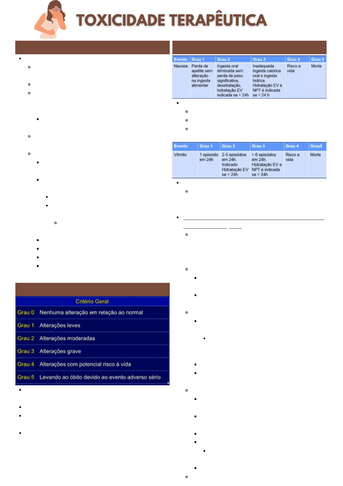 EFEITOS COLATERAIS DA QUIMIOTERAPIA: Toda droga tem toxicidade, mas variam a intensidade Depende de cada droga (perfil de toxicidade) Uma forma de buscar diminuir a toxicidade é pelo ajuste de dose: Reduz 10% > 20% > até 25% da dose pode ser reduzida > troca o esquema Se reduzir mais 25% prejudica a eficácia da droga Quando se prescreve inicialmente é padrão, mas pode ajustar individualmente EFEITOS MAIS COMUNS: Náuseas e vômitos [mais conhecido junto com alopécia] Alopecia [mais conhecido junto com náuseas e vômitos] Nem toda quimioterapia dá alopecia Existe a CRIOTERAPIA para tentar diminuir a queda de cabelo com uma touca Contraindicada na Oxaliplatina! pois tem neuropatia que é desencadeada pelo frio Mielotoxicidade (Neutropenia febril) Mucosite Diarreia Toxicidades pulmonares, cardíaca, renal, cutânea e neural INTRODUÇÃO Grau 1: em geral, não precisa mudar a dose, só fazer medidas de suporte Grau 2 a 3: ajustar a dose Se for Grau 3 importante ou Grau 4: muitas vezes tem que suspender a medicação e modificar o tratamento Grau 0 e Grau 5 é mais em pesquisa clínica GRAU DE TOXICIDADE NÁUSEAS Pouco risco de vida associado Grau 4 é raro Grau 3 é quando interfere na ingesta calórica e hídrica -> nutrição parenteral NÁUSEAS E VOMITOS VÔMITOS A NPT no Grau 3 espera pra fazer se os vômitos persistirem > 24h, pois a nutrição parenteral (NPT) também tem suas complicações NÁUSEAS E VÔMITOS INDUZIDOS POR QUIMIOTERAPIA (NVIQ) Presença de náuseas e vômitos manifestados logo antes, durante ou até 5 dias após a QT, sem ter outra causa identificável (como o tumor ou outras patologias) EPIDEMIOLOGIA: Sem profilaxia, 80% dos pacientes vão ter náuseas e vômitos Influencia negativamente na qualidade de vida do paciente CLASSIFICAÇÃO ANTECIPATÓRIA: No mesmo dia, porém antes da QT EX: Paciente que já fez QT e já sofreu NVIQ e, emocionalmente, inicia o quadro antes mesmo da quimio AGUDA: Durante e até 24 horas após TARDIA: Após 24 horas até 5 dias após o tratamento DESCARTAR OUTRAS ETIOLOGIAS MEDICAÇÕES DE SUPORTE: Como as para dor (tramadol, codeína, morfina, opioides fortes) RADIOTERAPIA: Principalmente em região epigástrica CIRURGIA INFILTRAÇÃO/METÁSTASE DO SNC O 1º sintoma de metástases do SNC podem ser náuseas e vômitos PROGRESSÃO TUMORAL FISIOPATOLOGIA: NÁUSEA: Regulada pelo SNC VÔMITO: Existe o centro do vômito (localizado na porção dorsolateral da formação reticular ao lado do centro coordenador da respiração) Pode ser acionado por: Zona de gatilho quimiorreceptora Córtex cerebral Sistema límbico Sistema vestibular TGI através de via vagal e dos nervos do sistema periférico. MECANISMOS: ANTECIPATORIAS: Disparadas pelo córtex cerebral, com caráter emocional AGUDAS: Mediadas PELA SEROTONINA liberada pelas células enterocromafins do TGI, ativando a zona de gatilho quimiorreceptora TARDIAS: Mesmo mecanismo das agudas, somadas a liberação de neurocinina MEDICAMENTOS ATUAIS: Os antieméticos atuais agem tanto na serotonina como na neurocinina, sendo mais eficiente - drogas de ação central Antigamente as drogas não eram tão eficazes - metoclopramida (plasil) e difenidramina FATORES DE RISCO: Sexo feminino Idade menor que 50 anos Ausência de consumo etílico e/ou de tabaco prévio Sensibilidade à náusea vestibular Episódios prévios de náuseas e vômitos por QT Os primordiais: Potencial emetogênico da própria droga Dose do QT Combinação de drogas MEDIDAS PREVENTIVAS: Dieta adequada (pouco gordurosa, fracionada, evitando longos períodos de jejum) Hidratação adequada Enfatizar importância do tratamento profilático (favorecendo adesão) MEDICAÇÕES Inibidores da 5-HT-3 (serotonina) Corticosteroides Inibidores de NK-1 (neurocinina) Benzodiazepínicos Outros INIBIDORES DA 5-HT-3: Ondansetrona (Vonau | Nausedron) Granisetrona Dolasetrona Palosetrona [só profilaxia, duração de 5 dias] VIA: Oral, Sublingual (Vonau com absorção rápida), Endovenosa CORTICOIDES Dexametasona Mecanismo Incerto USO: Profilaxia e terapêutica Muito usado INIBIDORES DA NEUROCININA Aprepitanto oral Fosaprepitanto EV Não faz como tratamento, só profilaxia para moderada a alta emetogenicidade Não tem no SUS BENZODIAZEPINICOS Uso: náusea antecipatória OUTROS: ÍNDICE TERAPEUTICO RUIM: Metoclopramida (Plasil)| Escopolamina (Buscopam) | Difenidramida (Dramin) Muitos efeitos extrapiramidais. POTENCIAL EMETOGÊNICO DOS QT INCIDENCIA: Sem fazer nada, vão ter náusea e vômito AC: DOXORRUBICINA + CICLOFOSFAMIDA (QUIMIO VERMELHA) Muito usado para câncer de mama Cisplatina - usada para muitos cânceres REGIMES ANTIEMÉTICOS PARA PROFILAXIA DE NVIQ: ALTO: Faz os três juntos (corticoide, inibidor de neurocinina e inibidor de serotonina) MODERADO: Faz dose maior de dexametasona pela ausência do fosaprepitanto + inibidor de serotonina Mais usado na realidade do SUS: Pela ausência do inibidor da neurocinina no SUS REGIME DE MÚLTIPLOS DIAS DE APLICAÇÃO DO QT: DEPENDE DO REGIME: A maioria tem moderado a alto potencial emetogênico, ai repetimos a dosagem pelos dias de aplicação Pode usar Palonosetrona diariamente sem limitações TRATAMENTO DE RESGATE: INIBIDOR DE SEROTONINA VO (por conta do vômito melhor IV) OU IV POR 2 DIAS + DEXAMETASONA 12 mg/D VO OU IV [FAZ MAIS EV OS DOIS]: Se melhorar com o IV, manda para casa com o VO ADJUVANTES: BZDP Metoclopramida Anti-histamínicos ATENÇÃO! Se não melhorou após 24 horas de tratamento é hora de reavaliar o diagnóstico. Será que é só toxicidade ou tem outra causa? TRATAMENTO REIDRATAÇÃO: Depende do grau de diarreia e estado geral TRO (terapia de reposição oral) e Hidratação venosa Prevenção ou tratamento de disturbio hidro- eletrolitico, principalmnete hipocalemia Orientações dietéticas Medicamentos OPIOIDES COMO LOPERAMIDA (IMOSEC): AÇÃO: Atividade local na mucosa colônica e mínima absorção | Reduz o volume fecal, o peristaltismo, a urgência e a incontinência