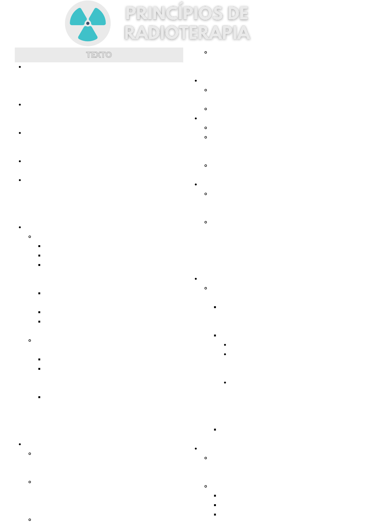 TEXTOTEXTO Utilizando-se de diferentes técnicas, a radioterapia consiste em administrar uma dose de radiação a um volume definido, chamado volume-alvo, tentando poupar ao máximo os tecidos normais ao seu redor. Empregada tanto em doenças benignas como em doenças malignas, de forma exclusiva ou associada à cirurgia e/ou À quimioterapia. É indicada a 2 em cada 3 pacientes oncológicos, traduzindo seus resultados na erradicação do tumor, em melhor qualidade de vida, ou no aumento das taxas de sobrevida. A medida da dose é expressa em Gray (1 Gray ou Gy, equivale a 1 Joule por Kg) A depender da quantidade de energia, quando a radiação é absorvida, ela pode provocar excitação dos elétrons do meio ou mesmo arrancá-los (deslocá-los) de sua camada orbital, causando uma ionização, processo essencial para a ocorrência dos efeitos biológicos da radiação. Em geral, são dois tipos: ELETROMAGNÉTICA - RAIOS-X OU GAMA Constituída basicamente por energia Constituídos por fótons Raio-X: produzido pela colisão de elétrons de grande velocidade com a matéria nos tubos de RX ou aceleradores lineares Raios - Gama: produzidos por isótopos naturais, como o cobalto - 60 Milhares de elétrons-volt (KeV) -> pele e mucosas Milhões de elétrons-volt (MeV) -> ultrapassam a pele e a poupam CORPUSCULAR - ELÉTRONS, PARTÍCULAS ALFA E BETA, PRÓTONS E NÊUTRONS) Possuem massa de repouso Elétrons -> lesões superficiais, e tem relação diretamente proporcional entre a energia do feixe e a dose entregue aos tecidos Prótons -> é depositada predominantemente a uma determinada profundidade, em virtude do chamado "pico de Bragg" que ocorre no final da trajetória, assim, poupando tecidos mais superficiais e mais profundos que o tumor. BRAQUITERAPIA Formas radioativas na forma de aplicadores especiais: agulhas, sementes ou fios são colocadas em contato direto com o volume alvo. Exemplos comuns são os implantes intersticiais e intracavitários utilizados no tto de tumores ginecológicos, da próstata, de cabeça e pescoço, entre outros. Podem ser baixa taxa de dose (dias) ou alta taxa (min) Ex.:irídio - 192 em alta dose pra tratar tumores do colo uterino; sementes de Iodo-125 em baixa dose pra tratar câncer de próstata TELETERAPIA/ RADIOTERAPIA EXTERNA Distância de cerca de 100cm da fonte emissora (ex. Cobalto e Aceleradores lineares de partículas) É a modalidade mais difundida na prática clínica ISOTOPOTERAPIA É da área da medicina nuclear, e não radioterapia Administração via venosa ou oral de isótopos radioativos que tenham tropismo pelo tecido em que se localiza o tumor Ex.: Estrôncio-89 em metástases ósseas; Iodo-125 em neoplasias de tireoide INTERAÇÃO DA RADIAÇÃO COM A MATÉRIA Direta - atingindo diretamente os componentes celulares provocando alterações estruturais. Corresponde a 30% do efeito biológico da radiação Indireta - produzindo radicais livres a partir da água intracelular. O principal radical livre é a hidroxila (OH), que pode se recombinar com outros radicais livres e reagir com moléculas orgânicas. Corresponde a 70% dos danos, pois a água ocupa parcela substancial da composição celular. DANO CELULAR Dano ao DNA - principal alvo do efeito citotóxico da radiação Quebras moleculares únicas ou duplas, que podem ou não ser reparadas, que, eventualmente levam à morte celular Se dividem em: Letais Subletais - podem ser reparados até algumas horas após a dose, exceto se novos danos forem adicionados Potencialmente letais - podem ser modificado quando certas condições de crescimento são alteradas, por exemplo, aumento da oxigenação, logo após uma única exposição à radiação Pode ter morte clonogênica (perda da capacidade de divisão) ou apoptose CICLO CELULAR A radiossensibilidade é diferente nas distintas fases do ciclo celular mitótico, sendo maior na fase de mitose e menor na fase G1. Fase G1 Pode durar tempo variado Radiorresistente Como as células tumorais têm maior turnover que as normais, G1 tumoral é menor Ou seja, se G1 é radiorresistente e as células tumorais têm G1 menor, então é mais fácil que quando a radioterapia seja feita as células tumorais estejam mais RADIOSSENSÍVEIS! OXIGÊNIO A presença de oxigênio aumenta a sensibilidade da célula aos efeitos da radiação, na medida em que ele fixa os danos causados pelos radicais livres ao DNA, impedindo o seu reparo. Nesse âmbito, no processo tumoral há uma angiogênese imperfeita, assim, o principal meio das células tumorais de adquirirem O2 é por difusão, por isso as células centrais morrem e necrosam primeiro. Desse modo, as células periféricas, que tem mais O2 são mais radiossensíveis! REPOPULAÇÃO Pela alta replicação tumoral, caso haja pausa no tratamento da radioterapia as chances de controle tumoral para uma mesma dose são diminuídas. Assim, a dose total de radiação deve ser aumentada quando o fracionamento é realizado em um período >4s O fracionamento da dose está embasado no fato de que, com este recurso, poupam-se os tecidos normais em detrimento dos tumorais, devido ao reparo do dano subletal entre as frações, que é maior nos tecidos sadios, e também devido à repopulação destas células. Concomitantemente, aumenta-se a lesão nas células tumorais em consequência da reoxigenação das células centrais, conforme ocorre a morte tumoral periférica e da redistribuição celular às fases sensíveis do ciclo. REPARO Do dano subletal, que diminui os efeitos da radiação nos tecidos normais; REDISTRIBUIÇÃO No ciclo celular das células tumorais, sincronizando as células, principalmente nas fases de maior sensibilidade G2 e M; REPOPULAÇÃO Tecidual, em determinado período de tempo; REOXIGENAÇÃO Das células em hipóxia (efeito dependente de O2) PAPEIS DA RADIOTERAPIA Curativa Fazer maior dose possível no volume tumoral, garantindo incremento na taxa de controle da doença, mas respeitando os limites máximos 