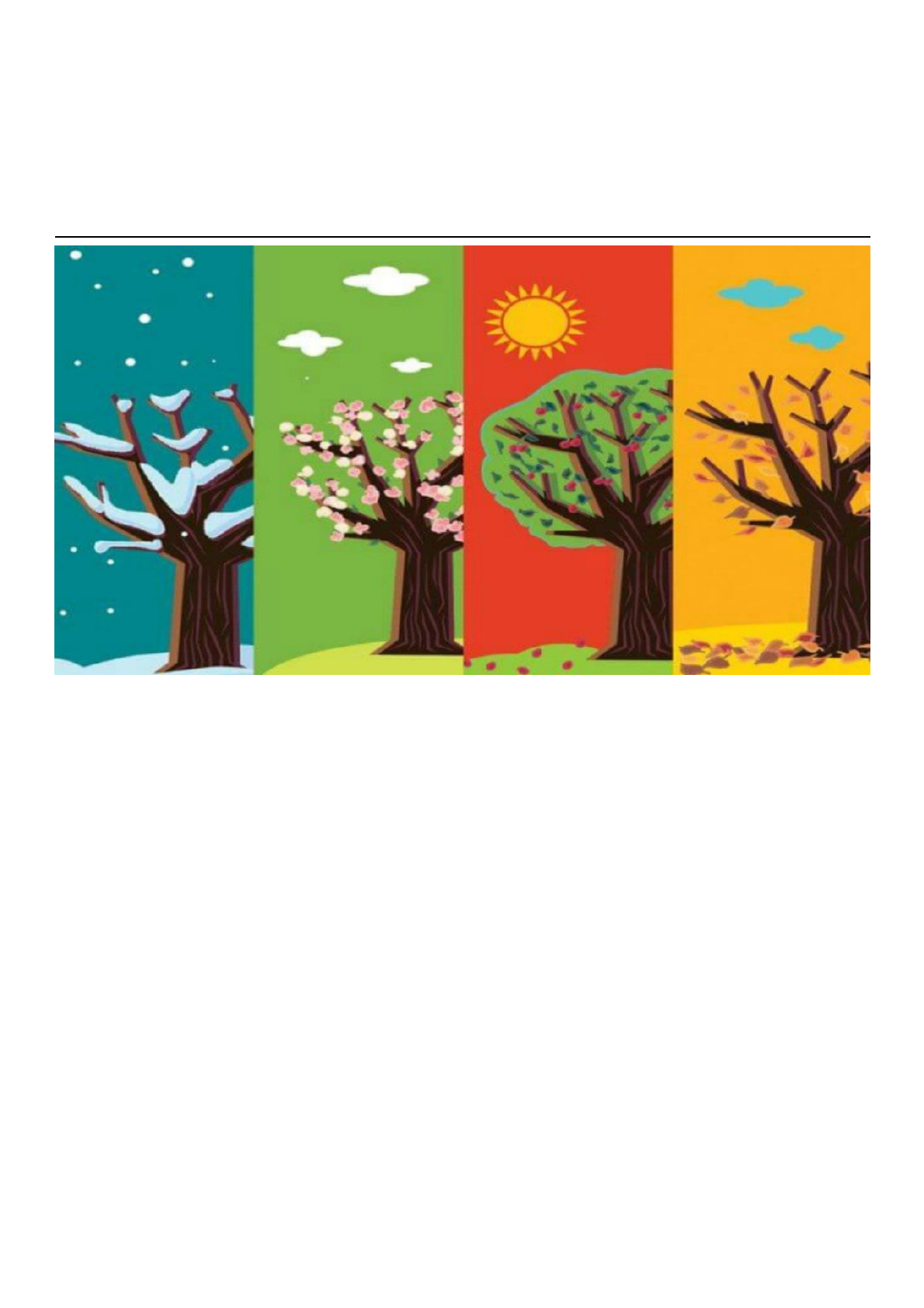 1/9 Estações do Ano (Educação Infantil) 1. As estações do ano são a primavera, verão, outono e inverno. Elas surgem por causa dos movimentos da Terra e tudo acontece de forma organizada na natureza. A nossa vida também é influenciada pelas estações do ano. Por exemplo, as férias costumam ser no verão e podemos aproveitar para brincar ao ar livre e ir à praia. Já no inverno, ficamos bem agasalhados e queremos um bom chocolate quente. Cada estação do ano apresenta paisagens e características diferentes. Vamos aprender mais sobre as estações do ano? Primavera 2/9 A primavera é um ótimo período para o contato com a natureza A primavera é a estação mais florida e colorida do ano. A temperatura é mais agradável e com o passar do tempo os dias começam a ficar maiores do que as noites. Os dias são agradáveis para passeios e contemplação da natureza. Os animais voltam a ficar ativos e as plantas ficam cheinhas de flores. No Brasil, a primavera inicia em 23 de setembro e termina em 22 de dezembro. Verão 3/9 O verão é o momento ideal para brincadeiras na praia O verão é a estação mais quente do ano, as temperaturas são altas e os dias ficam maiores do que as noites. Isso acontece porque uma parte da Terra está mais perto do Sol. Com o calor, a água evapora e, por isso, chove mais. É importante não esquecer de utilizar o protetor solar e tomar muitos líquidos nessa época do ano. Isso porque além de ser muito quente, os raios solares são bem fortes. No Brasil, o verão inicia em 21 de dezembro e dura até 20 de março. Outono 4/9 No outono as folhas das árvores ficam amareladas e caem no solo O outono é a estação que acontece depois do verão e antes do inverno. Durante o outono os dias voltam a ficar curtos e as folhas das árvores, já amareladas, começam a cair no solo. As temperaturas começam a baixar e os dias ficam mais frios. Os raios solares também ficam cada vez menos fortes e podem acontecer ventanias. No Brasil, o outono inicia entre 20 ou 21 de Março e termina entre 21 ou 22 de Junho. Porém, o outono não é percebido em todas as regiões do país. Inverno 5/9 O inverno é a estação mais fria do ano O inverno começa depois do outono e termina com o início da primavera. É a época mais fria do ano e em algumas regiões existe muita neve. Durante o inverno, uma parte da Terra é menos iluminada pelos raios solares, assim os dias ficam mais curtos e as noites mais longas. Nesse período, o clima é frio e seco, pois a umidade ar é baixa. Isso tudo pode fazer com que as pessoas fiquem mais resfriadas. No Brasil, o inverno começa no dia 21 de junho e termina no dia 23 de setembro. Estações do Ano no Brasil O Brasil é um país muito grande e a maior parte dele é localizado num lugar onde o calor é muito intenso. Mas você sabe explicar porquê? Vamos entender melhor sobre isso! Como o nosso país é imenso, há locais onde o clima pode ser diferente. Assim, você sabia que no Norte e no Nordeste o clima é bem mais quente que no Sul e Sudeste do país? No Nordeste e no Norte não encontramos o outono e a primavera. Já no Sul, o inverno é bem mais rigoroso, e há locais em que a neve e as geadas ocorrem. Atividades sobre as Estações do Ano 6/9 1. Relacione a 2.ª coluna com a 1.ª conforme os meses em que as estações do ano ocorrem 1. Primavera ( ) De março a junho 2. Verão ( ) De setembro a dezembro 3. Outono ( ) De junho a setembro 4. Inverno ( ) De dezembro a março 1. Primavera (3) De março a junho 2. Verão (1) De setembro a dezembro 3. Outono (4) De junho a setembro 4. Inverno (2) De dezembro a março 2. Observe as imagens e escreva a qual estação do ano corresponde cada uma delas. 7/9 3. Circule no poema, com lápis de cor, os nomes das estações do ano. 8/9 9/9