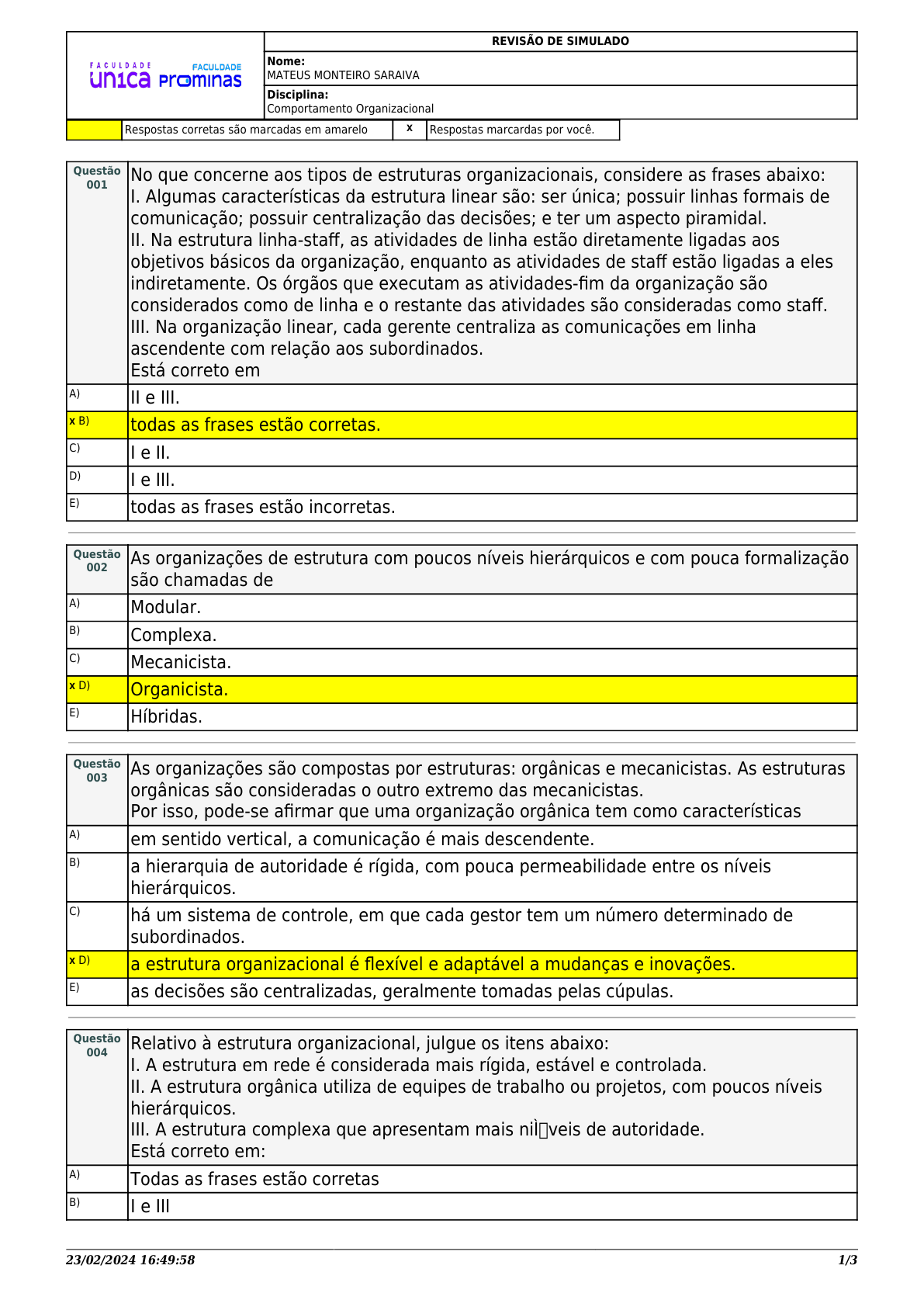 23/02/2024 16:49:58 1/3 REVISÃO DE SIMULADO Nome: MATEUS MONTEIRO SARAIVA Disciplina: Comportamento Organizacional Respostas corretas são marcadas em amarelo X Respostas marcardas por você. Questão 001 No que concerne aos tipos de estruturas organizacionais, considere as frases abaixo: I. Algumas características da estrutura linear são: ser única; possuir linhas formais de comunicação; possuir centralização das decisões; e ter um aspecto piramidal. II. Na estrutura linha-staff, as atividades de linha estão diretamente ligadas aos objetivos básicos da organização, enquanto as atividades de staff estão ligadas a eles indiretamente. Os órgãos que executam as atividades-fim da organização são considerados como de linha e o restante das atividades são consideradas como staff. III. Na organização linear, cada gerente centraliza as comunicações em linha ascendente com relação aos subordinados. Está correto em A) II e III. X B) todas as frases estão corretas. C) I e II. D) I e III. E) todas as frases estão incorretas. Questão 002 As organizações de estrutura com poucos níveis hierárquicos e com pouca formalização são chamadas de A) Modular. B) Complexa. C) Mecanicista. X D) Organicista. E) Híbridas. Questão 003 As organizações são compostas por estruturas: orgânicas e mecanicistas. As estruturas orgânicas são consideradas o outro extremo das mecanicistas. Por isso, pode-se afirmar que uma organização orgânica tem como características A) em sentido vertical, a comunicação é mais descendente. B) a hierarquia de autoridade é rígida, com pouca permeabilidade entre os níveis hierárquicos. C) há um sistema de controle, em que cada gestor tem um número determinado de subordinados. X D) a estrutura organizacional é flexível e adaptável a mudanças e inovações. E) as decisões são centralizadas, geralmente tomadas pelas cúpulas. Questão 004 Relativo à estrutura organizacional, julgue os itens abaixo: I. A estrutura em rede é considerada mais rígida, estável e controlada. II. A estrutura orgânica utiliza de equipes de trabalho ou projetos, com poucos níveis hierárquicos. III. A estrutura complexa que apresentam mais niÌ� veis de autoridade. Está correto em: A) Todas as frases estão corretas B) I e III 23/02/2024 16:49:58 2/3 X C) II e III D) Todas as frases estão incorretas E) I e II Questão 005 Na organização linear A) tende a ocorrer um inchaço nos níveis superiores da hierarquia funcional. X B) há uma dependência total do subordinado em relação ao chefe. C) a comunicação é predominantemente horizontal e informal. D) os subordinados mais pontuais são promovidos para cargos de chefia. E) as decisões são centralizadas no nível intermediário. Questão 006 O organograma é um desenho que representa uma estrutura de uma organização. Sobre essa temática, leia as frases abaixo e julgue-as: I. O organograma denota a aplicação do princípio da especialização das funções para cada tarefa. II. O organograma representa simultaneamente os diversos elementos da organização e as suas respectivas relações. III. No organograma circular, os setores de maior poder estão no topo e os com menos poder estão abaixo deles, na forma de uma pirâmide. IV. O organograma apresenta graficamente as relações funcionais, fluxos de autoridade e responsabilidade e funções organizacionais. V. O organograma é uma ferramenta na qual somente os gestores devem ter acesso, não sendo permitida a transmissão do mesmo aos membros internos. Está correto em: A) IV e V B) I e III C) II, III e V X D) I, II e IV E) Todas estão corretas Questão 007 A Teoria da Contingência considera as características do ambiente que determinam o projeto da estrutura de uma organização e os sistemas de controle. As organizações em ambientes mutantes escolhem uma estrutura A) Comportamental. X B) Orgânica. C) Mecanicista. D) Funcional. E) Tecnológica. Questão 008 Fernanda é estilista de moda e presta serviços personalizados aos seus diversos clientes. Um solicitou o desenho de uma roupa mais contemporânea, enquanto o outro, uma mais clássica. Uma terceira cliente diz que sempre sonhou em vestir um vestido desenhado por Fernanda e queria que a estilista pudesse ajudá-la a realizar esse sonho. Diante do exposto, pode-se afirmar que o trabalho de Fernanda deve ser X A) personalizado, o que prediz flexibilidade de ação dos desenhos. B) personalizado e centralizado, já que é a estilista quem detém os conhecimentos arquitetônicos. C) pouco padronizado, já que os clientes podem ter alguns interesses diferentes. 23/02/2024 16:49:58 3/3 D) altamente padronizado a fim de apresentar a mesma qualidade de serviço de moda. E) capaz de atender às necessidades de mudança, entregando o mesmo resultado aos clientes.
