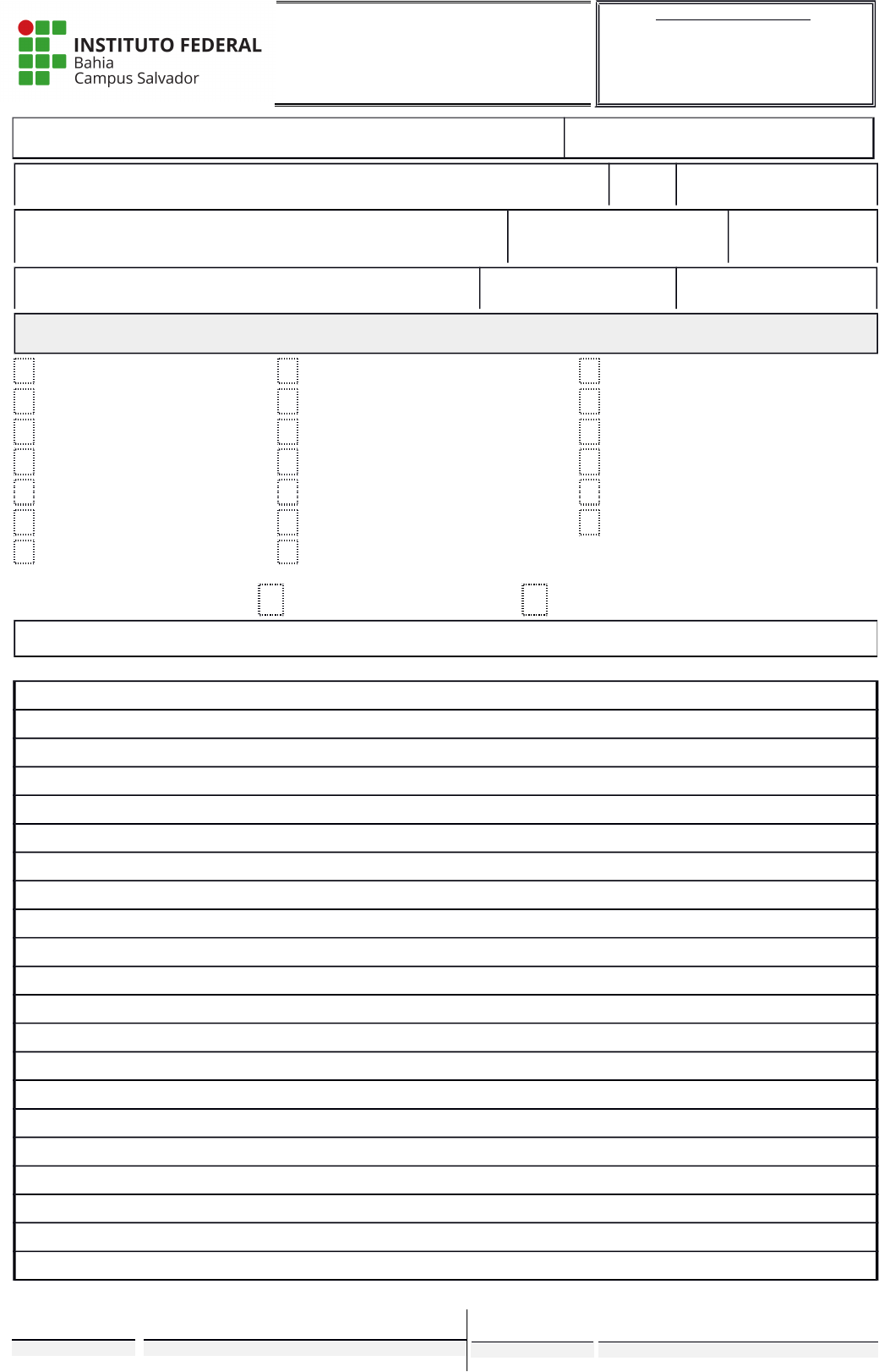 REQUERIMENTO ESCOLAR GERÊNCIA DE REGISTROS ACADÊMICOS - ENSINO SUPERIOR - RESERVADO AO PROTOCOLO DATA / / Processo nº 23279. REQUERENTE E-MAIL ENDEREÇO (Rua, Praça, Avenida) Nº FONE COMPLEMENTO (Edificio, Apartamento) BAIRRO CEP CURSO Nº MATRÍCULA CAMPUS O B J E T O D O R E Q U E R I M E N T O Antecipação de Colação de Grau Matrícula Fora do Prazo Reconsideração de despacho Aproveitamento de Disciplina Matrícula na Categoria “Especial” Reintegração à Instituição Avaliação de Relatório de Estágio Matrícula na Categoria “Ouvinte” Revisão de Prova Dispensa da Disciplina Estágio Matrícula por Transferência Externa Segunda Chamada de Prova Exercício Domiciliar Matrícula por Transferência Externa Trancamento “Parcial” de Inscrição Semestral Dispensa para Intercâmbio Acadêmico Matrícula Portador de Diploma Trancamento “Total” de Inscrição Semestral Justificativa de Falta Quebra de Pré-Requisito E X P E D I Ç ÃO D E D O C U M E N T O S Diploma ou Certificado Programa de Disciplina OUTROS ► I N F O R M A Ç Õ E S C O M P L E M E N T A R E S R E Q U E R E N T E R E C E B E D O R DATA ASSINATURA DATA ASSINATURA
