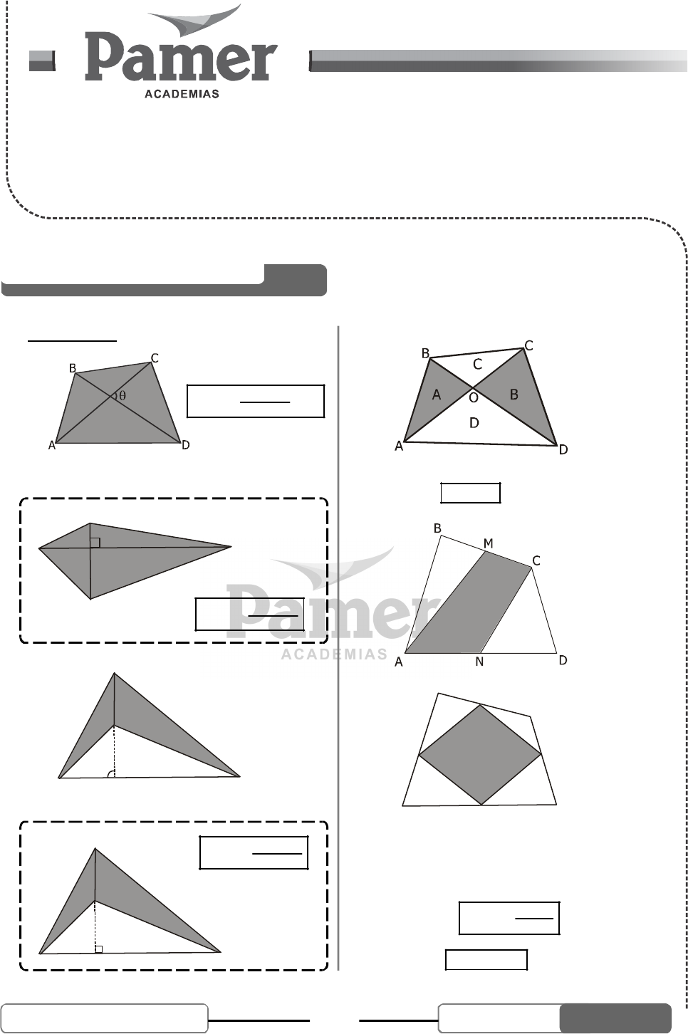 61UNI SEMESTRAL 2013 - III GEOMETRÍA TEMA 17 ÁREA DE REGIONES CUADRANGULARES GEOMETRÍA I. TEOREMAS 1. ABCD (AC)(BD)A Sen 2 Observación: A B D C ABCD (AC)(BD)A 2 2. A B D C Observación: ABCD (BD)(AC)A 2 A B D C • 3. Sean A, B, C y D las áreas de las regiones triangulares. Se cumple: A.B C.D 4. Si :BM MC AN ND 5. B N C P DQA M A D C B Si: AM = MB, BN = NC CP = PD y AQ = QD MNPQ : Paralelogramo Se cumple ABCD MNPQ AA 2 Además A B C D DESARROLLO DEL TEMA 62UNI SEMESTRAL 2013 - III GEOMETRÍA ÁREA DE REGIONES CUADRANGULARES TEMA 17 Exigimos más! II. ÁREA DE REGIONES TRAPECIALES 1. Si: BC / /AD 2. Si: BC / / AD BM= MA y CN= ND A =(MN)(BH) ABCD 3. BC / / AD Se cumple: A = B Además: A.B = C.D A CD Luego ABCDA A B C D ABCDA 2 CD C D ABCD 2A C D 4. Si: BC / / AD CM= MD ABCD BMA AA 2 Teoremas 1. A Dd a c bB C a b c dA ABCD R2 2. B C DA a b c d Sea: a b c dp 2 ABCDA (p a)(p b)(p c)(p d) 3. ABCDA abcd III. ÁREA DE REGIONES PARALELOGRÁMICAS A B C DH ABCDA : Paralelogramo ABCDA (AD)(BH) ABCDA (AB)(AD)Sen 63UNI SEMESTRAL 2013 - III GEOMETRÍA TEMA 17 Exigimos más! ÁREA DE REGIONES CUADRANGULARES A. Área de la región rombal A D B C ABCD (AC)(BD)A 2 B. Área de la región rectangular B C DA ABCDA (AB)(AD) C. Área de la región cuadrada aA D a d B C ABCD 2A a ABCD 2dA 2 D. Propiedades En regiones paralelográmicas. 1. O B C A D A A A A B A B C D D C A ABCDAA B 2 ABCDAC D 2 2. B A D Q C B A ABCDAA B 2 Problema 1 Se tiene los triángulos equiláteros ABC y PBQ, donde P está en la región in- terior y Q en la región exterior y relativa a BC , si: (AP)(CQ) = k. Calcule el área de la región no convexa BACP. A) k 3 4 B) 3 4 C) k 2 3 D) k E) 2 3 Resolución: W wP A B Q C a b a b R Según el gráfico y por teorema general. Luego: ABP CBQ (L - A - L) m BAP w y m BCQ w w 60 w 60 Reemplazando: Respuesta: A) k 3 4 problemas resueltos 64UNI SEMESTRAL 2013 - III GEOMETRÍA ÁREA DE REGIONES CUADRANGULARES TEMA 17 Exigimos más! Problema 2 En un trapecio isósceles ABCD, BC//AD. M y N son puntos medios de AB y CD respectivamente; luego se traza CH AD (H AD) . Si el área de la región AMNH es 4. Calcule la suma de las áreas de las regiones MBCN y HND. A) 1 B) 3 C) 2 D) 4 E) 5 Resolución: A H D NM B C a a h 2 a a a m h 2 m Según el gráfico AMNH : paralelogramo mhA AMNH 4 2 mh 8 Por teoría ABCDA mh 8 MBCN HNDA A 4 Respuesta: D) 4 Problema 3 En un triángulo equilátero ABC se ubi- can los puntos M y N en AB y BC res- pectivamente tal que MN es tangente a la circunferencia inscrita en el trián- gulo ABC. Si BM = 5 y AM = 15. Calcule el área de la región AMNC. A) 50 2 B) 10 3 C) 90 3 D) 100 2 E) 100 3 Resolución: 60° A C B 5 5 10 a5 10-a a M N Según el gráfico: BM = 5, MN = 5 + a y BN = 10 - a MBN (Teorema de cosenos) (5+a)2=52+(10-a)2-2(5)(10-a)Cos60° Operando: a = 2 MBN 5(8)A Sen60 10 3 2 Se sabe: 2 ABC (20) 3A 100 3 4 AMNC ABC MBNA A A AMNCA 90 3 Respuesta: C) 90 3