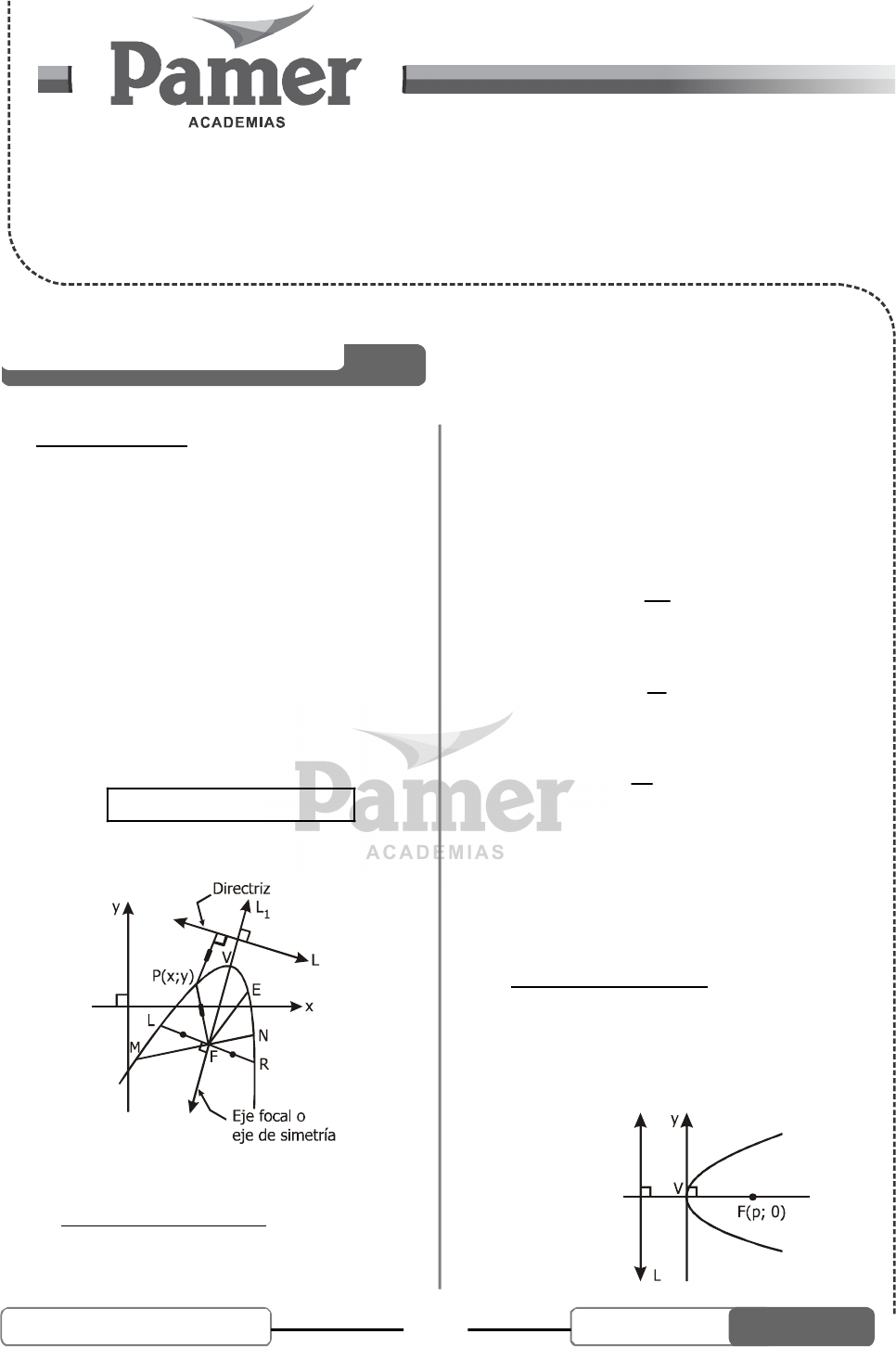 91UNI SEMESTRAL 2013 - III TRIGONOMETRÍA TEMA 91 ESTUDIO DE LA PARÁBOLA TRIGONOMETRÍA I. LA PARÁBOLA La parábola, como el círculo, es una de las curvas cono- cidas como secciones cónicas, las cuales se describen por medio de ecuaciones de segundo grado (cuadráticas) en dos variables. Una parábola es el lugar geométrico de un punto que se mueve en un plano de tal forma que su distancia a un punto fijo es siempre igual a su distancia a una recta fija. El punto fijo de la parábola se denomina foco y la recta fija directriz de la parábola. 2P P(x; y) / d(P,L) d(P,F) A. Elementos de la parábola 1. Foco "F" Es el punto fijo de la parábola. 2. Vértice "V" Es el punto medio del segmento que une la di- rectriz y el foco. 3. Eje local L1 Es la perpendicular a la directriz L. 4. Cuerda focal MN Es el segmento que une dos puntos de la parábola y que pasa por el foco. 5. Radio vector EF Es el segmento que une un punto de la parábola E y el foco F. 6. Lado recto LR Es la cuerda focal perpendicular al eje focal. 7. Excentricidad: e Es la razón constante entre la distancia de un punto al foco hasta la distancia de ese punto desde la directriz (una línea fija). B. Ecuación de la parábola 1. Eje focal paralelo al eje "x" • Forma canónica: V(0; 0) Si p > 0, la parábola se abre hacia la derecha. DESARROLLO DEL TEMA 92UNI SEMESTRAL 2013 - III TRIGONOMETRÍA ESTUDIO DE LA PARÁBOLA TEMA 28 Exigimos más! Si p < 0, la parábola se abre hacia la izquierda. • Forma ordinaria: V(h; k) Si p > 0, la parábola se abre hacia la derecha. Si p < 0, la parábola se abre hacia la izquierda. 3. Eje focal paralelo al eje "y" • Forma canónica: V(0; 0) Si p > 0, la parábola se abre hacia arriba. 93UNI SEMESTRAL 2013 - III TRIGONOMETRÍA TEMA 28 ESTUDIO DE LA PARÁBOLA Exigimos más! Si p < 0, la parábola se abre hacia abajo. • Forma ordinaria: V(h; k) Si p > 0, la parábola se abre hacia arriba. Si p < 0, la parábola se abre hacia abajo. 3. Ecuación general de la parábola 2 2Ax By Cx Dy E 0 La ecuación representa a una parábola si cumple las siguientes condiciones: • Si el eje de la parábola es paralelo ó coinci-dente al eje x, si solo si A = 0, B 0 ; C 0 . Entonces la ecuación se puede: 2y ay bx c 0 • Si el eje de la parábola es paralelo ó coinci-dente al eje y si solo si A 0 ; B = 0; D 0 . Entonces la ecuación se puede expresar en la forma: 2x ax by c 0 94UNI SEMESTRAL 2013 - III TRIGONOMETRÍA ESTUDIO DE LA PARÁBOLA TEMA 28 Exigimos más! Problema 1 El cable del puente colgante de la figura tiene la forma de una parábola. Las dos torres se encuentran a una distancia de 150 m entre sí y los puntos de soporte del cable en la torres se hallan a 22 m sobre la calzada, además, el punto más bajo de del cable se encuentra a 7 m sobre dicha calzada. Halle, sobre la calzada, la distancia de un punto del cable que se encuentra a 15 m de una de las torres. puente cable 15 m torre 22 m calzada A) 16 m B) 15,6 m C) 16,6 m D) 14 m E) 14,6 m UNI Resolución: Se pide y'. 22 m calzada Eje focal (75, 15) Y 15Torre 75 75 60 Rx 2 = 4py X Ubicando convenientemente los ejes coordenados, X e Y se tiene que: R (60; y' – 7) Luego la ecuación de la parábola con vértice en el origen. x2 = 4 py El extremo superior de la torre (75;15) pertenece a la parábola, entonces debe vericar la ecuación: 2(75) = 4p(15) 4p=375 El punto R pertenece a la parábola, entonces (60) 2 = 375(y ' – 7) , operando y' = 16,6 m. Respuesta: C) 16,6 m Problema 2 El foco de una parábola es el punto A(4, 0) y un punto sobre la parábola es el punto P(2; 2), entonces, la distancia del punto P a la recta directriz de la parábola es: UNI A) 2 B) 3 C) 2 2 D) 2 3 E) 2 Resolución: Por definición de parábola, es el lugar geométrico de todos los puntos que están a igual distancia de un punto fijo, llamado foco, y de una recta, llamada recta directriz: 2 2d (2 – 4) (2 – 0) 2 2 Y Recta directriz P(2; 2) d A(4; 0) X d Respuesta: C) 2 2 Problema 3 La gráfica adjunta corresponde a y = x2 + 6x – 5. Se inscribe un rectángulo con los lados paralelos a los ejes coordenados. Entonces la expresión para el área de rectángulo es: Y X3 UNI A) 22(3 – x) 4 – (x – 3) B) 2(3 – x) 2 – (x – 3) C) 2(3 – x) 4 – (x – 3) D) 2x – 3(3 – x) 2 – 2 E) 2x – 3(3 – x) 4 – 2 Resolución: La ecuación dada es: y = –x2 + 6x – 5 = –x(x – 3)2 + 4 y su gráfico viene dado por: Y X3x 3 – x3 – x 2(3 – x) (6 – x; – (x – 32) + 4)–(x – 32) + 4 4 Luego la expresión para el área del rectángulo es: 2 22(3 – x). x(x – 3) 4 2(3 – x). 4 – (x – 3) Respuesta: A) 22(3 – x) 4 – (x – 3) problemas resueltos