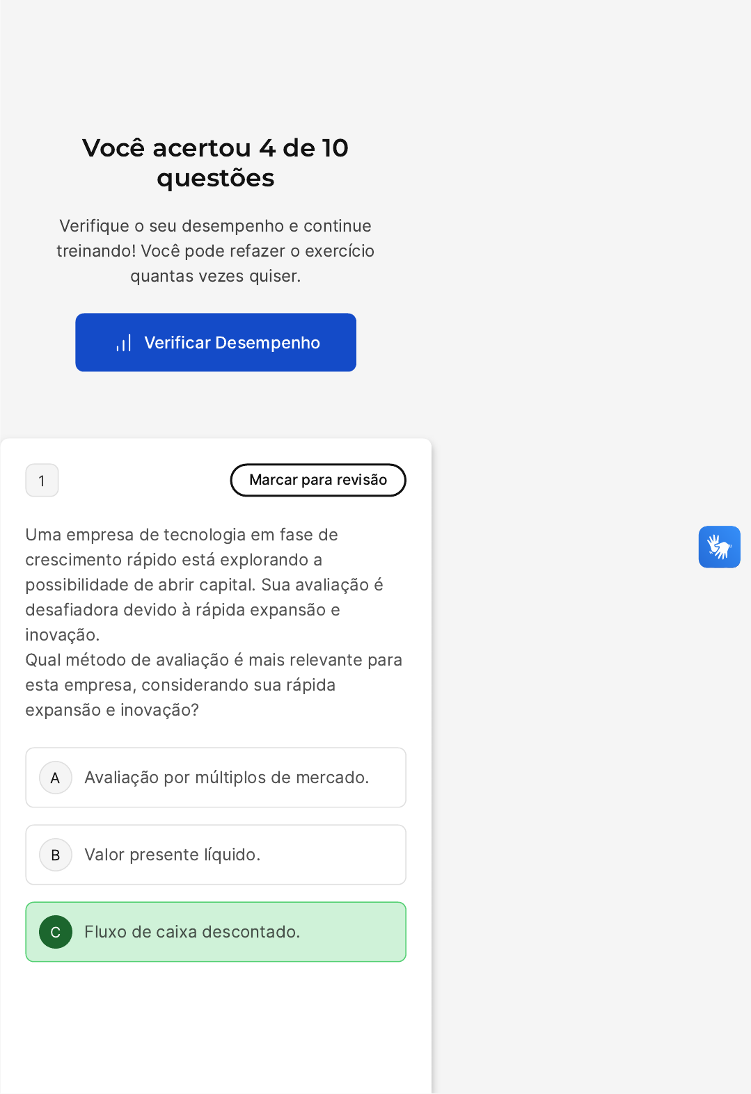 26/02/2024, 11:56 estacio.saladeavaliacoes.com.br/exercicio/65dca694185d7aeacfa93fbb/gabarito/ https://estacio.saladeavaliacoes.com.br/exercicio/65dca694185d7aeacfa93fbb/gabarito/ 1/14 Você acertou 4 de 10 questões Verifique o seu desempenho e continue treinando! Você pode refazer o exercício quantas vezes quiser. Verificar Desempenho A B C 1 Marcar para revisão Uma empresa de tecnologia em fase de crescimento rápido está explorando a possibilidade de abrir capital. Sua avaliação é desafiadora devido à rápida expansão e inovação. Qual método de avaliação é mais relevante para esta empresa, considerando sua rápida expansão e inovação? Avaliação por múltiplos de mercado. Valor presente líquido. Fluxo de caixa descontado. 26/02/2024, 11:56 estacio.saladeavaliacoes.com.br/exercicio/65dca694185d7aeacfa93fbb/gabarito/ https://estacio.saladeavaliacoes.com.br/exercicio/65dca694185d7aeacfa93fbb/gabarito/ 2/14 D E A B Análise de ativos fixos. Custo médio ponderado de capital. Resposta correta Parabéns, você selecionou a alternativa correta. Confira o gabarito comentado! Gabarito Comentado O método de fluxo de caixa descontado é mais relevante para uma empresa de tecnologia em rápida expansão. Ele permite uma análise detalhada das projeções futuras e da capacidade de geração de valor da empresa, aspectos cruciais para negócios em fase de crescimento acelerado. 2 Marcar para revisão Na avaliação efetuada pelo método do fluxo de caixa descontado, é fundamental definir corretamente o custo de capital utilizado na análise. Nesse sentido, caso se opte pela avaliação pelo fluxo de caixa livre do acionista, o custo de capital adequado seria: O prêmio pelo risco de mercado. O custo médio ponderado de capital. 26/02/2024, 11:56 estacio.saladeavaliacoes.com.br/exercicio/65dca694185d7aeacfa93fbb/gabarito/ https://estacio.saladeavaliacoes.com.br/exercicio/65dca694185d7aeacfa93fbb/gabarito/ 3/14 C D E O custo da taxa Selic O custo do capital próprio A inflação medida pelo IPCA. Resposta incorreta Opa! A alternativa correta é a letra D. Confira o gabarito comentado! Gabarito Comentado Na avaliação pelo método do fluxo de caixa descontado, quando se opta pela avaliação pelo fluxo de caixa livre do acionista, o custo de capital adequado é o custo do capital próprio. Isso ocorre porque o valor gerado pelo modelo se refere ao preço justo da participação acionária da empresa. Portanto, a alternativa correta é a letra D� "O custo do capital próprio". Em contrapartida, quando a avaliação é feita pelo fluxo de caixa livre da firma, a taxa utilizada para desconto é o custo médio ponderado de capital, pois o valor gerado pelo modelo consiste no preço justo da firma. 3 Marcar para revisão Fusões e aquisições são eventos relevantes na vida de todas as corporações que vivenciam esse tipo de operação, com o poder de afetar investidores e demais stakeholders das 26/02/2024, 11:56 estacio.saladeavaliacoes.com.br/exercicio/65dca694185d7aeacfa93fbb/gabarito/ https://estacio.saladeavaliacoes.com.br/exercicio/65dca694185d7aeacfa93fbb/gabarito/ 4/14 A B C D E empresas. Nesse sentido, a opção que melhor define o conceito de fusões e aquisições seria: Processos de reestruturação societária, que têm como pano de fundo a união de ativos, com a intenção de criação de valor Processos de compra de empresas, que têm como pano de fundo a intenção de criação de valor. Processos de reestruturação societária, que têm como pano de fundo a compra e venda de ativos, com a intenção de criação de valor. Processos de compra ou união de ativos, que têm como pano de fundo a criação de valor Processos de reestruturação societária, que têm como pano de fundo a fusão de ativos, com a intenção de criação de valor Resposta incorreta Opa! A alternativa correta é a letra A. Confira o gabarito comentado! Gabarito Comentado A alternativa correta é a letra A� "Processos de reestruturação societária, que têm como pano de fundo a união de ativos, com a intenção de criação de valor". Fusões e aquisições são, de fato, processos de reestruturação societária que envolvem a 26/02/2024, 11:56 estacio.saladeavaliacoes.com.br/exercicio/65dca694185d7aeacfa93fbb/gabarito/ https://estacio.saladeavaliacoes.com.br/exercicio/65dca694185d7aeacfa93fbb/gabarito/ 5/14 A B C união de ativos de duas ou mais empresas. O objetivo principal dessas operações é a criação de valor, seja por meio da sinergia entre as empresas, da expansão de mercado, da diversificação de produtos, entre outros. Portanto, a alternativa A captura de maneira mais completa e precisa o conceito de fusões e aquisições. 4 Marcar para revisão Dentre os passos do roteiro de avaliação, um que é considerado de suma relevância é a análise do ambiente de negócios, importante para que se definam e fundamentem as premissas usadas na avaliação. Nesse sentido, podemos dizer que essa análise é composta em 3 etapas, sendo elas: Análise microeconômica, análise das informações financeiras e análise da estratégia da empresa. Análise setorial, análise macroeconômica e análise microeconômica. Análise setorial, análise da estratégia da empresa e análise macroeconômica 26/02/2024, 11:56 estacio.saladeavaliacoes.com.br/exercicio/65dca694185d7aeacfa93fbb/gabarito/ https://estacio.saladeavaliacoes.com.br/exercicio/65dca694185d7aeacfa93fbb/gabarito/ 6/14 D E Análise macroeconômica, análise setorial e análise da estratégia da empresa Análise macroeconômica, análise econômico-financeira e análise da estratégia da empresa. Resposta correta Parabéns, você selecionou a alternativa correta. Confira o gabarito comentado! Gabarito Comentado A alternativa correta é a "D", que menciona as três etapas da análise do ambiente de negócios: análise macroeconômica, análise setorial e análise da estratégia da empresa. A análise macroeconômica é i