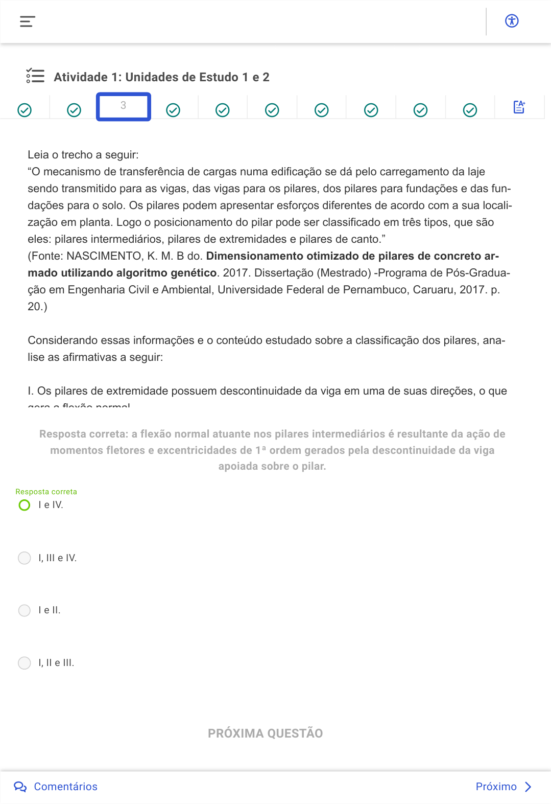 26/02/2024, 17:30 Anhembi Morumbi DL https://student.ulife.com.br/ContentPlayer/Index?lc=NASIuX%2b3rItjuYQEK6YUrA%3d%3d&l=sgog9%2flMfubo2r7KTIdIww%3d%3d&cd=MZ7c3… 1/1 Atividade 1: Unidades de Estudo 1 e 2 Leia o trecho a seguir: “O mecanismo de transferência de cargas numa edificação se dá pelo carregamento da laje sendo transmitido para as vigas, das vigas para os pilares, dos pilares para fundações e das fun- dações para o solo. Os pilares podem apresentar esforços diferentes de acordo com a sua locali- zação em planta. Logo o posicionamento do pilar pode ser classificado em três tipos, que são eles: pilares intermediários, pilares de extremidades e pilares de canto.” (Fonte: NASCIMENTO, K. M. B do. Dimensionamento otimizado de pilares de concreto ar- mado utilizando algoritmo genético. 2017. Dissertação (Mestrado) -Programa de Pós-Gradua- ção em Engenharia Civil e Ambiental, Universidade Federal de Pernambuco, Caruaru, 2017. p. 20.) Considerando essas informações e o conteúdo estudado sobre a classificação dos pilares, ana- lise as afirmativas a seguir: I. Os pilares de extremidade possuem descontinuidade da viga em uma de suas direções, o que gera a flexão normal Resposta correta: a flexão normal atuante nos pilares intermediários é resultante da ação de momentos fletores e excentricidades de 1ª ordem gerados pela descontinuidade da viga apoiada sobre o pilar. I e IV. Resposta correta I, III e IV. I e II. I, II e III. II e IV. PRÓXIMA QUESTÃO 3 Próximo Comentários