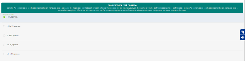Entre as modalidades de alianças estratégicas, o sistema de franquias (franchising), ao utilizar marcas registradas com bastante impacto, tem sido amplamente utilizado, demonstrando ser uma estratégia eficaz em processos de expansão, pois o franqueado mantém o controle do negócio e necessita de investimentos menores que os necessários, quando realizados com capital próprio. Considerando o texto apresentado, avalie as afirmações a seguir. I. As economias de escala geradas pelo sistema de franquias são importantes fatores de vantagem competitiva em relação aos negócios independentes. II. A franquia tem a vantagem sobre um negócio próprio, pois proporciona ao franqueado, um desempenho superior, e uma recuperação mais rápida do investimento realizado. III. Em redes de franquias, atuando em mercados homogêneos com procedimentos padronizados, é recomendável uma adaptação de procedimentos ao mercado, por meio da ação empreendedora do franqueado. IV. Como único responsável pelo retorno do negócio, o franqueado é livre de escolher a localização da unidade franqueada. É correto o que se afirma em