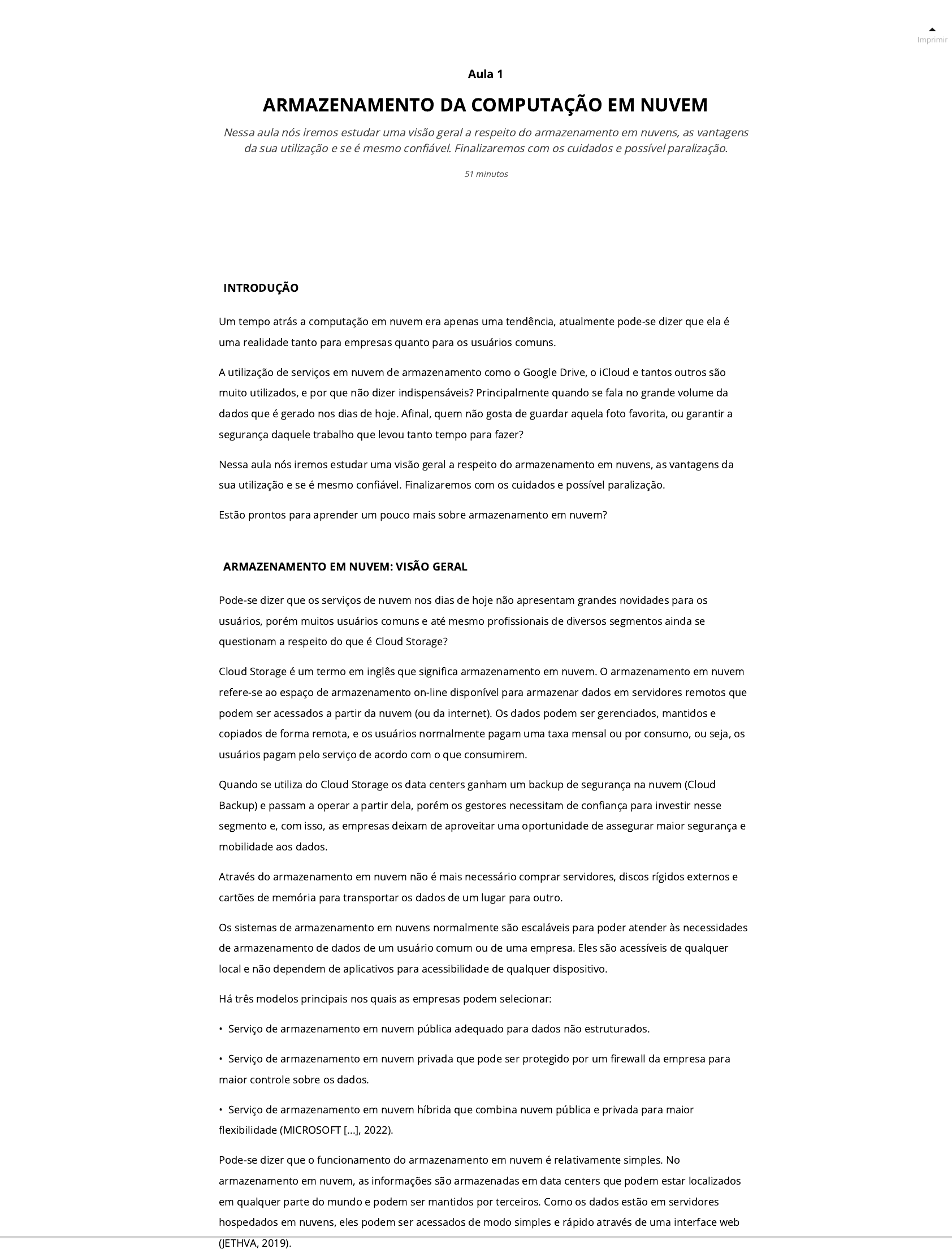 01/12/23, 21:15 wlldd_221_u3_ban_dad_nuv https://www.colaboraread.com.br/integracaoAlgetec/index?usuarioEmail=milkgui006%40gmail.com&usuarioNome=GUILHERME+DE+CARVALHO&disciplinaDescricao=&atividadeId=3680110&atividadeDescricao=… 1/24 Imprimir INTRODUÇÃO Um tempo atrás a computação em nuvem era apenas uma tendência, atualmente pode-se dizer que ela é uma realidade tanto para empresas quanto para os usuários comuns. A utilização de serviços em nuvem de armazenamento como o Google Drive, o iCloud e tantos outros são muito utilizados, e por que não dizer indispensáveis? Principalmente quando se fala no grande volume da dados que é gerado nos dias de hoje. A�nal, quem não gosta de guardar aquela foto favorita, ou garantir a segurança daquele trabalho que levou tanto tempo para fazer? Nessa aula nós iremos estudar uma visão geral a respeito do armazenamento em nuvens, as vantagens da sua utilização e se é mesmo con�ável. Finalizaremos com os cuidados e possível paralização. Estão prontos para aprender um pouco mais sobre armazenamento em nuvem? ARMAZENAMENTO EM NUVEM: VISÃO GERAL Pode-se dizer que os serviços de nuvem nos dias de hoje não apresentam grandes novidades para os usuários, porém muitos usuários comuns e até mesmo pro�ssionais de diversos segmentos ainda se questionam a respeito do que é Cloud Storage? Cloud Storage é um termo em inglês que signi�ca armazenamento em nuvem. O armazenamento em nuvem refere-se ao espaço de armazenamento on-line disponível para armazenar dados em servidores remotos que podem ser acessados a partir da nuvem (ou da internet). Os dados podem ser gerenciados, mantidos e copiados de forma remota, e os usuários normalmente pagam uma taxa mensal ou por consumo, ou seja, os usuários pagam pelo serviço de acordo com o que consumirem. Quando se utiliza do Cloud Storage os data centers ganham um backup de segurança na nuvem (Cloud Backup) e passam a operar a partir dela, porém os gestores necessitam de con�ança para investir nesse segmento e, com isso, as empresas deixam de aproveitar uma oportunidade de assegurar maior segurança e mobilidade aos dados. Através do armazenamento em nuvem não é mais necessário comprar servidores, discos rígidos externos e cartões de memória para transportar os dados de um lugar para outro. Os sistemas de armazenamento em nuvens normalmente são escaláveis para poder atender às necessidades de armazenamento de dados de um usuário comum ou de uma empresa. Eles são acessíveis de qualquer local e não dependem de aplicativos para acessibilidade de qualquer dispositivo. Há três modelos principais nos quais as empresas podem selecionar: • Serviço de armazenamento em nuvem pública adequado para dados não estruturados. • Serviço de armazenamento em nuvem privada que pode ser protegido por um �rewall da empresa para maior controle sobre os dados. • Serviço de armazenamento em nuvem híbrida que combina nuvem pública e privada para maior �exibilidade (MICROSOFT [...], 2022). Pode-se dizer que o funcionamento do armazenamento em nuvem é relativamente simples. No armazenamento em nuvem, as informações são armazenadas em data centers que podem estar localizados em qualquer parte do mundo e podem ser mantidos por terceiros. Como os dados estão em servidores hospedados em nuvens, eles podem ser acessados de modo simples e rápido através de uma interface web (JETHVA, 2019). Aula 1 ARMAZENAMENTO DA COMPUTAÇÃO EM NUVEM Nessa aula nós iremos estudar uma visão geral a respeito do armazenamento em nuvens, as vantagens da sua utilização e se é mesmo con�ável. Finalizaremos com os cuidados e possível paralização. 51 minutos 01/12/23, 21:15 wlldd_221_u3_ban_dad_nuv https://www.colaboraread.com.br/integracaoAlgetec/index?usuarioEmail=milkgui006%40gmail.com&usuarioNome=GUILHERME+DE+CARVALHO&disciplinaDescricao=&atividadeId=3680110&atividadeDescricao=… 2/24 Esse tipo de armazenamento em nuvem utiliza servidor de controle mestre e outros servidores de armazenamento, nos quais todos estão vinculados e podem ser utilizados dependendo do seu uso e requisitos, e cobrados de acordo com esses detalhes. O armazenamento em nuvem normalmente suporta vários tipos de arquivos de todos os tamanhos, para que seja possível carregar de modo fácil todo tipo de arquivo: documentos, vídeos, fotos, músicas, �lmes e tudo o que for importante e precisa estar seguro. Após adquirir um serviço de armazenamento em nuvem e carregar os arquivos, é possível sincronizá-lo com o smartphone, tablet, notebook e outros dispositivos para facilitar o acesso em qualquer lugar. Nesse bloco vimos a importância do armazenamento em nuvem e algumas características importantes, como a possibilidade de acessar os arquivos em qualquer hora e lugar, a partir de uma conexão com a internet. VIDEOAULA: ARMAZENAMENTO EM NUVEM: VISÃO GERAL Nesse vídeo apresentaremos os tipos de armazenamento considerados mais comuns em computação em nuvem (EVEO, 2018). O primeiro é o All Flash. Os equipamentos do All Flash são constituídos somente pela memória �ash. Quando se utiliza esse tipo de memória, a velocidade de leitura e de gravação são rápidas e possuem alta performance. O problema do All Flash é o custo por GB que pode chegar a três vezes mais comparando-se com o formato convencional. O valor é importante, quando se pensa em utilizar armazenamento em nuvem, por esse motivo costuma-se utilizar o armazenamento All Flash apenas para o que realmente é essencial, por exemplo, o local de armazenamento dos bancos de dados ou outras aplicações que necessitam utilizar um volume de dados menor. O segundo tipo de armazenamento é o mais comum nos dias de hoje e é conhecido como armazenamento Standard. Esse armazenamento é formado por memória �ash (SSDs) e discos. Esse tipo de con�guração é considerado e�ciente, pois aceita que uma nova gravação aconteça nos disposit