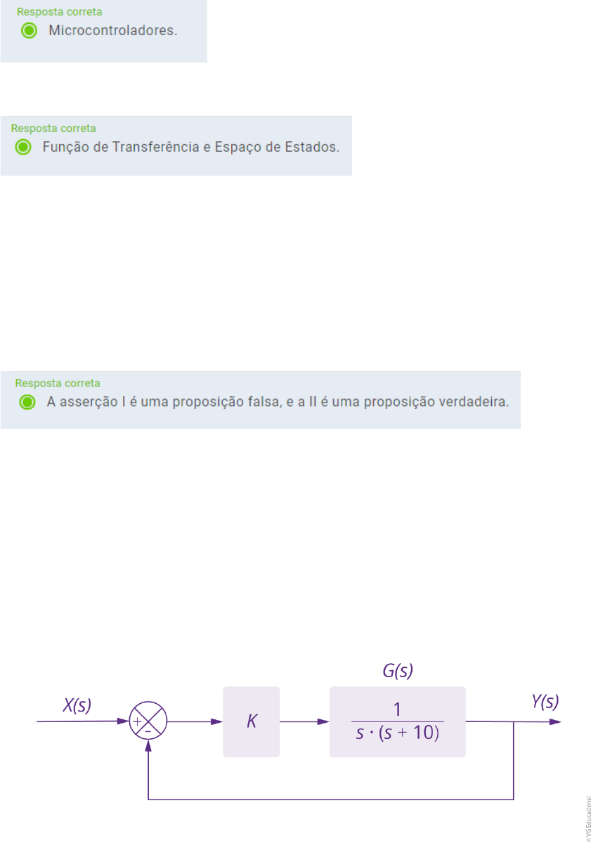 1 - Leia o excerto a seguir. “O equipamento eletrônico digital pode executar duas funções: (1) supervisão – externa à malha de realimentação; e (2) controle – interno à malha de realimentação.” NISE, N. S. Engenharia de sistemas de controle. 7. ed. Rio de Janeiro: LTC, 2017. p. 55. Considerando as informações do texto, a implementação dos controladores digitais ocorre por meio de qual equipamento eletrônico? Assinale a alternativa correta. 2 - Considerando a forma de representar um sistema de controle por meio da modelagem matemática, assinale a alternativa que apresenta as duas formas de representação matemática dos sistemas controlados. 3 - Muitas das ferramentas utilizadas em controle contínuo podem ser aplicadas em controle digital, mas, devido ao fato da necessidade de amostragens dos sinais, algumas ferramentas de análise de controle contínuo precisam ser adaptadas para serem utilizadas em controle digital, enquanto outras ferramentas não precisam de nenhuma adaptação. Diante disso, analise as asserções a seguir e verifique a relação entre elas. I. O critério de Routh Hurwitz pode ser utilizado para análise em controle digital sem nenhuma adaptação. PORQUE: II. O critério de Routh Hurwitz é utilizado para verificar a estabilidade de um sistema por meio da sua equação característica do sistema em s. A respeito dessas afirmações, assinale a opção correta. 4 - Leia o trecho a seguir. “O lugar geométrico das raízes, ou LGR, é uma representação gráfica dos polos em malha fechada à medida que um parâmetro do sistema é variado, sendo um método poderoso de análise e projeto para a estabilidade e a resposta transitória”. NISE, N. S. Engenharia de sistemas de controle. 7. ed. Rio de Janeiro: LTC, 2017. p. 580. Observe o diagrama de blocos de um sistema em malha fechada na figura a seguir. Figura – Diagrama de blocos de um sistema G(s) com um controlador K Fonte: Elaborada pelo autor. #PraCegoVer: a imagem representa um diagrama de blocos com um sistema em malha fechada. O sistema apresenta uma entrada que tem a sua entrada X(s) com a sua saída Y(s). Após essa comparação, há um bloco representando o controlador K em série com um sistema que é dado por G(s) = 1 / s * (s + 10), gerando a saída Y(s), e a sua saída é comparada com a entrada por uma realimentação negativa. Considerando as informações do texto e o sistema mostrado, analise as afirmativas a seguir. I. O polo p = -9,47 se encontra sobre o LGR, atendendo ao requisito de ângulo. II. Para o polo p = -9,47, o ganho K será igual a 5. III. O polo p = -15 se encontra sobre o LGR, atendendo ao requisito de ângulo. IV. O polo p = -5 + j*2,34 se encontra sobre o LGR, atendendo ao requisito de ângulo. É correto o que se afirma em: 5 - Os equipamentos modernos utilizam técnicas de processamento digital de sinais para programar algoritmos de tomadas de decisões, fazer avaliações, monitoramento etc. O primeiro passo é amostrar os sinais de interesse, transformando em uma sequência de tempo discreto que possa ser armazenada digitalmente e usada por um processador. De acordo com o exposto, analise as afirmativas a seguir. I. A discretização dos sinais contínuos consiste em multiplicá-los por um degrau unitário, ou seja, uma sequência de funções impulso unitário, igualmente, espaçadas no tempo. II. Sinais de tempo discreto podem ser obtidos a partir da amostragem de sinais de tempo contínuo. III. A discretização dos sinais contínuos consiste em multiplicá-los por um trem de impulsos, ou seja, uma sequência de funções impulso unitário, igualmente, espaçadas no tempo. IV. O conversor analógico-digital (A/D) converte o sinal de tempo contínuo em uma sequência de amostras representada em números binários proporcional à amplitude do sinal. É correto o que se afirma em: 6 - Na técnica de Ziegler-Nichols, para projetar controladores PID, há dois métodos: um que considera a resposta em malha aberta dada por uma curva S; e outro, quando a sua resposta é instável ou oscilatória. Considerando o sistema em malha fechada da seguinte função de transferência: Com base no texto e na função de transferência apresentados, avalie as afirmações a seguir. I.A resposta ao sinal degrau desse sistema será uma rampa. II.O método de Ziegler Nichols que deve ser utilizado no projeto do controlador é o da reta tangente. III.Uma maneira de obter o ganho crítico do método de Ziegler Nichols é utilizando o critério de Routh Hurwitz, achando o ganho proporcional marginalmente estável. IV.O ganho crítico obtido do critério de Routh Hurwitz possui o valor de 6. É correto o que se afirma em: 7 - Uma forma bem eficaz de se avaliar um sistema é observar a sua resposta em frequência. Com essa análise, é possível obter dois gráficos: um com o módulo em dB do ganho do sistema em função das frequências e o outro mostrando a fase do sistema em relação às frequências. Pela análise de resposta em frequência, é possível projetar controladores e avaliar a sua estabilidade. Diante disso, avalie as afirmações a seguir. I. Margem de fase é a medida de ângulo que falta para chegar em -180° na frequência avaliada. II. Margem de ganho é a medida do ganho que falta para que o ganho na frequência avaliada cruze em 0 dB. III. O diagrama de Nyquist tem o formato de um diagrama polar e é uma ferramenta que auxilia na visualização rápida de características de estabilidade de um sistema. IV. As assíntotas são curvas utilizadas para esboçar o lugar geométrico das raízes no plano da frequência. É correto o que se afirma em: 8 - “Um sistema linear invariante no tempo é estável se a resposta natural tende a zero à medida que o tempo tende a infinito. Um sistema linear invariante no tempo é instável se a resposta natural aumenta sem limites à medida que o tempo tende a infinito. Um sistema linear invariante no tempo é margin