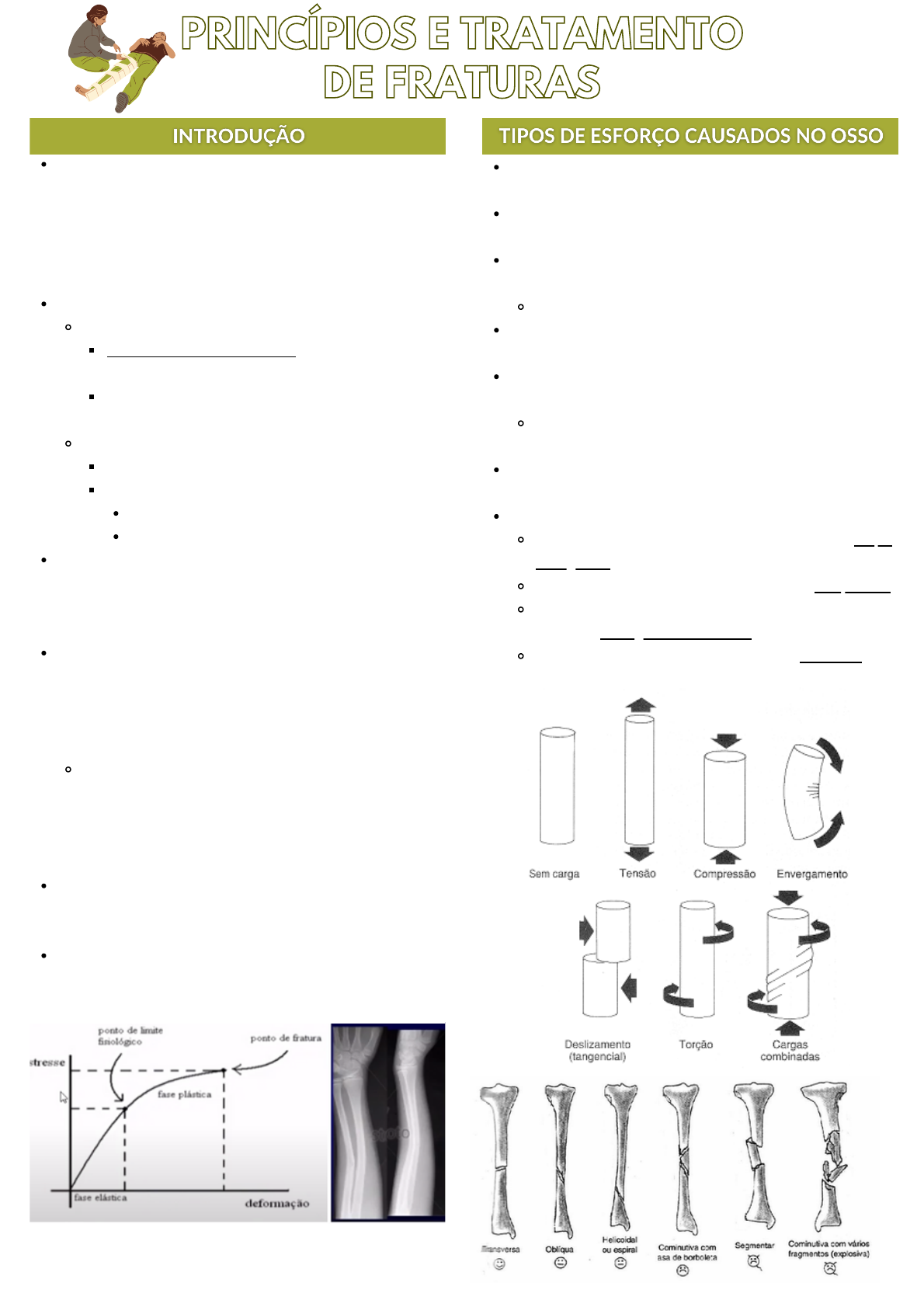 PRINCÍPIOS E TRATAMENTO DE FRATURAS PRINCÍPIOS E TRATAMENTO DE FRATURAS CONCEITO: A perda da integridade óssea é um fenômeno puramente mecânico que desencadeia uma série de fenômenos biológicos responsáveis pela consolidação posterior. Na fratura ocorre um trauma (força aplicada no osso) que ultrapassa a capacidade óssea de absorver e dissipar esse trauma. COMPOSIÇÃO DA MATRIZ ÓSSEA: PARTE INORGÂNICA (50%): ÍONS DE CÁLCIO E FOSFATO: Formando cristais de hidroxiapatita ÍONS DE POTÁSSIO, MAGNÉSIO, CITRATO, SÓDIO E BICARBONATO PARTE ORGÂNICA (50%): COLÁGENO TIPO I (90%) OUTROS: Glicoproteínas Proteoglicanos OBS: Na infância tem uma prevalência da parte orgânica, por isso faz a fratura em galho verde. Enquanto no idoso tem mais parte mineral/inorgânica e ai facilita a fratura (inclusive facilitando a osteoporose) RELAÇÃO CARGA VS DEFORMAÇÃO: Carga imposta a um objeto causando deformação, isso ocorre porque esse objeto tem uma fase elástica, depois uma fase plástica e quando ocorre a ultrapassagem do limite dessa última fase ocorre o ponto de fratura: FRATURA DO GALHO VERDE DA CRIANÇA: Muito mais colágeno/orgânica e menos mineral, ou seja, mais matriz óssea. O galho verde permanece de uma maneira com fratura íntegra, é como se só entortasse o osso. FISIOPATOLOGIA DA CONSOLIDAÇÃO: Inflamação óssea > necrose > vasos novos (teleangiectasia) > calo fibroso e ossificação endocondral > remodelação EPIDEMIOLOGIA DA FRATURA: Aumentado pela longevidade, pelos conflitos carro/moto, além da ausência de paz que pode trazer fraturas TENSÃO/TRAÇÃO: Aplicada duas forças sob o eixo longitudinal com vetores divergentes COMPRESSÃO: Força aplicada ao longo do eixo longitudinal e com vetores convergentes ENVERGAMENTO/FLEXÃO: Força nas duas extremidades com foco perpendicular e em uma direção só EX: Galho seco DESLIZAMENTO/CISALHAMENTO: Forças divergentes aplicadas perpendicularmente e com forças divergentes TORÇÃO: Forças nas extremidades circulares com vetores de forças opostas EX: Ocorre muito em fraturas de úmero em atletas de queda de braço CARGAS COMBINADAS: Diferentes tipos de forças impostas no osso FORÇAS E TIPOS DE FRATURAS: FRATURAS TRANSVERSAS: Linhas de forças divergentes, fazendo traço único e transversal; FRATURA OBLÍQUA: Pela linha de força de compressão FRATURA EM ASA BORBOLETA/TRIANGULAR: Pela fratura de envergamento ou flexão, com três fragmentos FRATURA EM ESPIRAL: Por forças torcionais em direções opostas PRINCÍPIOS E TRATAMENTO DE FRATURAS PRINCÍPIOS E TRATAMENTO DE FRATURAS CLASSIFICAÇÃO OU ESTADIAMENTO: Saber o local da fratura, mecanismo de força, quando ocorreu REDUÇÃO COM CORREÇÃO DO COMPRIMENTO, EIXOS DE ROTAÇÃO: Corrigir a deformidade para o estado natural, no sentido de comprimento inicial, colocar o eixo no mesmo nível e rotação adequada em relação ao outro lado IMOBILIZAÇÃO ESTÁVEL: Ajuda a permitir o fenômeno biológico Esses 2 movimentos acima precisam ser pensados para manter o suprimento sanguíneo RESERVAÇÃO DO SUPRIMENTO SANGUÍNEO DO OSSO E PARTES MOLES AO REDOR DA FRATURA: Quanto menor a agressão/cruentação/invasividade melhor REABILITAÇÃO PRECOCE de preferência, assim que reduzida 1. 2. 3. a. 4. 5. POR MEIO DE IMAGENS: RAIO-X: Fazer em incidências diferentes PLANO CORONAL: Em AP e PA PLANO SAGITAL: Em perfil ou lateral OBLÍQUA GERALMENTE: JOELHO: AP MÃO: PA OBLÍQUA: Em situações que não observa em outras incidências PRIMEIRA IMAGEM - AP DO JOELHO: Visto pela fíbula mais externa SEGUNDA IMAGEM – PERFIL/SAGITAL: Visto a fratura transversa do terço médio da patela [mesmo joelho do de cima] TERCEIRA IMAGEM – OBLÍQUA: Visto o traço da fratura no platô tibial lateral TOMOGRAFIA E RNM: A seguir tem fraturas do escafoide do carpo, que não são vistas normalmente na radiografia. Logo, se mesmo assim tiver sintomas típicos no exame físico, já partir para essas. QUANTO A LOCALIZAÇÃO DO TRAÇO: EPÍFISE METÁFISE DIÁFISE NO CASO DA REGIÃO PROXIMAL DO FÊMUR, PODE-SE REFERIR DE MODO MAIS ESPECÍFICO: TRANSTROCANTÉRICA/INTERTROCANTÉRICA: Grande ou pequeno trocanter CERVICAL OU DO COLO DO FÊMUR CABEÇA SUBTROCANTÉRICA: Início da METÁFISE do fêmur, abaixo da região trocantérica a. b. c. d. QUANTO AO COMPROMETIMENTO ARTICULAR: EXTRA ARTICULAR ARTICULAR (MAIS GRAVE): Precisam que a redução se aproxime da perfeição de restabelecimento, pois a incongruência articular implica em complicações de osteoartrite pós traumático, deformidade ou rigidez, além de desnivelamento com outro osso e diminuindo a amplitude articular QUANTO À ORIENTAÇÃO DO TRAÇO: TRANSVERSA (MAIS ESTÁVEL): Perpendicular ao eixo maior do osso OBLÍQUA (INSTÁVEL): Maior tendência a cisalhamento ou deslizamento da musculatura sob o osso ESPIRAL PRINCÍPIOS E TRATAMENTO DE FRATURAS PRINCÍPIOS E TRATAMENTO DE FRATURAS QUANTO AO NÚMERO DE TRAÇOS: SIMPLES OU ÚNICO TRAÇO CUNHA OU ASA DE BORBOLETA: Dois traços, formando três fragmentos distintos do mesmo osso COMINUTIVA: O número de traços é de 3 traços em diante SEGMENTAR: Traços simples ou cominutivos em um osso longo, mas distantes um do outro EX: Fratura proximal e distal da tíbia QUANTO À EXPOSIÇÃO DO FOCO DE FRATURA: FECHADA ABERTA OU EXPOSTA: Exposição do foco de fratura ao meio externo FRATURAS PATOLÓGICAS: Fraturas que ocorrem em situações especiais; PERI-PROTÉTICA: Ao redor de uma prótese implantada anteriormente em mesmo osso, deixando o osso cortical mais frágil, visto que o osso esponjoso foi comprometido pela presença da prótese; TUMORAL OSTEOMIELITE: Infecção OSTEOPOROSE: Principalmente das vértebras Toda ação que visa restabelecer a condição natural do osso ou articulação, como ALINHAMENTO, COMPRIMENTO OU CONGRUÊNCIA TIPOS: INCRUENTA: Conservadora ou fechada (melhor para preservar o suprimento sanguíneo, sendo nossa PRIMEIRA OPÇÃO) CRUENTA (SEGUNDA OPÇÃO): Cirur