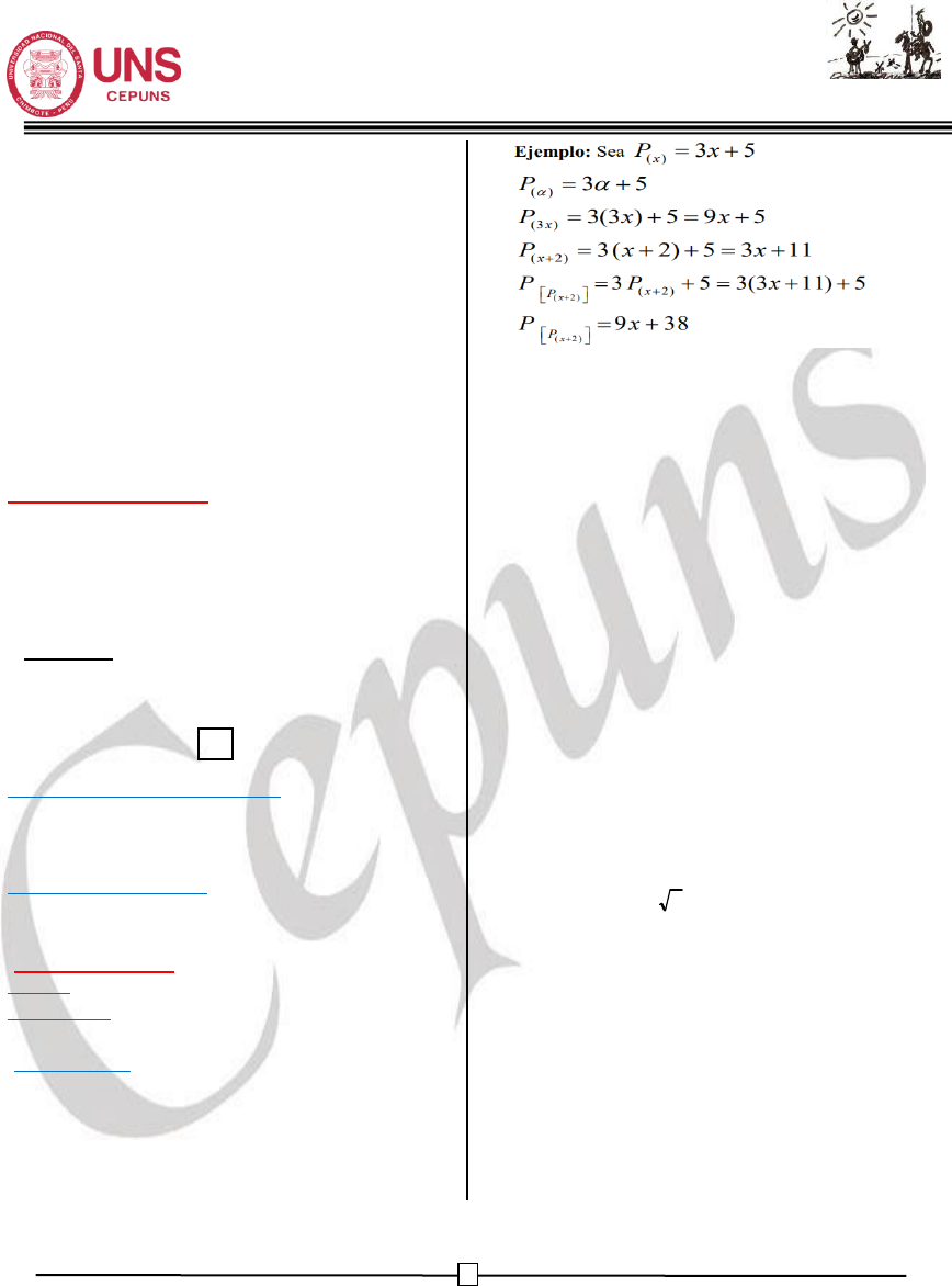 1 Centro Preuniversitario de la UNS S-02 Ingreso Directo ALGEBRA: “EXPRESION ALGEBRAICA” CEPUNS Ciclo 2022 - III VALOR NUMÉRICO: Con frecuencia hacemos uso de símbolos para representar elementos arbitrarios de un conjunto. Por ejemplo, podemos usar x para expresar un número real, aunque no especifiquemos ningún número real en particular. Una letra que se utilice para representar cualquier elemento de un conjunto dado se llama variable. Un símbolo que representa a un elemento específico se llama constante. A menos que se especifique otra cosa, las variables representan número reales. VALOR NUMÉRICO: Es el resultado que se obtiene luego de reemplazar el valor asignado a las variables y realizar las operaciones indicadas. Ejemplo: P(x) = 243x 94 + x 99 + 2x + 6; Halla : P(-3) Solución : P(-3) = 243(-3) 94 + (-3) 99 + 2(-3) + 6 P(-3) = 3 5 . 3 94 + (-3) 99 P(-3) = 3 99 + -3 99 = 0 Valores Numéricos Notables: Si P(x) es un polinomio, se cumple: P(0) = Término independiente. P(1) = Suma de coeficientes. Polinomio Constante: P(x) = m (m0) Su grado es cero. OPERACIONES: Adición: Se suman los términos semejantes. Sustracción: Se restan los coeficientes de términos semejantes. Multiplicación: Se multiplican los coeficientes de cada factor y se tiene en cuenta la teoría de exponentes. GRADO DE UNA EXPRESIÓN ALGEBRAICA RACIONAL ENTERA Al empezar el estudio de este tema, nuestro objetivo principal es mostrar que el grado es la propiedad implícita más importante de las expresiones algebraicas racionales enteras, ya que este nos indica el número de raíces para polinomios. de una variable, y la dimensión funcional en R n , para polinomios de distintas variables. Concepto El grado es la principal característica de una expresión entera, el cual viene dada por los exponentes naturales que afectan a sus variables. Variable.- Es un símbolo que puede ser sustituido por un elemento cualquiera de un conjunto de números. Ejemplos : x ; y ; z ; etc Constante.- Es un símbolo numérico. Ejemplos : 5 ; 9 ; 7 , etc NOTA.- Las expresiones que no cumplen con la definición anterior, reciben el nombre de EXPRESIONES TRASCENDENTES (no algebraicas). Ejemplo: a) 1 + x + x 2 + x 3 + x 4 + ............... b) 2 x + 3 x + 4 x CLASIFICACIÓN DE LAS EXPRESIONES ALGEBRAICAS De acuerdo a la forma de sus variables pueden ser: A).EXPRESIONES ALGEBRAICAS RACIONALES Semana Nº 02 DOCENTES Álgebra. 2 Centro Preuniversitario de la UNS S-02 Ingreso Directo Cuando las variables no están afectadas por el signo radical ni al exponente fraccionario. A su vez pueden ser: RACIONALES ENTERAS.- Cuando los exponentes de las variables son números enteros positivos, no hay variables en el denominador. Ejemplos: x 3 yz ; 2 a 3 + 5b 2 c 4 ; x 5 + 3y 7 – 12z 9 RACIONALES FRACCIONARIAS.- Cuando por lo menos hay una variable en el denominador o las variables del numerador están afectadas al menos de un exponente entero negativo. Ejemplo: 2 3 ; 3 2 xyz-2 ; 2 3 xyz-2 ; 2 1 1 B). EXPRESION ALGEBRAICA IRRACIONALES Se caracteriza por que su variables son afectados por radicales o exponentes fraccionarios. 12;2;35 3 2 7 3 xxyx TÉRMINO ALGEBRAICO Es una combinación de constante y variables relacionadas por las operaciones de multiplicación, división, potenciación y radicación en sus bases y en cantidades limitadas. Ejemplo: 2x3 ; 2 5 abc4 ; 3xa+2 ya+3 a N ELEMENTOS DE UN TÉRMINO ALGEBRAICO -2 3 x 2 y 3 TÉRMINOS SEMEJANTES Son aquellos que tienen la misma PARTE LITERAL. Ejemplo: 3 1 x 2 yz ; 3 x 2 yz ; -2x 2 yz Tienen en común : x 2 y z Observación: Dos o más términos se pueden sumar o restar sólo si son semejantes, para lo cual se suman o restan los coeficientes y se escribe la misma parte literal. Ejemplo: Reduce: E = 4x2y – 6xy2 – 8x2y + xy2 – 5 – 2 E = 4x2y – 5xy2 – 7 Cálculo del grado de una expresión entera A. Para un monomio Grado relativo (G.R.) Se determina ubicando el exponente de la variable referida en dicha expresión Grado absoluto (G.A.) Se determina sumando todos los exponentes de las variables (suma de grados relativos) Ejemplo: P(x; y) = 3x9y5 GR(x) = 9, GR(y) = 5 GA(P) = 9 + 5 = 14 B. Para un polinomio: Grado relativo (G.R.): Se determina ubicando el mayor exponente de la variable referida en dicha expresión. Grado absoluto (G.A.): Se determina tomando el mayor grado absoluto de uno de sus términos Ejemplo: Sea el polinomio G.R. = El mayor exponente de cada variable. G.A. = Es el mayor grado de sus términos. P(x, y) = 5x9y2 + 3/2 x7y15 - 8x8y13 GR(x) =9 ; GR(y) = 15 GA(P) = 7 + 15 = 22 1. El grado de una constante monómica es igual a cero. Veamos Sea P(x) = 5 grado (P) = 0 2. El grado de la constante nula no está definida, Es decir: Si P(x) = 0 grado (P) es Indefinida. Es indiferente utilizar la terminología grado o grado absoluto Exponente coeficiente Parte literal (variable) DOCENTES Álgebra. 3 Centro Preuniversitario de la UNS S-02 Ingreso Directo Grado en operaciones algebraicas Lo resumimos en el cuadro adjunto. PROBLEMAS PROPUESTOS 1. Del siguiente polinomio, se conocen los siguientes datos: GR(x) = 7; GR(y) = 8 P(x,y) = 2x m+1 – 3x m y n + 5y n+2 ¿Cuál es el GA del polinomio? a) 5 b) 6 c) 7 d) 8 e) 12 2. Sea el monomio: M(x; y)=2n 2 3 n 5y1xynx Donde se cumple: GR(x) = GR(y). Halla el mayor coeficiente del monomio. a) 20 b) 18 c) 16 d) 7 e) 8 3. Dado el monomio: 4 52 3 1232 . )( n nn x xx xM para qué valor de “n”; M(x) es constante. a) 4 b) 0,5 c)10 d) 1,3 e) 14 4. Si: a b c a b b c a c Halle el grado absoluto de: )( 889 22 2 ..;; cba bcaca zyxzyxE Transformable a una E.A.R.E. a) 6 b) 24 c) 7 d) 5 e) 9 5. Si: P(x+5) = x² 3x + 1 Calcule: E = P(8) + P(6) a) 0 b) 1 c) 2 d)3 e) 7 6. Calcule “n”, si el G.A. del monomio es 6. 5 165 2 3 324 42 . . ;;; wy zx wzyxM n nn a)13 b) 12 c) 14 d)11 e) 10 7. Sabiendo que: m 2 n² 5 n 5 m 4 P x;y 5x y Q x;y 2x y son semejantes. Calcule el menor valor de m + n. a) 1 b) 3 c) 5 d) 8 e) 13 8. Sea P(x) = x³ + 3x + 3x² + 