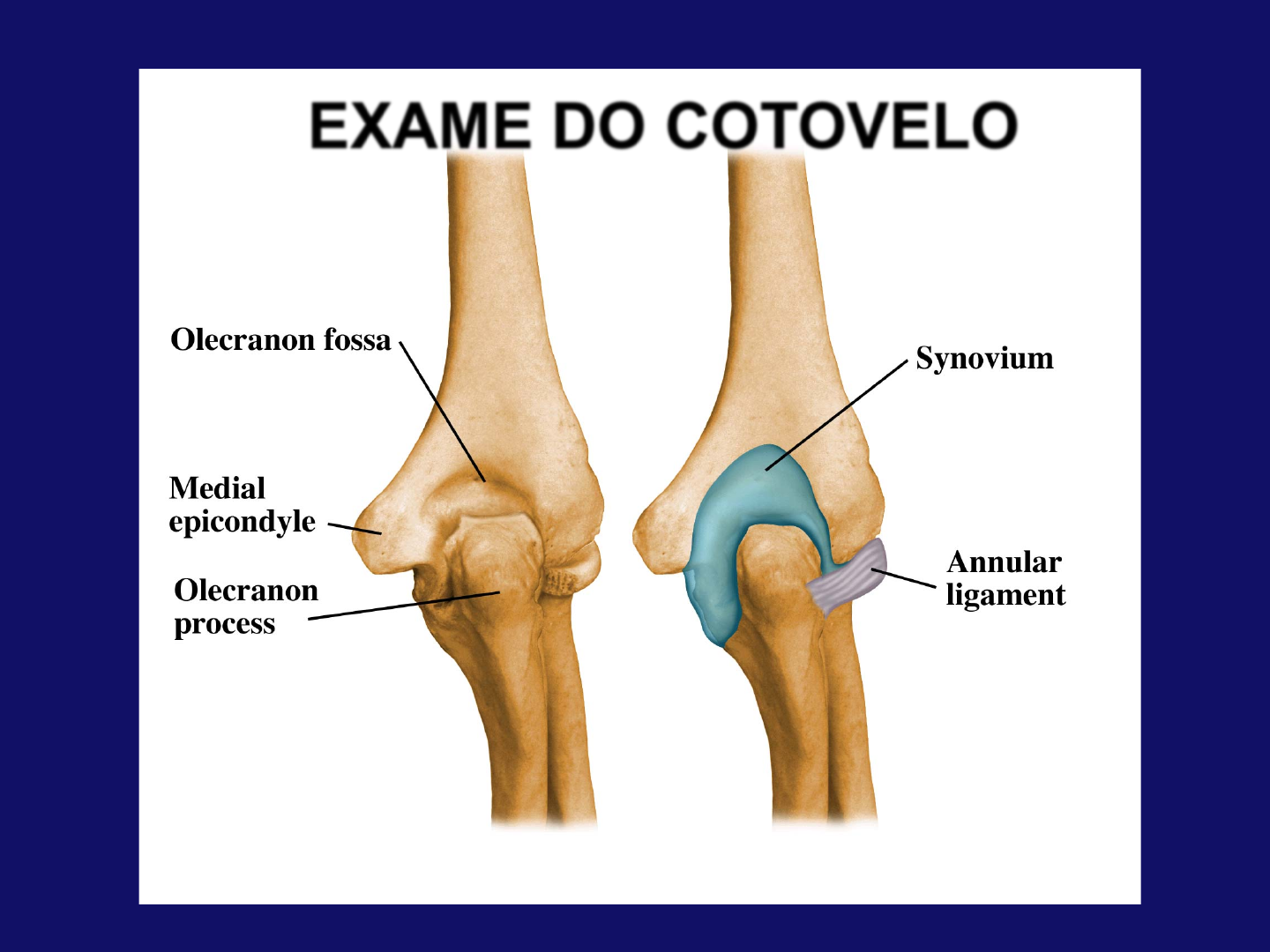 EXAME DO COTOVELO Considerações Iniciais • É uma articulação muito estável (fraturas) • Cápsula articular com grande importância para propriocepção do membro superior • Movimentos potentes em flexão e extensão • Região com muitas estruturas importantes (nervos, artérias e veias) Anatomia • Complexo articular com 3 articulações: – Rádio-ulnar – Úmero-ulnar – Úmero-radial • Cápsula articular envolve as 3 articulações • Ligamentos colaterais (medial e lateral) e anular Articulações do Cotovelo Art. Úmero-radial Art. Rádio-ulnar Art. Úmero-ulnar Músculos do Cotovelo • Músculos da Flexão do Cotovelo • Músculos da Extensão do Cotovelo Bíceps braquial Braquial Braquiorradial Tríceps braquial Ancôneo • Músculos da Pronação do Antebraço Pronador Redondo Pronador Quadrado Braquiorradial • Músculos da Supinação do Antebraço Supinador Bíceps braquial Braquiorradial Ligamentos do Cotovelo Ligamentos do Cotovelo Ligamentos do Cotovelo Nervos Nervos Vasos de Sangue Nervos e Vasos de Sangue Avaliação do Cotovelo • Inspeção e palpação • Mecanismo da lesão • Testes de estabilidade lateral e medial • Testes de cotovelo de tenista e cotovelo de golfista • Diagnóstico por imagem • Funcionalidade da mão Avaliação do Cotovelo Inspeção Ângulo de Carregamento • Ângulo Normal: - Homens 5°- 10º - Mulheres 10º-15° Ângulo de Carregamento Ângulo de Carregamento • Cubitus Valgus - Ângulo de carregamento é anormal - Antebraço se afasta além de 15° • Cubitus Varus - ↓ no ângulo de carregamento - “deformidade em rifle” Ângulo de Carregamento Ângulo de Carregamento Deformidade em Rifle – Lesão epifisial – Fratura distal do úmero Ângulo de Carregamento Relação entre os epicôndilos e o olécrano Inspeção • Derrame Articular: mais evidente no triângulo formado entre a cabeça radial, olécrano e epicôndilo lateral • Bursite Olecraniana • Gota (Tofos) • Hipertrofia Inspeção Bursite Olecraniana Bursite Olecraniana Palpação Palpação • Palpação Óssea • Palpação dos Tecidos Moles Zonas Clínicas 1. Face Medial 2. Face Posterior 3. Face Lateral 4. Face Anterior Amplitude de Movimento • Flexão: 135° a 145° • Extensão: 0° ou –5° • Pronação: 90° • Supinação: 90° Amplitude de Movimento Amplitude de Movimento Alcance de movimento de flexão e de extensão de cotovelo Amplitude de Movimento Alcance de movimento de supinação e de pronação de cotovelo Exame Neurológico Exame Neurológico Testes 1. Avaliam a força muscular do cotovelo 2. Integridade do suprimento nervoso destes músculos Exame Neurológico Divisão do Exame Neurológico 1. Testes Musculares 2. Testes de Reflexos 3. Testes de Sensibilidade Exame Neurológico Testes Musculares 1. Flexão 2. Extensão 3. Supinação 4. Pronação • Extensão – Tríceps braquial (C7) - n. radial – Anconeu (C7) - n. radial • Flexão – Braquial (C5-C6) - n. musculocutâneo – Bíceps braquial (C5-C6) - n. musculocutâneo Exame Neurológico • Supinação – Supinador (C6) - n. radial – Bíceps braquial (C5-C6) - n. musculocutâneo • Pronação – Pronador redondo (C6) - n. mediano – Pronador quadrado (C8-T1) - n. interósseo ant. Exame Neurológico Exame Neurológico Teste muscular para flexão Exame Neurológico Teste muscular para extensão Exame Neurológico Teste muscular para supinação Exame Neurológico Teste muscular para pronação Exame Neurológico Testes de Reflexos 1. Reflexo Bicipital – C5 2. Reflexo Tricipital – C7 3. Reflexo Bráquio-Radial – C6 Exame Neurológico Exame do reflexo bicipital Exame Neurológico Exame do reflexo bráquio-radial Exame Neurológico Exame do reflexo tricipital Exame Neurológico Testes Sensitivos (04 suprimentos nervosos distintos) • C5 – face lateral do braço • C6 – face lateral do antebraço • C8 – face média do antebraço • T1 – face média do braço Testes Especiais Teste de estabilidade ligamentar Teste do cotovelo de tenista -Teste para epicondilite lateral ou de Cozen Cotovelo estabilizado paciente cerra os punhos, prona o antebraço, desvio radial e estende o punho contra resistência do examinador Teste positivo se dor intensa na área de epicôndilo lateral -Teste para epicondilite lateral ou de Mill Palpar epicôndilo lateral Examinador prona o antebraço, flexiona o punho e estende o cotovelo Teste positivo se dor sobre o epicôndilo lateral Teste de cotovelo de Golfista Teste de cotovelo de golfista –epicondilite medial Cotovelo estabilizado em supinação paciente cerra e flexiona o punho contra resistência do examinador Teste positivo se dor intensa na área de epicôndilo medial LESÕES DE NERVOS PERIFÉRICOS • N. ULNAR – Dor, parestesias, Sinal de Wartenberg + – Edema ou Trauma – TÚNEL CUBITAL: entra as duas porções do m. flexor ulnar do carpo. – * Cubitus valgus – Flexão aumenta os sintomas Sinal de Wartenberg Finalidade Testar a integridade do nervo ulnar. Execução Paciente sentado com as mãos sobre a mesa em repouso. O examinador afasta passivamente os dedos do paciente e solicita que ele os aproxime novamente. Teste positivo para neuropatia ulnar qdo o paciente é incapaz de aproximar o dedo mínimo ao restante da mão. TÚNEL CUBITAL TESTE DA FLEXÃO DO COTOVELO • N. ULNAR • 3 a 5 minutos LESÕES DE NERVOS PERIFÉRICOS • N. MEDIANO – Dor e parestesias – As duas porções do m. Pronador redondo – Teste para Síndrome do pronador redondo Cotovelo fletido a 90º, examinador resiste pronação quando o cotovelo é estendido. LESÕES DE NERVOS PERIFÉRICOS • N. INTERÓSSEO ANTERIOR – Terço distal do antebraço (hipertrofia, movimentos repetitivos e alterações vasculares) – Deformidade da “pinça” – Acomete: – Flexor longo do polegar – Flexor profundo do II dedo – Pronador quadrado DEFORMIDADE DA “PINÇA” LESÃO DE NERVOS PERIFÉRICOS • N. RADIAL