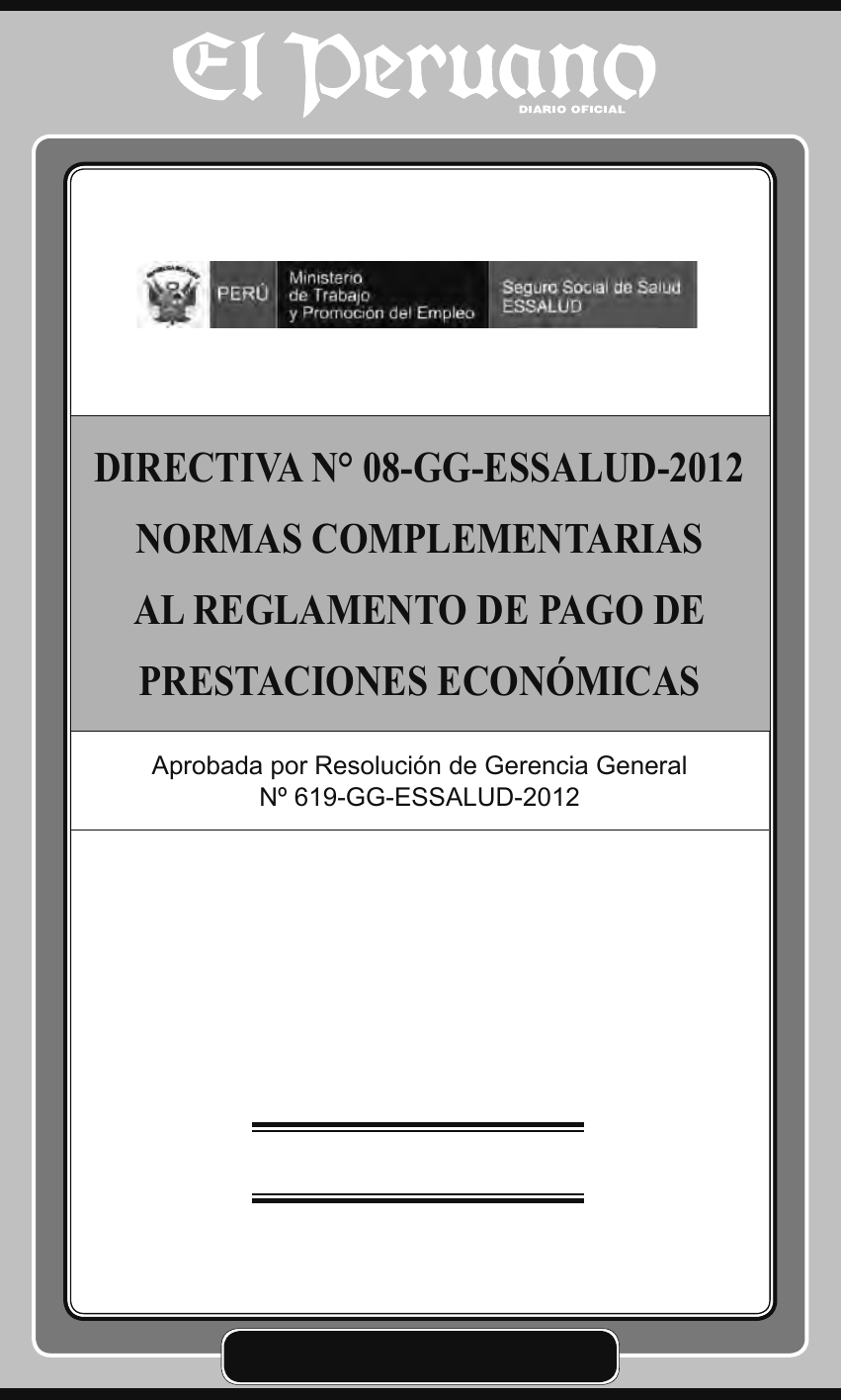SEPARATA ESPECIAL lunes 3 de diciembre de 2012 FUNDADO EN 1825 POR EL LIBERTADOR SIMÓN BOLÍVAR NORMAS LEGALES AÑO DE LA INTEGRACIÓN NACIONAL Y EL RECONOCIMIENTO DE NUESTRA DIVERSIDAD DIRECTIVA N° 08-GG-ESSALUD-2012 NORMAS COMPLEMENTARIAS AL REGLAMENTO DE PAGO DE PRESTACIONES ECONÓMICAS Aprobada por Resolución de Gerencia General Nº 619-GG-ESSALUD-2012 GERENCIA DE PRESTACIONES ECONOMICAS SUBGERENCIA DE NORMALIZACION Y CONTROL rosa1 Resaltado NORMAS LEGALES Lima, lunes 3 de diciembre de 2012Pág. 479884 El Peruano RESOLUCION DE GERENCIA GENERAL N° 619-GG-ESSALUD-2012 Lima, 16 de noviembre del 2012 VISTA: La Carta N° 1621-GCPEyS-ESSALUD-2012, a través de la cual la Gerencia Central de Prestaciones Económicas y Sociales remite el proyecto de Directiva “Normas Complementarias al Reglamento de Pago de Prestaciones Económicas”; y CONSIDERANDO: Que, el numeral 1.2 del artículo 1° de la Ley N° 27056, Ley de Creación del Seguro Social de Salud – ESSALUD, establece como fi nalidad de la Institución la de dar cobertura a los asegurados y sus derechohabientes, a través del otorgamiento de prestaciones de prevención, promoción, recuperación, rehabilitación, prestaciones económicas, y prestaciones sociales que corresponden al Régimen Contributivo de la Seguridad Social en Salud, así como otros seguros de riesgos humanos; Que, la Ley N° 26790, Ley de Modernización de la Seguridad Social en Salud y su Reglamento aprobado por Decreto Supremo N° 009-97-SA, establecen como prestaciones económicas los subsidios por incapacidad temporal, maternidad y lactancia y las prestaciones por sepelio; Que, el artículo 9° de la Ley N° 26790 señala que las prestaciones son brindadas mediante los servicios de ESSALUD o de otras entidades, estableciendo los Reglamentos, los requisitos, condiciones y procedimientos pertinentes; Que, el artículo 14° del Reglamento de la Ley 26790 indica que, las prestaciones económicas comprenden los subsidios por incapacidad temporal, maternidad, lactancia y las prestaciones por sepelio, añadiendo que ESSALUD establece la normatividad complementaria que contemple las diferentes circunstancias en el otorgamiento de las prestaciones económicas; Que el numeral 9.1 del artículo 9° de la Ley 27360, Ley que aprueba las Normas de Promoción del Sector Agrario, mantiene vigente el Seguro de Salud para los trabajadores de la actividad agraria en sustitución del Régimen de Prestaciones de Salud; Que, mediante Acuerdo de Consejo Directivo N° 58-14-ESSALUD-2011, se aprobó el Reglamento de Pago de Prestaciones Económicas y se facultó a la Gerencia General para que dicte las normas y procedimientos complementarios que permitan dar cumplimiento a dicho Acuerdo; Que, en este contexto normativo, resulta necesario actualizar las normas complementarias, así como aprobar los formularios necesarios para el otorgamiento y pago de las prestaciones económicas; Que, el literal b) del artículo 9° de la Ley N° 27056, establece que le compete al Gerente General dirigir el funcionamiento de la Institución, emitir las Directivas y los procedimientos internos necesarios, en concordancia con las políticas, lineamientos y demás disposiciones del Consejo Directivo y del Presidente Ejecutivo; Estando a lo expuesto, y en uso de las atribuciones conferidas; SE RESUELVE: 1. APROBAR la Directiva N° 08-GG-ESSALUD-2012 “Normas Complementarias al Reglamento de Pago de Prestaciones Económicas”, documento técnico que forma parte de la presente Resolución. 2. MODIFICAR los siguientes formularios y sus instrucciones, que se adjuntan a la presente Resolución: • Formulario 8001: Solicitud de Reembolso de Prestaciones Económicas • Formulario 8002: Solicitud de Pago Directo de Prestaciones Económicas 3. FACULTAR a la Gerencia Central de Prestaciones Económicas y Sociales a emitir las normas necesarias para la aplicación de la presente Directiva, así como las normas complementarias y/o modifi catorias de los formularios indicados en el numeral 2 de la presente Resolución. 4. DEJAR sin efecto la Directiva N° 009-GG-ESSALUD-2001 “Normas Complementarias al Reglamento de Pago de Prestaciones Económicas”, aprobada por Resolución de Gerencia General N° 248-GG-ESSALUD-2001, así como todas las normas que se opongan a la presente Resolución. REGÍSTRESE, COMUNÍQUESE Y PUBLÍQUESE RAMON HUAPAYA RAYGADA Gerente General rosa1 Resaltado NORMAS LEGALES El Peruano Lima, lunes 3 de diciembre de 2012 Pág. 479885 INDICE 1 OBJETIVO 2 FINALIDAD 3 BASE LEGAL 4 ALCANCE 5 RESPONSABILIDAD 6 CONCEPTOS DE REFERENCIA 7 DISPOSICIONES GENERALES 7.1 Requisitos para solicitar prestaciones económicas 7.1.1 Subsidio por incapacidad temporal 7.1.2 Subsidio por maternidad 7.1.3 Subsidio por lactancia 7.1.4 Prestación por sepelio 7.2 Certifi cación de las solicitudes de prestaciones económicas 7.3 Lugar y condiciones de presentación 7.4 Evaluación de las solicitudes de prestaciones económicas 7.5 Evaluación del comportamiento de pago de las entidades empleadoras 7.6 Casos especiales que se presentan en la evaluación de las solicitudes de prestaciones económicas 8 DISPOSICIONES ESPECÍFICAS SOBRE PRESTACIONES ECONÓMICAS 8.1 Disposiciones sobre subsidio por incapacidad temporal 8.1.1 Oportunidad para el pago del subsidio 8.1.2 Cálculo del monto del subsidio según tipo de asegurado 8.1.3 Inicio y duración del derecho al subsidio 8.1.4 Situaciones especiales para otorgar el subsidio 8.1.5 Extinción y pérdida del derecho del subsidio 8.1.6 Nulidad del derecho del subsidio 8.2 Disposiciones sobre subsidio por maternidad 8.2.1 Oportunidad para el pago del subsidio 8.2.2 Cálculo del monto del subsidio 8.2.3 Defi nición de afi liación al tiempo de concepción 8.2.4 Situaciones especiales para otorgar el subsidio 8.2.5 Extinción, pérdida y nulidad del derecho del subsidio 8.3 Disposiciones sobre subsidio por lactancia 8.3.1 Oportunidad para el pago del subsidio 8.3.2 Monto d