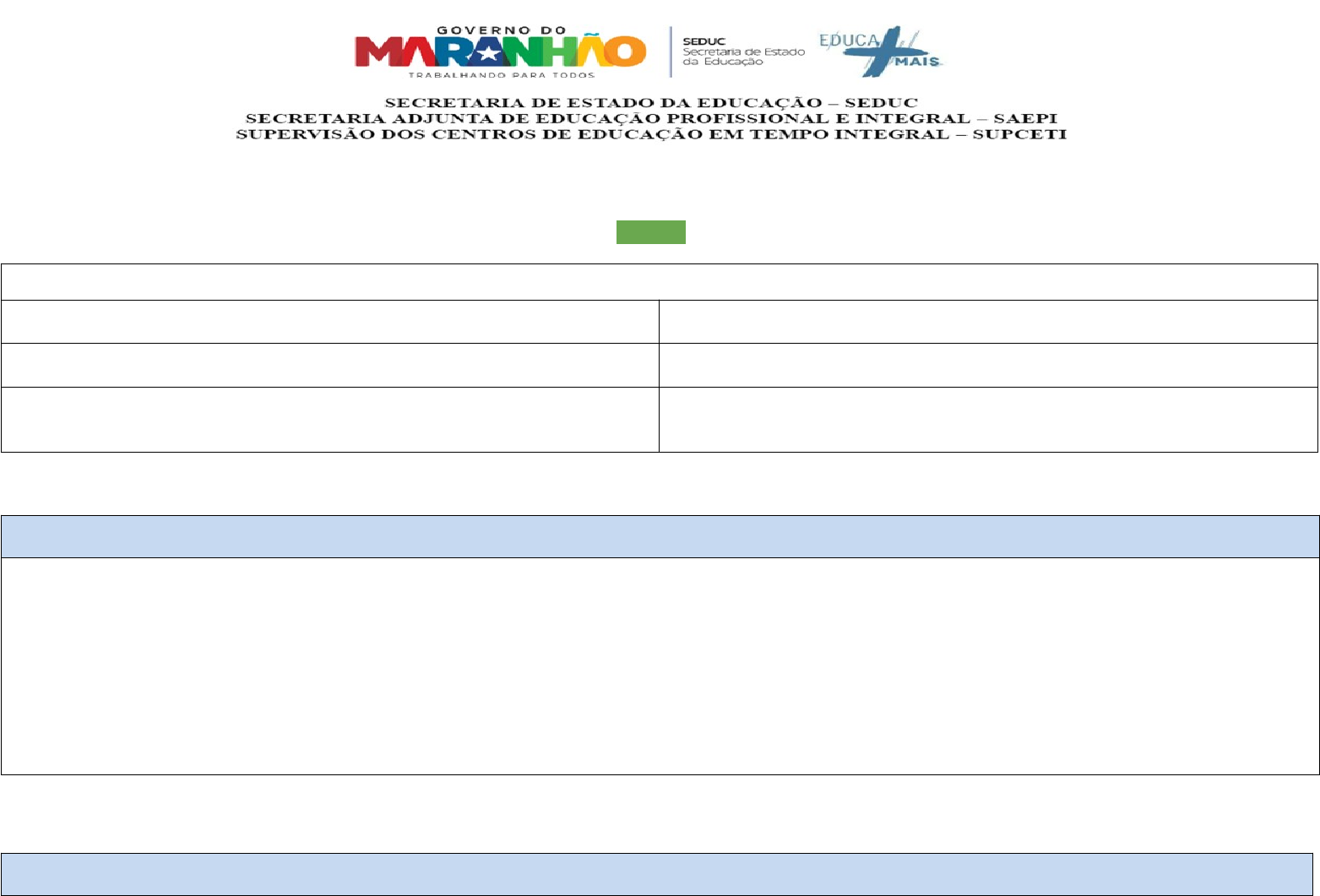PLANO DE ENSINO E DE APRENDIZAGEM ANUAL - 2024 - CENTRO EDUCA MAIS: ÁREA DE CONHECIMENTO: Linguagens, Códigos e suas Tecnologias COMPONENTE CURRICULAR: Arte CARGA HORÁRIA ANUAL: 40H PROFESSOR (A): Luis Fernando Lima Figueredo SÉRIE ( ) 1ª série ( x ) 2ª série ( ) 3ª série TURMAS: 200CNS, 200ETT e 200SEA Obs.: Esse Plano deve ser elaborado considerando o Caderno de Priorização Curricular dos Centros Educa Mais, visto os alinhamentos realizados com Documento Curricular para o Território Maranhense SEDUC/MA, e as Competências Gerais da Área e as Específicas do Componente Curricular (BNCC). COMPETÊNCIAS GERAIS DA ÁREA DE CONHECIMENTO · Valorizar e utilizar os conhecimentos sobre o mundo físico, social, cultural e digital; · Exercitar a curiosidade intelectual e utilizar as ciências com criticidade e criatividade; · Valorizar as diversas manifestações artísticas e culturais; · Agir pessoal e coletivamente com autonomia, reponsabilidade, flexibilidade, resiliência e determinação; · Conhecer-se, compreender-se na diversidade humana e apreciar-se; · Argumentar com base em fatos, dados e informações confiáveis; · Valorizar e apropriar-se de conhecimentos e experiências. QUADRO ORGANIZADOR CURRICULAR 1º PERÍODO LETIVO COMPETÊNCIA ESPECÍFICA HABILIDADES UNIDADE TEMÁTICA OBJETOS DE CONHECIMENTO / CONTEÚDOS SITUAÇÕES DIDÁTICO-PEDAGÓGICAS ESTRATÉGIAS DE AVALIAÇÃO Competências 1, 3 e 4 EM13LGG104 EM13LGG102 EM13LGG604 Artes Visuais Românica e Gótica. Renascimento; Maneirismo; Barroco; Neoclassicismo; Romantismo; Realismo. · Aulas expositivas dialogadas para abordagem teórica dos conteúdos propostos, com leituras e interpretações de textos. · Iniciaremos a aula através de uma conversa para analisar o conhecimento prévio que os alunos possuem, em seguida, apontar conceitos e características de cada conteúdo através de imagens e textos para desenvolver o senso crítico e a percepção visual dos alunos. · Promoção de debates e discussões acerca dos assuntos/conteúdos como contribuição para o entendimento do mesmo. · Aplicação de atividades e exercícios (individuais ou em grupos) que complementam, sistematicamente, a aprendizagem do conteúdo. A avaliação levará em consideração as três especificações descritas logo abaixo: AV1: Teste individual (questões objetivas); AV2: Trabalhos (individual e/ou coletivo): Relatórios de atividades, resolução de exercícios propostos pelo professor; participação nas aulas, autoavaliação, relatório de atividades de eletivas. AV3: Autoavaliação do estudante e avaliação das eletivas. 2º PERÍODO LETIVO COMPETÊNCIA ESPECÍFICA HABILIDADES UNIDADE TEMÁTICA OBJETOS DE CONHECIMENTO / CONTEÚDOS SITUAÇÕES DIDÁTICO-PEDAGÓGICAS ESTRATÉGIAS DE AVALIAÇÃO Competência 6 EM13LGG103 EM13LGG601 Teatro Teatro na Idade média; Renascimento e Barroco; Noções sobre caracterização, maquiagem, figurino, iluminação, espaço cênico, cenário. · Aulas expositivas dialogadas para abordagem teórica dos conteúdos propostos, com leituras e interpretações de textos. · Iniciaremos a aula através de uma conversa para analisar o conhecimento prévio que os alunos possuem, em seguida, apontar conceitos e características de cada conteúdo através de imagens e textos para desenvolver o senso crítico e a percepção visual dos alunos. · Promoção de debates e discussões acerca dos assuntos/conteúdos como contribuição para o entendimento do mesmo. - Aplicação de atividades e exercícios (individuais ou em grupos) que complementam, sistematicamente, a aprendizagem do conteúdo. A avaliação levará em consideração as três especificações descritas logo abaixo: AV1: Teste individual (questões objetivas); AV2: Trabalhos (individual e/ou coletivo): Relatórios de atividades, resolução de exercícios propostos pelo professor; participação nas aulas, autoavaliação, relatório de atividades de eletivas. AV3: Autoavaliação do estudante e avaliação das eletivas. 3º PERÍODO LETIVO COMPETÊNCIA ESPECÍFICA HABILIDADES UNIDADE TEMÁTICA OBJETOS DE CONHECIMENTO / CONTEÚDOS SITUAÇÕES DIDÁTICO-PEDAGÓGICAS ESTRATÉGIAS DE AVALIAÇÃO Competência 6 EM13LGG103 EM13LGG601 Dança Dança na Idade Média; Renascimento e Ópera; Balé e Balé de ação. · Aulas expositivas dialogadas para abordagem teórica dos conteúdos propostos, com leituras e interpretações de textos. · Iniciaremos a aula através de uma conversa para analisar o conhecimento prévio que os alunos possuem, em seguida, apontar conceitos e características de cada conteúdo através de imagens e textos para desenvolver o senso crítico e a percepção visual dos alunos. · Promoção de debates e discussões acerca dos assuntos/conteúdos como contribuição para o entendimento do mesmo. - Aplicação de atividades e exercícios (individuais ou em grupos) que complementam, sistematicamente, a aprendizagem do conteúdo. A avaliação levará em consideração as três especificações descritas logo abaixo: AV1: Teste individual (questões objetivas); AV2: Trabalhos (individual e/ou coletivo): Relatórios de atividades, resolução de exercícios propostos pelo professor; participação nas aulas, autoavaliação, relatório de atividades de eletivas. AV3: Autoavaliação do estudante e avaliação das eletivas. 4º PERÍODO LETIVO COMPETÊNCIA ESPECÍFICA HABILIDADES UNIDADE TEMÁTICA OBJETOS DE CONHECIMENTO / CONTEÚDOS SITUAÇÕES DIDÁTICO-PEDAGÓGICAS ESTRATÉGIAS DE AVALIAÇÃO Competência 6 EM13LGG602 EM13LGG703 Música História da música: Barroco; Classicismo; Romantismo; Século XX. · Aulas expositivas dialogadas para abordagem teórica dos conteúdos propostos, com leituras e interpretações de textos. · Iniciaremos a aula através de uma conversa para analisar o conhecimento prévio que os alunos possuem, em seguida, apontar conceitos e características de cada conteúdo através de imagens 