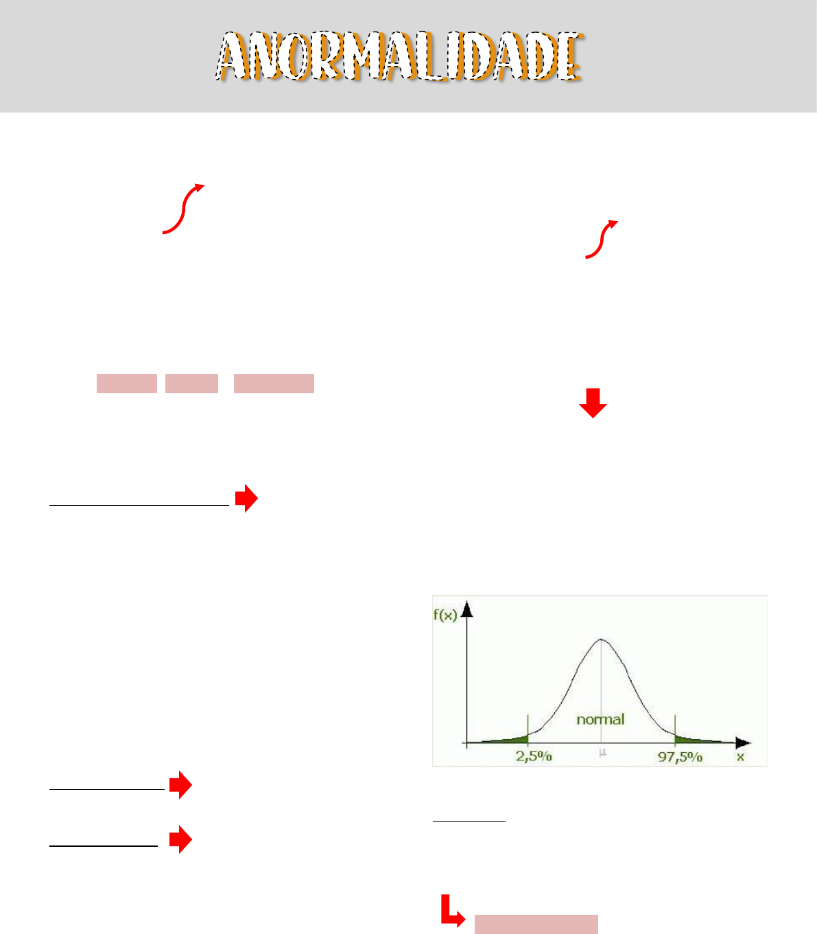Tipos de Dados - As aferições clínicas produzem três tipos de dados: nominais, ordinais e intervalares. Dados Nominais - São dados organizados em categorias e que não possuem uma ordem inerente. Dados nominal dicotômico divididos em duas categorias. Dados Ordinais - Possuem uma ordem inerente ou hierarquia; - O tamanho dos intervalos entre as categorias não é especificado. Dados Intervalares - Há uma ordem inerente e o intervalo entre os valores é igual, independentemente do onde esteja na escala; Dados Contínuos assumem qualquer valor em um continuum (números fracionados). Dados discretos assumem somente valores específicos (números inteiros) e são expressos como contagens. - Os critérios de anormalidade variam de acordo com a questão clinica que está sendo avaliada. Anormal = INCOMUM Baseado na Estatística - Anormal são aqueles que ocorrem com menor frequência Ponto de Corte entre Normal e Anormal Limitações - A maioria das aferições biológicas não possuem distribuição normal. - A frequência de todas as doenças seriam a mesma, caso considerássemos como distribuição normal. Por que diferenciar o Normal e Anormal? Tomada de decisões em relação ao diagnóstico, prognóstico e tratamento Frequência de uma determinada característica em uma população definida - Todos os valores além de 2 desvios-padrão da média são anormais. - Baseado na Distribuição Normal (simétrica e unimodal). - 2,5% das observações apareceriam em cada cauda da distribuição e seriam consideradas anormalmente altas ou anormalmente baixas. Descrever os valores anormais como uma fração ou percentil da distribuição real - Sem relação entre o grau de raridade estatística e doença clínica. - Valores extremos podem ser benéficos. Anormal = DISFUNÇÃO BIOLÓGICA - Limitações Doenças bem definidas e tratáveis não tem correlatos biológicos bem definidos. Descrição da Doença 1. O processo biológico da doença não é claro e a doença é referida como sinais e sintomas. 2. A doença é definida como uma anormalidade da estrutura e função do organismo. 3. A etiologia da doença é bem compreendia com relação aos mecanismos biológicos e a doença é referida como uma causa específica. - Em casos em que o entendimento dos mecanismos biológicos é parcial e não há uma medida adequada, os diagnósticos das disfunções biológicas são feitos por meio de testes biológicos combinadas com sinais e sintomas. Anormal = DOENÇA - Distribuição das medidas em dois grupos: (I) grupo de doentes e (II) grupo de não doentes. - Pode haver uma sobreposição dos grupos quando compara duas distribuições de frequência. Anormal = TRATÁVEL - Se o paciente não puder ser ajudado com o tratamento que melhore a sua saúde, pode haver mais danos que benefícios - A definição de risco é útil quando houver boas condições terapêuticas que melhore a condição de saúde da pessoa. Exemplos - Suplementação de Ácido Fólico durante a gestação. Mesmo que a gestante não apresente carência do ácido fólico durante a gravidez é essencial fazer essa suplementação para os benéficos que ela causa para o feto, pois reduz o risco de malformações, protege a saúde do tubo neural, reduz o risco de pré-eclâmpsia - Suplementação de vitamina D: verificar as condições/estilos de vida do paciente. Relação entre a doença e o contexto que está sendo analisado Para algumas aferições, os desvios do normal estão associados com doença em um grau importante somente em valores bastantes extremos Mecanismos Biológicos Anormais Medidas Biológicas Usada na Prática Clínica Seriam o suficiente para definir os critérios de doença Somente alguns critérios oferecem uma clara distinção entre doença e não doença Definição de um ponto de corte que separa claramente os dois grupos. Nem toda condição confere risco aumentado que pode ser tratado com sucesso. E eliminação da condição não confere a eliminação do risco - A própria condição não é a causa da doença - Já ocorreu danos irreversíveis.