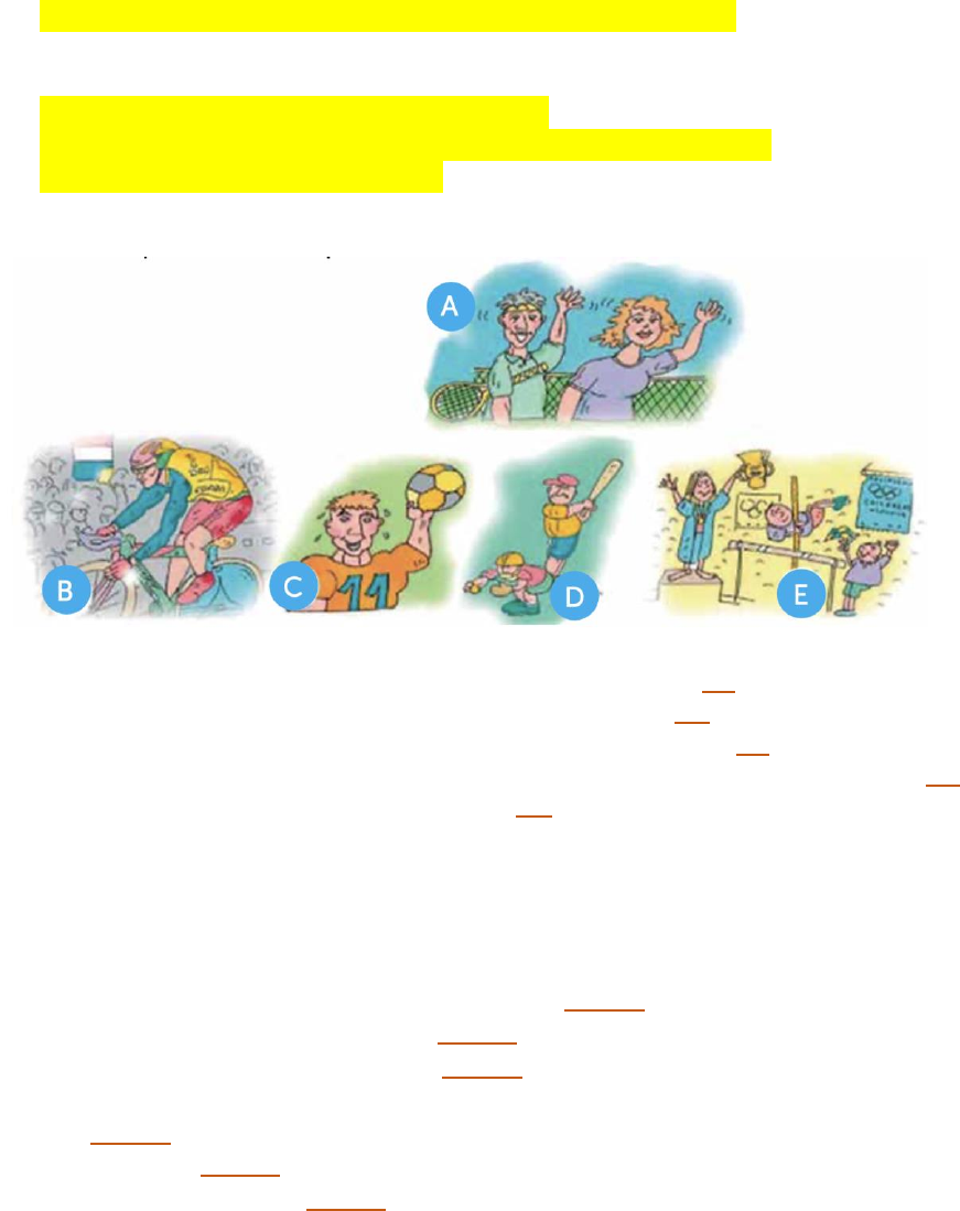 Unit 4: Sports Class Activity Sports a. Highlight the sentences you expect to hear in a sports report. 1. Sven Erickson is going to win this year’s tennis championship. 2. The Prime Minister is visiting the United Nations today. 3. The Russian ballet is performing in New York this week. 4. The London marathon started this morning. 5. Tonight is the big football match between Everton and Liverpool. 6. That’s all the sports news tonight! b. Match the pictures to the reports 1. “In soccer, Bill Brown had the best game of his career.” (_C_) 2. “The Tour de France bicycle race started yesterday.” (_B_) 3. “In California, the Children’s Olympics started yesterday.” (_E_) 4. “Tonight is the big tennis match between rock star Maxi and Peter Anson.” (_A_) 5. “In baseball, Toronto won first place.” (_D_) Let’s go swimming! c. Here are two more friends talking about sports. Number the sentences in the correct order. • Oh. Then why don’t we play tennis instead? (___5____) • Yes, that’s a good idea. Let’s go! (___6____) • Let’s go swimming this morning. (___1____) • Because Suzy said she is going swimming today and I don’t want to see her. (___4____) • Why not? (___3____) • Ah, I don’t think so. (___2____) Comparison adjectives d. Read Peter Anson’s account of his latest tennis match with rock star Maxi. Fill in the blanks with the correct form of adjectives. “Last week’s tennis match with Maxi was the (1) _the most unfair_ (unfair) match I’ve ever played! That ball she hit was out! I’m a much (2) _better_ (good) player than her and everyone knows it! In fact, people say I’m (3) _the best_ (good). Maxi is just a beginner. She can’t hit the ball (4) _faster than_ (fast) me. She’s the (5) _worst_ (bad) player I’ve ever seen! So, anyone who thinks that she really won that match is (6) _dumber_ (dumb) than a donkey!” e. You and your partners are trying to decide which sports to do at the local sports club. Use the comparative forms of the words below to discuss the different sports in the pictures. Decide on three sports that you want to do. 1.Swimming is more exciting than basketball. 2.Basketball is harder than swimming because it requires more physical strength. 3.Weightlifting is more difficult than tai chi.