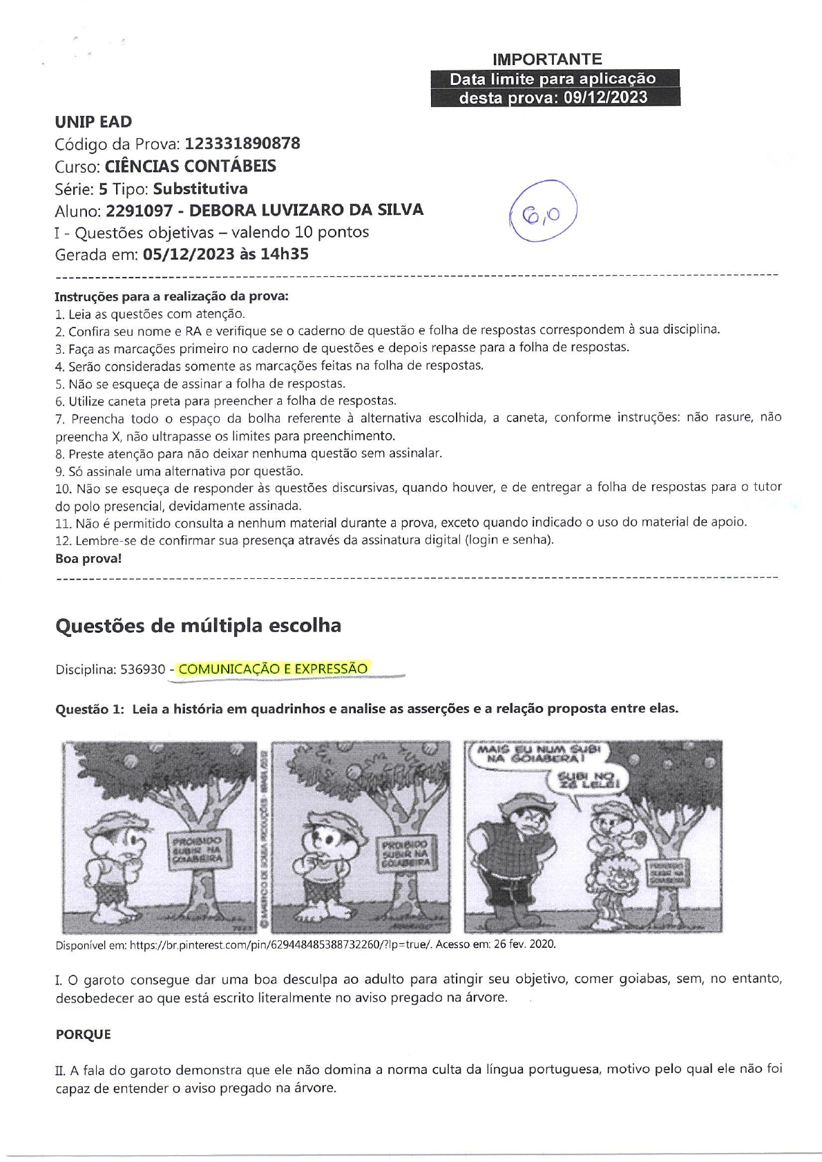 IMPORTANTE desta prova: 09/12/2023 UNIP EAD Código da Prova: 123331890878 Curso: CIÊNCIAS CONTÁBEIS Série: 5 Tipo: Substitutiva Aluno: 2291097 - DEBORA LUVIZARO DA SILVA I - Questões objetivas — valendo 10 pontos Gerada em: 05/12/2023 às 14h35 Instruções para a realização da prova: 1. Leia as questões com atenção. 2. Confira seu nomee RAe verifique se o caderno de questão e folha de respostas correspondem à sua disciplina. 3. Faça as marcações primeiro no caderno de questões e depois repasse para a folha de respostas. 4. Serão consideradas somente as marcações feitas na folha de respostas. 5. Não se esqueça de assinar a folha de respostas. 6. Utilize caneta preta para preencher a folha de respostas. 7. Preencha todo o espaço da bolha referente à alternativa escolhida, a caneta, conforme instruções: não rasure, não preencha X, não ultrapasse os limites para preenchimento. 8. Preste atenção para não deixar nenhuma questão sem assinalar. 9. Só assinale umaalternativa por questão. 10. Não se esqueça de responder às questões discursivas, quando houver, e de entregar a folha de respostas para o tutor do polo presencial, devidamente assinada. 11. Não é permitido consulta a nenhum material durante a prova, exceto quando indicado o uso do material de apoio. 12. Lembre-se de confirmar sua presença através da assinatura digital (login e senha). Boa prova! Questões de múltipla escolha Disciplina: 536930 - Questão 1: Leia a história em quadrinhos e analise as asserções e a relação proposta entre elas. Disponível em: https://br.pinterest.com/pin/629448485388732260/?lp=true/. Acesso em: 26 fev. 2020. I. O garoto consegue dar uma boa desculpa ao adulto para atingir seu objetivo, comer goiabas, sem, no entanto, desobedecer ao que está escrito literalmente no aviso pregado na árvore. PORQUE IL A fala do garoto demonstra que ele não domina a norma culta da língua portuguesa, motivo pelo qual ele não foi capaz de entendero aviso pregado na árvore. Assinale a alternativa correta: A) As duas asserções são verdadeiras, e a segunda justifica a primeira. B) As duas asserções são verdadeiras, e a segunda não justifica a primeira. D) A primeira asserção é falsa, e a segunda é verdadeira. E) As duas asserções são falsas. Questão 2: Considere o texto e as afirmativas. Caro Paulo boa tarde! Escrevo para confirmar a minha presença na reunião da próxima quinta-feira, às 15h. Segue anexoas cópias dos documentos solicitados. Atenciosamente, Ricardo. “1 O texto apresenta elementos constitutivos do gênero, como vocativo, despedida e assinatura. «Í IL Há problemas de pontuação no texto, comoa falta de vírgula depois de “Paulo”. «II Há erro de concordância, pois o correto é "seguem anexas”. É correto o quese afirma em: ô e I, apenas. C) Ie TI, apenas. D) Ie, apenas. E) 1, apenas. Questão 3: Leia o texto e analise as afirmativas. Revista do Programa de Estudos Pós-Graduados em Literatura e Crítica Literária da PUC-SP nº 23 - dezembro de 2019 httpi/fdx doi org/10.23925/1983-4373 201923m24-4! A escrita (do) impossível em À hora da estrela Writing (the) impossible in À hora da estreta Pasdiah Rosenteman"* RESUMO Esse artigo propõe-se a discutir os embates narrativos entre o narrador Rodrigo S.M. ca personagem Macabéa, no romance A hora da estrela, de Clarice Lispector, à luz de uma fundante impossibilidade que rondaria a obra: como dar forma a um ser impossivel de ser apreendido pelas palavras? O acesso a Macabéa se mostra opaco « problemático, do mesmo modo como o próprio narrador se desconhece no processo de desvendamento desse outro esquivo. A partir dessa premissa, pretende-se observar o jogo em que se movem narrador, personagem, escritora e leitor. A “delicada e vaga existência de Macabéa”, nas palavras do narrador, acaba por desafiar uma escrita dividida entre o imperativo da expressão verbal e a carência da linguagem. O que resta desse contito entre o objeto provocativo da esentura e a dificuldade em dizê-lo é, paradoxalmente, um excesso de indagações, hesitações e peripécias narrativas. A presente leitura convoca noções psicanaliticas para compreender algumas faces desse vasto campo de sentidos. PALAVRAS CHAVE: Ahora da estrela, Excesso, Carência, Escrita impossivel «4 1. O texto analisa o romancede Clarice Lispector e, por isso, tem estrutura narrativa. « IO texto pertence ao gênero artigo científico. TELA linguagem do texto é formal e predomina nele a função emotiva da linguagem. É correto o que se afirma em: A)IelI apenas. ) Ie II apenas. CO) Ie TI, apenas. Biel. Questão 4: Considere o trecho a seguir e analise as afirmativas. As quatro amostras de morango testadas apresentaram resíduos de agrotóxicos. Em metade, as substâncias encontradas não são autorizadas no cultivo dessa fruta. Em uma dessas, foi verificado resíduos acima do limite máximo permitido. O teste reitera a classificação da Anvisa, após testes do Programa Análise de Resíduos de Agrotóxicos em Alimentos (PARA), de que o morangoé o segundo produto com maior teor de agrotóxicos. Assim como nas amostras de morango, 100% das amostras de soja continham resíduosde pesticidas. Disponível em: https://www proteste.org.br/alimentacao/seguranca-alimentar/noticia/teste-identifica-alto-teor-de-pesticidas-em-alimentos. Acesso em: 26 fev. 2020. I Trata-se de um texto argumentativo sobre o uso de agrotóxicos na agricultura brasileira. =! II. Há um erro de concordância no trecho "foi verificado resíduos acima do limite máximo permitido”.
