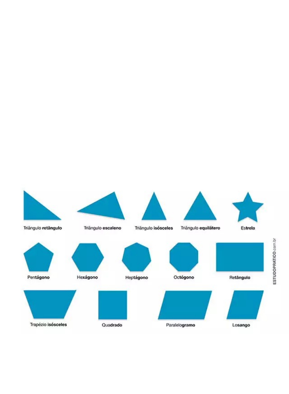 O que é um polígono? Para que uma figura geométrica seja considerada polígono ela deve possuir, pelo menos, 3 lados e satisfazer as seguintes condições: Possuir linha fechada simples Linha fechada simples é um segmento de reta que não se encontrada alinhado com outra reta, e que se fecham. Possuir segmento de reta O segmento de reta é delimitado por dois pontos. Possuir região interna plana O polígono é bidimensional, ou seja, tem duas dimensões. E que possui região interna. Portanto, polígono é uma linha fechada simples que possui região interna e é formada apenas por segmentos de reta. Todos os polígonos possuem os seguintes elementos: lados, vértices e ângulos. Elementos que compõem um polígono – Lado: o lado de um polígono é um segmento de reta. – Vértice: é representado por um ponto sendo formado pela intersecção de dois segmentos de reta. – Ângulo: é a região interna formada pela a intersecção de dois segmentos de reta. O ângulo é medido em graus (º). Exemplos Tipos de polígonos Os polígonos são classificados pelo número de lados que possui. Existem diferentes tipos, dentre eles vamos destacar: Triângulos São polígonos que possuem três lados, ou seja, três segmentos de reta. Quadriláteros São polígonos formados por quatro segmentos de reta possuindo quatro lados. Classificação de 1 a 20 Polígonos irregulares Nos polígonos irregulares nem todos os lados possuem o mesmo comprimento, assim como nem todos os ângulos internos possuem a mesma medida. Exemplos: Retângulo Possui todos os ângulos internos com a mesma medida, mas somente os lados paralelos possuem o mesmo comprimento. Triângulo isósceles Os ângulos internos da base possuem a mesma medida e dois de seus lados possuem o mesmo comprimento. Paralelogramo Os lados opostos e os ângulos opostos possuem a mesma medida. Polígonos regulares Os polígonos regulares são figuras planas que possui todos os lados iguais, ou seja, com mesmo comprimento e todos os ângulos internos possuem a mesma medida. Hexágono, pentágono, quadrado e triângulo equilátero são exemplos de polígonos regulares. Polígonos convexo e côncavo Diferenciamos um polígono convexo de côncavo ao traçarmos uma reta que passará pelo polígono. Se a reta interceptar o polígono em mais de dois pontos, isso significa que o polígono é côncavo, caso essa reta intercepte o polígono em dois pontos no máximo, significa que o polígono é convexo. Exemplos: