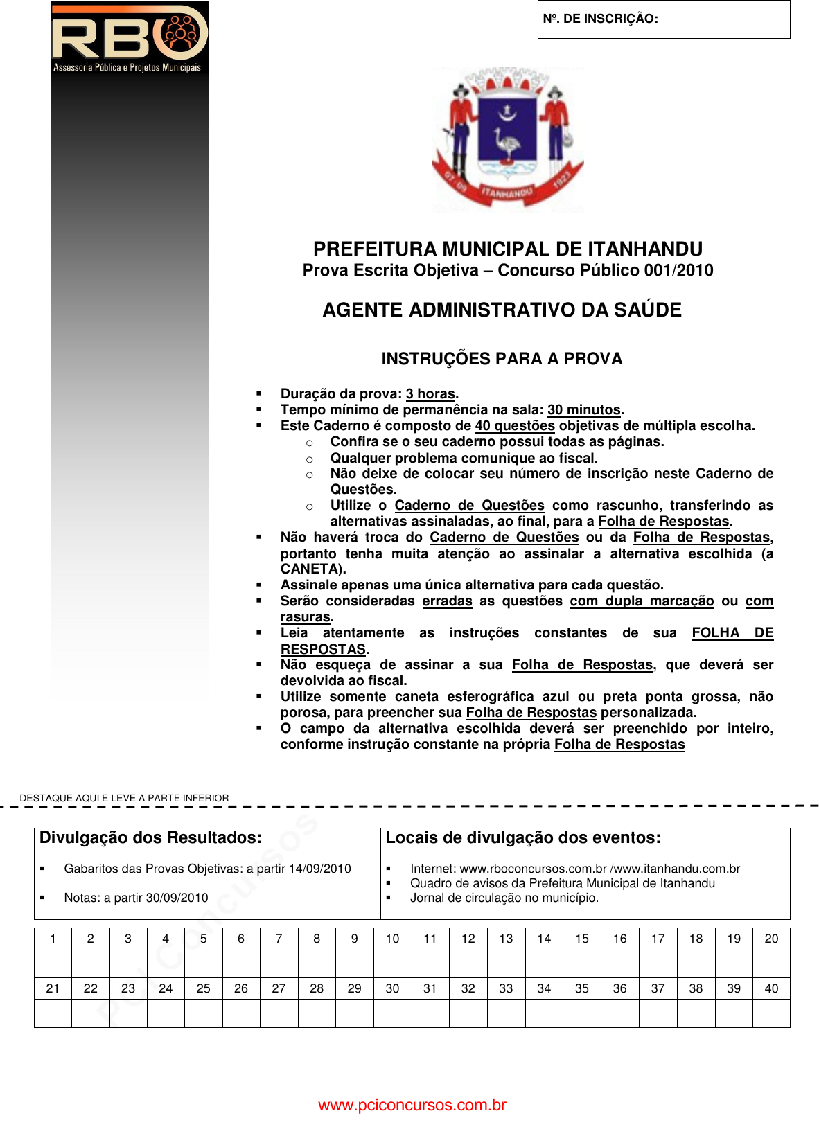 pcimarkpci MDAwMDowMDAwOjAwMDA6MDAwMDowMDAwOmZmZmY6YjEzNTo4NTdl:V2VkLCAyOCBGZWIgMjAyNCAxOTowNToxMyAtMDMwMA== www.pciconcursos.com.br Nº. DE INSCRIÇÃO: PREFEITURA MUNICIPAL DE ITANHANDU Prova Escrita Objetiva – Concurso Público 001/2010 AGENTE ADMINISTRATIVO DA SAÚDE INSTRUÇÕES PARA A PROVA � Duração da prova: 3 horas. � Tempo mínimo de permanência na sala: 30 minutos. � Este Caderno é composto de 40 questões objetivas de múltipla escolha. o Confira se o seu caderno possui todas as páginas. o Qualquer problema comunique ao fiscal. o Não deixe de colocar seu número de inscrição neste Caderno de Questões. o Utilize o Caderno de Questões como rascunho, transferindo as alternativas assinaladas, ao final, para a Folha de Respostas. � Não haverá troca do Caderno de Questões ou da Folha de Respostas, portanto tenha muita atenção ao assinalar a alternativa escolhida (a CANETA). � Assinale apenas uma única alternativa para cada questão. � Serão consideradas erradas as questões com dupla marcação ou com rasuras. � Leia atentamente as instruções constantes de sua FOLHA DE RESPOSTAS. � Não esqueça de assinar a sua Folha de Respostas, que deverá ser devolvida ao fiscal. � Utilize somente caneta esferográfica azul ou preta ponta grossa, não porosa, para preencher sua Folha de Respostas personalizada. � O campo da alternativa escolhida deverá ser preenchido por inteiro, conforme instrução constante na própria Folha de Respostas DESTAQUE AQUI E LEVE A PARTE INFERIOR Divulgação dos Resultados: � Gabaritos das Provas Objetivas: a partir 14/09/2010 � Notas: a partir 30/09/2010 Locais de divulgação dos eventos: � Internet: www.rboconcursos.com.br /www.itanhandu.com.br � Quadro de avisos da Prefeitura Municipal de Itanhandu � Jornal de circulação no município. 1 2 3 4 5 6 7 8 9 10 11 12 13 14 15 16 17 18 19 20 21 22 23 24 25 26 27 28 29 30 31 32 33 34 35 36 37 38 39 40 www.pciconcursos.com.br pcimarkpci MDAwMDowMDAwOjAwMDA6MDAwMDowMDAwOmZmZmY6YjEzNTo4NTdl:V2VkLCAyOCBGZWIgMjAyNCAxOTowNToxMyAtMDMwMA== www.pciconcursos.com.br pcimarkpci MDAwMDowMDAwOjAwMDA6MDAwMDowMDAwOmZmZmY6YjEzNTo4NTdl:V2VkLCAyOCBGZWIgMjAyNCAxOTowNToxMyAtMDMwMA== www.pciconcursos.com.br AGENTE ADMINISTRATIVO DA SAÚDE - Página 1 CONHECIMENTOS BÁSICOS: PORTUGUÊS Uma vida abaixo do tolerável Crianças vivendo em bueiros: um triste retrato da miséria nas ruas do Rio de Janeiro. A orla da Praia de Ipanema é um dos metros quadrados mais caros do Rio de Janeiro. O vaivém dos turistas, os coqueiros na areia, as redes de vôlei lotadas e o mar deslumbrante fazem do lugar também um dos mais charmosos da cidade. Por isso é que a cena flagrada num domingo ensolarado, às nove e meia da manhã, causou espanto. Um menino saía de um bueiro. Ele não estava brincando com amigos nem fazendo travessura. Morava com seis outras crianças debaixo da Avenida Vieira Souto, endereço de artistas, empresários e outros endinheirados da cidade. Havia dois meses eles se abrigavam 1 metro abaixo do chão, em um túnel extenso e relativamente largo (de 2 metros), mas frio e úmido. Quando não estava espremido debaixo da terra, o grupo de meninos de rua circulava pedindo dinheiro, furtando turistas e amedrontando a vizinhança. A cena é motivo de indignação por uma razão adicional: trata-se de um flagelo urbano que, mesmo sem ser ainda numeroso, já se incorporou à paisagem do Rio de Janeiro. Não é sequer a primeira vez que isso ocorre em Ipanema. Em março do ano passado, 25 pessoas foram surpreendidas quando saíam de uma tubulação em um local não muito distante dali. O grupo anterior também havia transformado a galeria em abrigo, mas com uma diferença. Daquela vez, o bueiro era equipado com colchonetes, cobertores, televisão e aparelho de som, que sugeriam uma estranha comodidade. Descoberto, o grupo foi removido. O mesmo já aconteceu em Copacabana, no centro. Situações como essa se repetem, e não escolhem protagonistas. Há, no centro do Rio, uma população que dorme quase todas as noites sob marquises por falta de dinheiro para o transporte até os bairros mais distantes depois que encerra o trabalho. Depois do flagrante, as galerias foram vedadas e educadores da prefeitura passaram a acompanhar o grupo. Mas são medidas paliativas. Esse tipo de flagelo urbano ocorre em boa parte das cidades do mundo. O exemplo mais conhecido e também o mais contrastante é o da cidade de Nova York. Um censo realizado recentemente constatou que aproximadamente 845 pessoas habitam as galerias do metrô da cidade. A maior parte são alcoólatras, viciados em drogas e doentes mentais. Alguns conseguem até mesmo regalias, como luz elétrica e água quente. Há casos de famílias numerosas que dispõem de “confortos” como eletrodomésticos, equipamentos eletrônicos e divisão em cômodos. Em 1985, no filme Subway (metrô, em inglês – observação nossa), o personagem fugindo de uma perseguição, abrigou- se nos subterrâneos do metrô de Paris, onde encontrou moradores com uma cultura própria, recheada de personagens excêntricos, vivendo à margem da sociedade parisiense. A cena carioca é em tudo diferente. Não há charme nenhum em menores vivendo e se drogando em bueiros. As autoridades municipais cariocas anunciaram, na semana passada, providências que incluem estruturas de concreto, tampas de ferro e barras de aço – algo que, com certeza, se torna necessário. Entretanto, nunca é demais enfatizar, a vida de uma parte da população nos buracos da cidade não é um mero problema de engenharia. Adaptado de artigo publicado na Revista Veja, de 08 de junho de 2009, de autoria de Roberta Salomone. 1. Segundo o texto, por qual razão a cena do garoto saindo do bueiro causou espanto? a) Porque foi flagrada às nove e meia da manhã de um domingo ensolarado. b) Incomodava o fato do garoto e seus companheiros estarem brincando em um local público. c) Pelo motivo d