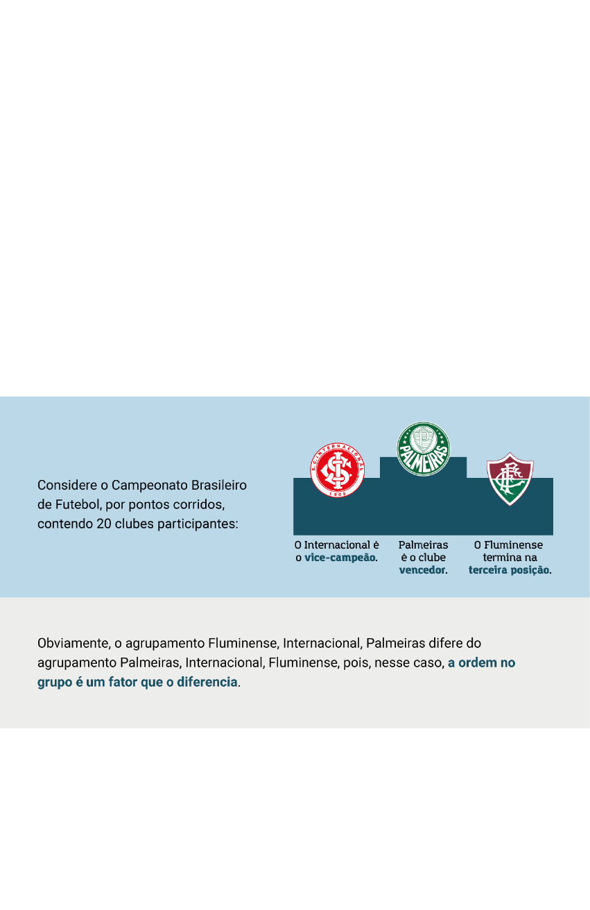 Exercício de Fixação - Permutações e arranjos Um dos campos de aplicação da análise combinatória é a probabilidade e estatística, que lida com o acaso e a incerteza de forma sistemática. Para calcular a probabilidade de ocorrência de um evento, é necessário algum conhecimento de contagem. O conceito clássico de probabilidade foi desenvolvido em relação aos jogos de azar e se aplica quando os casos possíveis são igualmente prováveis. Pode-se dizer que, se há n possibilidades igualmente prováveis, das quais uma deve ocorrer, e s são consideradas como favoráveis (ou sucesso), a probabilidade de sucesso é dada por P = s/n. A contagem entra justamente na procura do número de possibilidades n. É importante salientar que, dependendo do contexto do problema, a procura de n pode ser dada por arranjo, permutação ou combinação. Inspirados no contexto histórico do surgimento da ideia de probabilidade, confira, neste Desafio, um exemplo de campeonato de futebol, uma vez que, ao longo do campeonato, diversos “bolões” são feitos na tentativa de acertar quem será o campeão. A partir disso, suponha a seguinte situação: Com base no contexto, responda: a) Considerando os 20 clubes participantes, determine o número total de possibilidades para os três primeiros colocados. b) Suponha que, no início do campeonato, você fez uma aposta com um amigo e escreveu em um papel os nomes das equipes campeã, vice e terceira colocada. Sabendo que a probabilidade é dada por P = s/n, onde n é o total de possibilidades e s é o número de possibilidades de sucesso, qual é a probabilidade de você acertar quem foram os três primeiros colocados? a) O número total de possibilidades para os três primeiros colocados entre os 20 clubes participantes é dado pelo arranjo de 20 opções tomadas de 3 em 3, que é calculada por 20×19×18 = 6.840. b) A probabilidade de acertar os três primeiros colocados, considerando 20 clubes participantes, é 1. Ao trabalhar com problemas de contagem, é fundamental identificar se o problema envolve arranjo, permutação ou combinação. No caso dos arranjos e permutações, a ordem é importante, ao passo que, nas combinações, não importa a ordem dos elementos do agrupamento. O que difere um arranjo de uma permutação é que a permutação utiliza todos os elementos do conjunto. Nesse contexto, sabendo que há cinco carros para serem estacionados em cinco vagas, determine de quantas maneiras eles podem ser estacionados. Você acertou! D. 120. O primeiro carro tem cinco opções para estacionar; o segundo, tem quatro; o terceiro, tem três; o quarto, duas; o quinto, apenas uma. Logo, as possibilidades são: 5! = 5. 4. 3. 2. 1 = 120. 2. Na análise combinatória, o princípio fundamental da contagem afirma que, se um procedimento P tem uma sequência de estágios S1, S2, ⋯, Sn e somente se cada um ocorre, respectivamente, de r1, r2, ⋯ rn maneiras. Então, o número de maneiras em que o procedimento P ocorre é r1∙r2 ∙⋯∙rn. Com base no exposto, considere que, em um baile de dança, há 10 moças e 10 rapazes. Determine de quantas maneiras eles podem formar pares para uma dança. Você acertou! E. 3.628.800. Na solução, nota-se que a primeira moça tem 10 possibilidades para escolher um par; a segunda, nove, e assim sucessivamente, de modo que a décima terá apenas uma escolha. Assim, pelo princípio multiplicativo, existem: P10 = 10! = 10 x 9 x 8 x 7 x 6 x 5 x 4 x 3 x 2 x 1 = 3.628.800 possibilidades de esses pares serem formados. 3. Na análise combinatória, um arranjo de n elementos tomados p a p são os agrupamentos ordenados que se podem formar com p dos n elementos envolvidos. Já as permutações são usadas quando todos os n elementos serão utilizados no agrupamento ordenado. Considere que os alunos de uma escola estão programando a tão esperada formatura de 3º ano. Para organizar todo o evento, será eleita uma comissão entre os alunos e dez candidataram-se para ocupar os cargos de presidente e vice-presidente. Determine de quantas maneiras diferentes essa escolha poderá ser realizada. Você acertou! C. 90. 4. Em problemas de contagem, dizemos que, se a ordem dos agrupamentos é um fator importante, estamos diante de um caso de arranjo. Por isso, antes de resolver um problema, é útil selecionar um agrupamento qualquer e inverter a ordem para verificar se ela importa ou não. Sendo assim, considere as letras a, b, c e d. Determine quantos agrupamentos ordenados diferentes de duas letras distintas é possível formar com as quatro letras. Você acertou! C. 12. Note que há quatro possibilidades para a primeira posição, pois são quatro elementos disponíveis. Para a segunda posição, são três possibilidades, uma vez que há apenas três elementos disponíveis. Os 12 agrupamentos ordenados diferentes são: ab, ac, ad ba, bc, bd ca, cb, cd da, db, dc. Esses agrupamentos são denominados de arranjos simples. Arranjaram-se quatro elementos, 2 a 2, e o número desses arranjos foi 12. Escreve-se, então: A4,2 = 4 x 3 = 12 (lê-se: arranjo de quatro, tomados 2 a 2, é igual a 12). 5. Uma das aplicações da análise combinatória é descobrir a quantidade de senhas distintas que podem ser formadas com determinado número de caracteres. Considere que você precisa escolher uma senha contendo cinco letras e que não há distinção entre letras maiúsculas e minúsculas. Determine quantas senhas de cinco letras distintas é possível formar com as 15 primeiras letras do alfabeto brasileiro. Você acertou! D. 360.360.