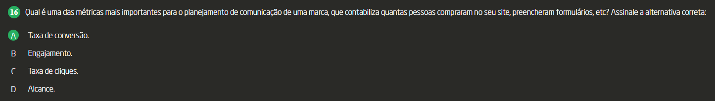 Qual é uma das métricas mais importantes para planejamento de comunicação de uma marca, que contabiliza quantas pessoas compraram no seu site, preencheram formulários, etc? Assinale a alternativa correta: A Taxa de conversão. B Engajamento. C Taxa de cliques. D Alcance.