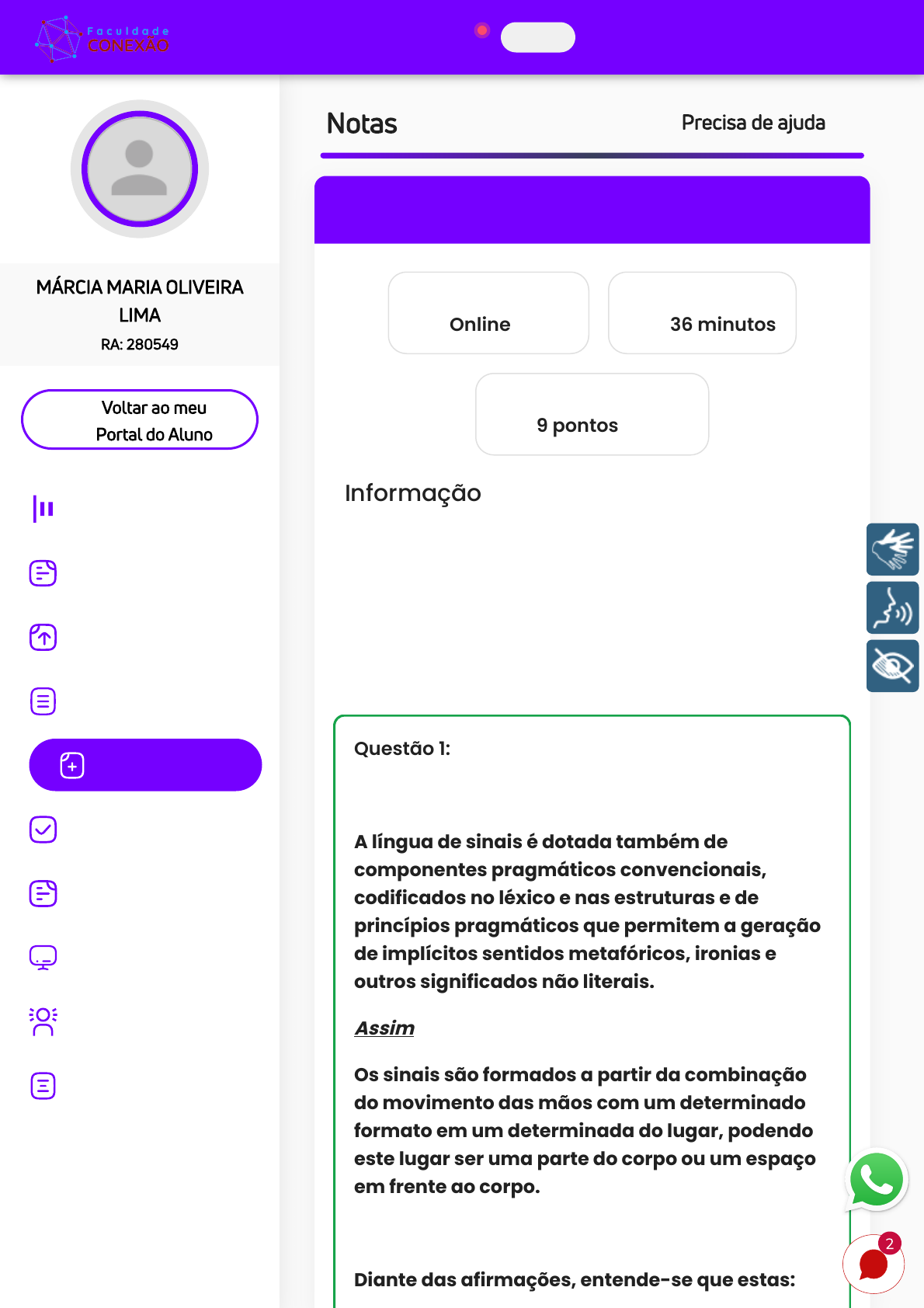 Notas Precisa de ajuda Rever Avaliação Linguística e Libras Tipo de avaliação Online Tempo utilizado 36 minutos Sua nota de avaliação 9 pontos Informação A contestação da questão poderá ser feita em até 7 dias após a realização da avaliação, clicando em "contestar questão", após este prazo não será mais permitido realizar a contestação. Descreva o porquê não concorda com o gabarito de cada questão baseando-se no material didático fornecido. Questão 1: A língua de sinais é dotada também de componentes pragmáticos convencionais, codificados no léxico e nas estruturas e de princípios pragmáticos que permitem a geração de implícitos sentidos metafóricos, ironias e outros significados não literais. Assim Os sinais são formados a partir da combinação do movimento das mãos com um determinado formato em um determinada do lugar, podendo este lugar ser uma parte do corpo ou um espaço em frente ao corpo. Diante das afirmações, entende-se que estas: Voltar ao meu Portal do Aluno MÁRCIA MARIA OLIVEIRA LIMA RA: 280549 Início Carteirinha Estudantil Disciplinas Avaliações Minhas Notas Agenda Educacional TCC Curso Preparatório Simulados Biblioteca Sair 2 https://alunos.institutoprominas.com.br/meus-cursos https://ava.institutoprominas.com.br/dashboard https://ava.institutoprominas.com.br/carteirinha-estudante https://ava.institutoprominas.com.br/disciplines https://ava.institutoprominas.com.br/atividades https://ava.institutoprominas.com.br/notas https://ava.institutoprominas.com.br/agenda-educacional javascript:; https://ava.institutoprominas.com.br/preparatorio https://ava.institutoprominas.com.br/simulados javascript:; https://alunos.institutoprominas.com.br/ https://alunos.institutoprominas.com.br/ https://alunos.institutoprominas.com.br/ https://ava.institutoprominas.com.br/ Sua Resposta: As duas afirmações são verdadeiras. Resposta correta: As duas afirmações são verdadeiras. Questão 2: Segundo Quadros (2004), refere-se à tradução como um complemento da interpretação, outros autores, como Capovilla (2001), apresentam a ideia de que a tradução e interpretação são conceitos que remetem a tarefas distintas, pois traduzir está ligado a abordar uma língua para outra, trabalhando com textos escritos ou não, por sua vez interpretar está ligado à tarefa de versar de uma língua para outra nas relações interpessoais. Assinale a alternativa correta. Sua Resposta: Interpretação parte da língua oral tradução de uma língua escrita. Resposta correta: Interpretação parte da língua oral tradução de uma língua escrita. Questão 3: Ouvintes e surdos se alfabetizam de maneiras diferentes. Os ouvintes se alfabetizam pelo som, crianças surdas se alfabetizam pelo contato visual, elas processam seus pensamentos por meio dos sinais. As crianças surdas apresentam os mesmos estágios do desenvolvimento da linguagem de uma criança ouvinte, dessa forma, entendemos que o processo de aquisição da linguagem e da alfabetização independe de a criança ser surda ou ouvinte. O que diferencia esse processo é que, em relação ao aluno surdo, ele deve ser alfabetizado primeiramente na sua língua materna, a língua de sinais. Segundo Magna Soares (2003, p.37), “diferentes usos da escrita dependem de práticas e valores culturais.” Essa aquisição da linguagem permite o desenvolvimento de uma função em especial. Destaque a função CORRETA: Sua Resposta: Linguísticas. Resposta correta: Linguísticas. Questão 4: Analise as sentenças abaixo e responda: Segundo Vygotsky (1998), é necessário investir o máximo possível no potencial formador da linguagem como instrumento de comunicação e formação. Assim A mediação desenvolve campos de percepção, memória, raciocínio, sentimentos e regulação de comportamento. Sua Resposta: As duas afirmações são verdadeiras. Resposta correta: As duas afirmações são verdadeiras. Questão 5: Sabemos que a língua de sinais trata-se de uma língua visuoespacial, para tanto, seu processo de aquisição precisa respeitar o espaço, é fundamental entender também que os sistemas linguísticos de sinais apresentam-se de maneira independente das línguas orais, composto com regras gramaticais próprias que utilizam os espaços e recursos visuais. Quando o sujeito consegue produzir gestos icônicos ao seu desejo, porém essa produção gestual, esse processo acontece por correlações entre o que visualmente lhe é apresentado, atrelado à necessidade comunicativa da criança. Essa descrição corresponde a: Sua Resposta: Estágio dos sinais. Resposta correta: Estágio dos sinais. Questão 6: Observe as informações e assinale a alternativa correta. Para interagir com os outros, o ser humano expressa seu pensamento através da linguagem, para isso, usa uma língua. Por isso A língua é constituída de uma gramática própria com estrutura e forma próprias, é importante destacar que esta é viva, transforma-se e se complementa, constantemente, e, por esse motivo, é natural que exista um distanciamento, por vezes, entre o que é prescrito pelas normas de uma gramática tradicional e o que é efetivamente utilizado por seus falantes. Sua Resposta: As duas afirmações são verdadeiras. Resposta correta: As duas afirmações são verdadeiras. Questão 7: No decorrer da luta acerca do ensino bilíngue para surdos, no dia 11 de setembro de 1880, houve uma votação vitoriosa a favor de métodos orais na educação de surdos, a partir de então, a língua de sinais foi proibida oficialmente, alegando que ela destruía a habilidade da oralização das pessoas surdas. Assinale a alternativa a qual corretamente destina o nome desse evento de 1880 e o período que marca a educação dos surdos. Sua Resposta: Congresso de Milão marca o período do oralismo. Resposta correta: Congresso de Milão marca o período do oralismo. Questão 8: O Decreto de Lei 5.626, ampara a modalidade bilíngue que amp