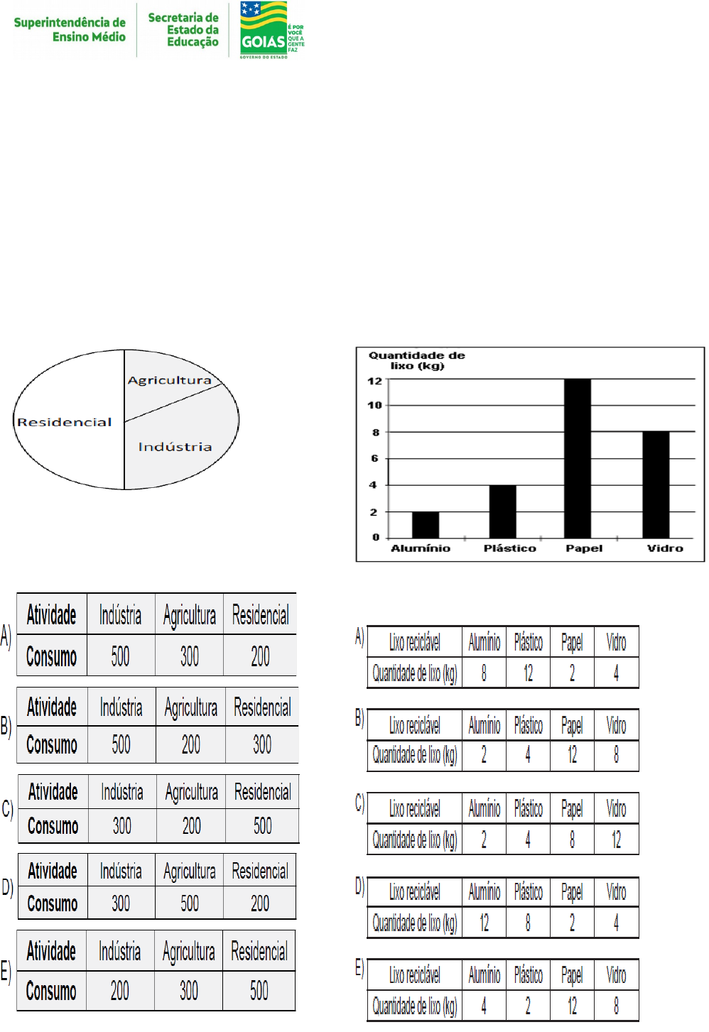 ATIVIDADE DE MATEMÁTICA COLÉGIO ESTADUAL JÚLIO MOREIRA DE MOURA ALUNO(A): DATA: 01/12/21 PROFESSORA: SÉRIE: 3º ATIVIDADE 01 (Seape-Adaptada) Para uma campanha de uso racional da água, a prefeitura de “Terra Branca” anotou o consumo de água por setor em um mês e obteve o gráfico a seguir. O quadro que melhor corresponde a esse gráfico, em que o consumo de água está representado em milhões de m3 por mês, é ATIVIDADE 02 (PAEBES-Adaptada) O gráfico, a seguir, mostra a quantidade de lixo reciclável descartado por uma família em uma semana. O quadro que representa esses dados é 03-A tabela, a seguir, mostra a distribuição dos gastos médios, per capita, com saúde, segundo os grupos de idade. Qual dos gráficos representa a distribuição dada pela tabela acima? ATIVIDADE 04 O gráfico, a seguir, apresenta a taxa de analfabetismo brasileira de 1998 a 2003. Veja esta situação representada no gráfico, a seguir, em percentual. A tabela que deu origem ao gráfico é a seguinte: GABARITO Atividade 01 – C Atividade 02 – B Atividade 03 – E Atividade 04 – C