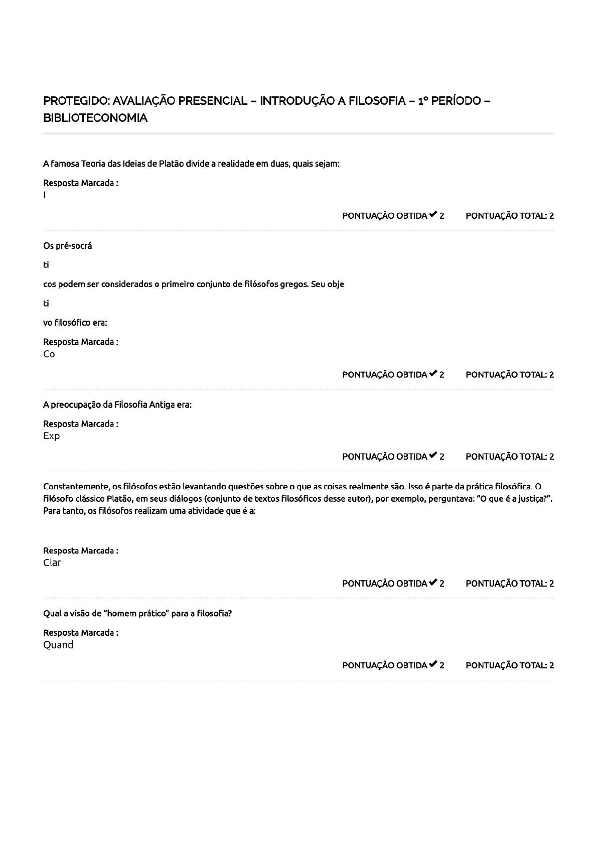 Impresso por PAULO FILHO, E-mail paulofilho175@gmail.com para uso pessoal e privado. Este material pode ser protegido por direitos autorais e não pode ser reproduzido ou repassado para terceiros. 20/07/2023, 18:35:59 25/08/2020 Course Status – Centro Universitário Faveni https://ava.unifaveni.com.br/course-status/ 1/4 Inteligível e Sensível. Compreender a origem da vida. Explicar a natureza. Claricação. Quando o homem reconhece somente os bens materiais. Impresso por PAULO FILHO, E-mail paulofilho175@gmail.com para uso pessoal e privado. Este material pode ser protegido por direitos autorais e não pode ser reproduzido ou repassado para terceiros. 20/07/2023, 18:35:59 25/08/2020 Course Status – Centro Universitário Faveni https://ava.unifaveni.com.br/course-status/ 2/4 Cosmológicos. 3; 2; 1; 4. A losoa contemporânea busca uma abordagem prática, com o intuito de resolver problemas sociais, melhorando a vida da população. Ética. Impresso por PAULO FILHO, E-mail paulofilho175@gmail.com para uso pessoal e privado. Este material pode ser protegido por direitos autorais e não pode ser reproduzido ou repassado para terceiros. 20/07/2023, 18:35:59 25/08/2020 Course Status – Centro Universitário Faveni https://ava.unifaveni.com.br/course-status/ 3/4 Não existe unanimidade a respeito do conceito de educação de qualidade. Questões junto com respostas alternativas. Saber radical. Morrendo, Sócrates acreditava que não "abriria mão" de uma vida justa. O foco na liberdade incondicional defende a tese de que o ser humano é livre por excelência; argumenta que o homem é detentor de uma liberdade moral que transcende os determinismos. Descobrir a verdade universal. Impresso por PAULO FILHO, E-mail paulofilho175@gmail.com para uso pessoal e privado. Este material pode ser protegido por direitos autorais e não pode ser reproduzido ou repassado para terceiros. 20/07/2023, 18:35:59 25/08/2020 Course Status – Centro Universitário Faveni https://ava.unifaveni.com.br/course-status/ 4/4 …é objeto de inevitáveis disputas conceituais. O amor pela sabedoria. Tales de Mileto. Explica a relação contemporânea entre o homem e o trabalho. A losoa não é uma ciência porque não busca fatos. Total