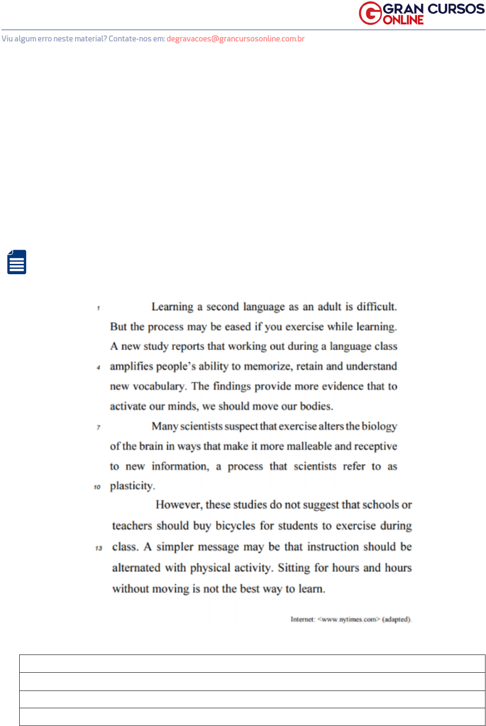 1 www.grancursosonline.com.br Viu algum erro neste material? Contate-nos em: degravacoes@grancursosonline.com.br Prova Certo ou Errado II INGLÊS A N O TA ÇÕ E S PROVA CERTO OU ERRADO II Seguindo sugestão do professor, o ideal é primeiro responder as questões que aparen- tam ser mais fáceis ou que podem ser respondidas mais rápido. Nesse caso, como há um texto, recomenda-se responder primeiro as questões que mencionam termos e linhas especí- ficas, para só depois responder aquelas que precisam da leitura de um trecho maior do texto, demandando mais tempo. Por esse motivo e seguindo esse critério, as questões serão aqui respondidas em ordem misturada, não linear. Em provas de concursos, o maior problema geralmente são as ques- tões de interpretação de texto, que demandam uma leitura crítica, reflexiva. DIRETO DO CONCURSO (CESPE–CEBRASPE/CBM–AL/2017) 2 www.grancursosonline.com.br Viu algum erro neste material? Contate-nos em: degravacoes@grancursosonline.com.br Prova Certo ou Errado II INGLÊS A N O TA ÇÕ E S Based on the text above, judge the following itens. 5. In the context, the word “However” (L. 11) expresses the idea of contrast. COMENTÁRIO • Um sinônimo de “expresses” recorrente em provas é o verbo “convey” (“transmitir”, “expressar”); • A palavra “however” já nos faz lembrar de marcadores discursivos, conectores, e se traduz como “contudo”, sendo parte do grupo que expressa “opposition”, “contrast” (ex.: “alto e baixo”, “claro e escuro”); • A frase na qual está inserido o “however”, no terceiro e último parágrafo, tem a seguinte tradução: “Contudo, esses estudos não sugerem que escolas ou professores devam comprar bicicletas para alunos para se exercitarem durante a aula”; • Para confirmar essa ideia de contraste, pode-se voltar e ler o período anterior (segundo parágrafo), que diz: “Muitos cientistas suspeitam que o exercício altera a biologia do cérebro em maneiras que o tornam mais maleável e receptivo a nova informação, um processo que os cientistas denominam plasticidade”. 4. The word “amplifies” (L. 4) could be correctly replaced by increases. COMENTÁRIO • O enunciado diz: “A palavra ‘amplifies’ (L.4) pode ser corretamente substituída por increases”. “Increase” significa “aumentar”, passando a mesma ideia de “amplifie” (“amplificar”); • A frase na qual a palavra está inserida tem a seguinte tradução: “Um novo estudo afirma que praticar exercício durante uma aula de idiomas amplifica a capacidade das pessoas de memorizar, reter e entender novas palavras” e faz total sentido substituir “amplifies” por “increases”. 3. Scientists use the term “plasticity” (L. 10) to describe the process through which the brain becomes incapable of acquiring a second language. 5m 3 www.grancursosonline.com.br Viu algum erro neste material? Contate-nos em: degravacoes@grancursosonline.com.br Prova Certo ou Errado II INGLÊS A N O TA ÇÕ E S COMENTÁRIO • “Cientistas usam o termo ‘plasticidade’ (L. 10) para descrever o processo através do qual o cérebro se torna incapaz de adquirir uma segunda língua”, diz a questão; • O grande problema dessa questão está no prefixo de negação “in-” em “incapable”, sem o qual a frase faria mais sentido; basta reler o segundo parágrafo, do qual a pala- vra “plasticity” faz parte e que fora traduzido na resolução da questão 5. 1. It can be inferred from the text that students must go the gym instead of attending classes. COMENTÁRIO • Essa questão de inferência é do tipo subentendimento, pressuposição, e traz uma conclusão provável à qual se deve chegar – ou não – através da análise dos indí- cios textuais; • A conclusão provável dada pela questão é a de que “alunos devem ir para a aca- demia ao invés de comparecer às aulas”. “Instead of” é um conector que significa “ao invés de”; “attend” significa “comparecer”, “frequentar”; e “must” passa a ideia de necessidade; • Um escaneamento no texto em busca de termos similares a “gym” e “classes”, pala- vras-chave nessa questão, nos leva inicialmente à terceira frase do primeiro parágrafo, traduzida na resposta da questão 4, que ainda não nos dá condições de chegar à con- clusão aqui esperada; • No mesmo parágrafo primeiro, há a frase “As descobertas fornecem mais evidência de que para ativar nossas mentes, nós devemos movimentar nossos corpos”, informação complementar que ainda não nos permite concluir que se deve ir sim para a academia e não para as aulas. 2. The author suggests that exercising our bodies is important for keeping our minds active. 10m 4 www.grancursosonline.com.br Viu algum erro neste material? Contate-nos em: degravacoes@grancursosonline.com.br Prova Certo ou Errado II INGLÊS A N O TA ÇÕ E S COMENTÁRIO • Essa é uma questão de pressuposição e diz: “O autor sugere que exercitar nossos corpos é importante para manter nossas mentes ativas”; • Costumamos ouvir a frase “Corpo são, mente sã”, o que está em concordância com o que diz o texto, especificamente na última frase do primeiro parágrafo. (CESPE–CEBRASPE/TELEBRAS/2015) According to the text above, judge the following itens. 30. In the text, “to put your money where your mouth is” (L. 3 and 4) can be correctly re- placed by to act on your outspoken beliefs, although this change results in a more formal text. COMENTÁRIO • O enunciado da questão diz no trecho final, a respeito da substituição de termos pro- posta: “embora esta mudança resulte em um texto mais formal”; 15m 5 www.grancursosonline.com.br Viu algum erro neste material? Contate-nos em: degravacoes@grancursosonline.com.br Prova Certo ou Errado II INGLÊS A N O TA ÇÕ E S • O período do qual faz parte o trecho citado na questão tem a seguinte tradução: “Se você 