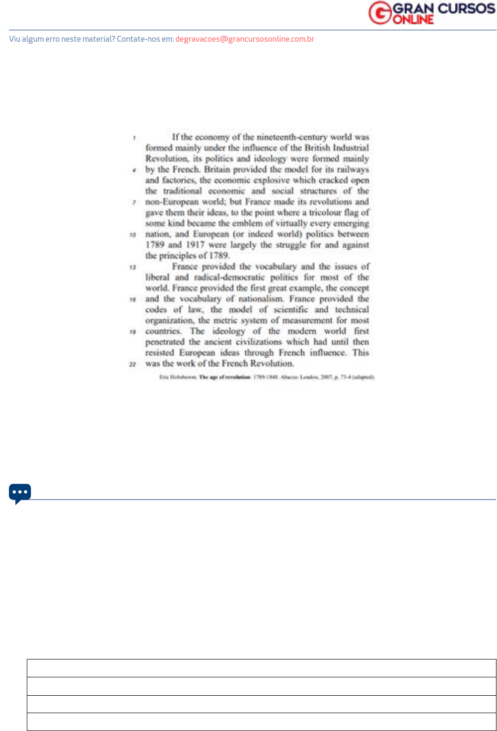 1 www.grancursosonline.com.br Viu algum erro neste material? Contate-nos em: degravacoes@grancursosonline.com.br Prova Certo ou Errado XVII INGLÊS A N O TA ÇÕ E S PROVA CERTO OU ERRADO XVII (CESPE–CEBRASPE/2019) Judge the following items based on the text presented above. 8. The Industrial Revolution is mentioned to emphasize the relevance of the French Revo- lution, the text’s main topic. COMENTÁRIO • A questão diz: “A Revolução Industrial é mencionada com a finalidade de enfatizar a relevância da Revolução Francesa, o principal tópico do texto”; • Observe que ao longo do texto há várias menções à França (“France”) e aos franceses (“French”); • A tradução do início do primeiro parágrafo do texto é: “Se a economia do século XIX era constituída principalmente sob a influência da Revolução Industrial britânica, sua política e ideologia foram formadas principalmente pelos franceses. Os britânicos for- 2 www.grancursosonline.com.br Viu algum erro neste material? Contate-nos em: degravacoes@grancursosonline.com.br Prova Certo ou Errado XVII INGLÊS A N O TA ÇÕ E S neceram o modelo de suas ferrovias e indústrias, a explosão econômica que expôs a estrutura social e econômica tradicional do mundo não europeu; mas a França produ- ziu suas revoluções e deu a elas suas ideias, ao ponto em que uma bandeira tricolor se tornou um símbolo de aparentemente todo país emergente, e a política europeia entre 1789 e 1917 era grandemente uma luta a favor e contra os princípios de 1789”; • O segundo parágrafo se traduz como: “A França forneceu o vocabulário e as questões de política democrática-radical e liberal para a maior parte do mundo. A França forne- ceu o primeiro grande exemplo, o conceito e o vocabulário de nacionalismo. A França forneceu os códigos de direito, o modelo de organização científica e técnica, o sistema métrico de medição para a maioria dos países. A ideologia do mundo moderno inicial- mente penetrou civilizações antigas que até então tinham resistido às ideias europeias por meio da influência francesa. Esse foi o trabalho da Revolução Francesa”; • Embora de fato o texto trate principalmente da Revolução Francesa, não se pode afir- mar que a Revolução Industrial britânica é citada apenas para enfatizar sua relevância. 9. The French Revolution was an important element in the dissemination of European ide- als around the world. COMENTÁRIO O enunciado da questão tem a seguinte tradução: “A Revolução Francesa foi um importan- te elemento na disseminação dos ideais europeus ao redor do mundo”. 10. The French Revolution changed not only political structures but also the language used to refer to politics. COMENTÁRIO • “A Revolução Francesa mudou não somente as estruturas políticas, mas também a língua usada para se referir a política”, diz a questão; • Essa informação pode ser encontrada no texto da linha 13 à 16. 5m 10m 3 www.grancursosonline.com.br Viu algum erro neste material? Contate-nos em: degravacoes@grancursosonline.com.br Prova Certo ou Errado XVII INGLÊS A N O TA ÇÕ E S 11. The text would still be correct and coherent if the second paragraph began like this: Still, France provided. COMENTÁRIO • Em Português, a questão significa: “O texto ainda estaria correto e coerente se o segundo parágrafo começasse desta forma: Apesar disso, a França forneceu”; • A palavra “still” significa “apesar disso” (“despite that”) e “ainda”; nessa questão, expressa a ideia de oposição, contraste, tendo a primeira tradução; • Se iniciarmos o segundo parágrafo com o conector “still”, será preciso analisar se há um contraste de ideias entre o que diz pelo menos o trecho final do primeiro parágrafo e a parte inicial do segundo parágrafo, o que não há; • “Indeed”, na linha 10, significa “de fato”. 12. The pronoun “its”, in lines 3, 4, and 7, refers to “the British Industrial Revolution” (L. 2 and 3). COMENTÁRIO • Traduzindo o enunciado: “O pronome ‘its’, nas linhas 3, 4 e 7, se refere à ‘Revolução Industrial britânica’ (L. 2 e 3)”; • O primeiro “its” (linha 3) tem como referente “o mundo do século XIX”, sendo desne- cessário conferir os demais pronomes. 13. In line 5, “cracked open” can be correctly replaced by revealed. COMENTÁRIO Essa questão foi anulada. 14. The expression “the principles of 1789” (L. 12) means the principles of the French Revolution. 15m 4 www.grancursosonline.com.br Viu algum erro neste material? Contate-nos em: degravacoes@grancursosonline.com.br Prova Certo ou Errado XVII INGLÊS A N O TA ÇÕ E S COMENTÁRIO O comando da questão diz: “A expressão ‘the principles of 1789’ (L. 12) significa os princí- pios da Revolução Francesa”. Judge the following items about the poem above. 15. From the text, it is correct to infer that, at least for some people, believing that they are special demands courage. COMENTÁRIO • A questão, que é de inferência, quer saber se a informação dada pode ser uma conclu- são provável; • A tradução do enunciado é: “Do texto, é correto inferir que, pelo menos para algumas pessoas, acreditar que elas são especiais exige coragem”; • Traduzindo o texto, temos: “Ouse acreditar / os sussurros em seus ouvidos, / que você pode ser especial, / que você pode ser importante, / que um dia / você pode mudar o mundo. / Somos nós, perceba, / aqueles que ouvem / que mudarão tudo”; • “Dare” significa “ousar” e equivale à ideia de “tenha coragem”; • No fim do texto, “aqueles que ouvem que mudarão tudo” não são todos e isso foi expresso na questão em “pelo menos para algumas pessoas”, visto que se trata de uma conclusão provável, um subentendimento, uma inferência. 20m 5 www.grancursosonline.com.br Viu algum erro neste material? Contate-nos em: degravacoes@g