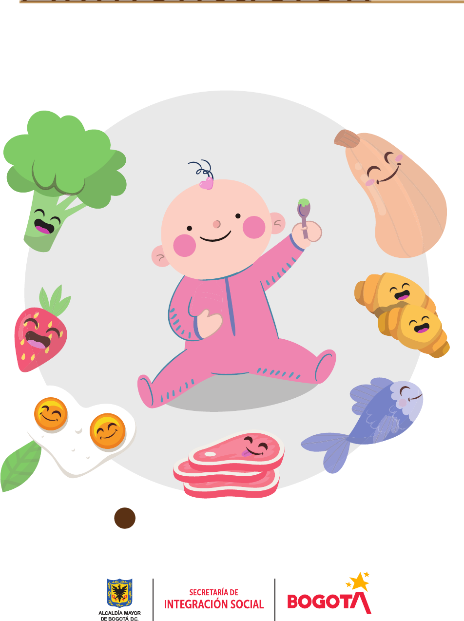 Alimentación durante el primer año, esencial para toda la vida Alimentación De los 6 meses al año, el inicio ideal Alimentación Complementaria ALCALDÍA MAYOR DE BOGOTÁ D.C. ©SECRETARÍA DISTRITAL DE INTEGRACIÓN SOCIAL Carrera 7 No. 32-12 Torre Sur, Bogotá PBX: 327 9797 www.integracionsocial.gov.co ISBN: 978-958-8923-20-8 Alcaldesa Mayor de Bogotá Claudia López Hernández Secretaria Distrital de Integración Social Xinia Navarro Prada Subsecretaria Constanza Gómez Romero Director de nutrición y abastecimiento Aura Elizabeth Gómez Subdirectora de Nutrición (E) Ana Julieta Pulido Serrano Oficina Asesora de Comunicaciones Alejandro Borráez Contreras Diseño, diagramación y corrección de estilo Oficina Asesora de Comunicaciones Gráficas e ilustraciones: www.freepik.es Subdirección de nutrición Patricia Andrea Aguiar Guzmán, Luz Stella Hidalgo Neira. Con aportes de: Claudia Patricia Roncancio, Viviana Catherine Villegas, Omaida Ayala Cavanzo, Yulied Sánchez Ortiz, Jeny Tatiana Bolívar. Desde la Secretaría Distrital de Integración Social estamos comprometidos con el bienestar de nuestros niños y niñas, por ello, construimos esta cartilla con el fin de dar a conocer la importancia de la alimentación durante el primer año de vida y una guía práctica para introducir de manera adecuada los alimentos, a partir de los 6 meses de edad. Adicionalmente, brindamos herramientas claves para el inicio de la alimentación complementaria a partir de los 6 meses, y explicamos las pautas de alimentación perceptiva y recomendaciones de alimentos que se deben brindar durante esta etapa de vida y que son esenciales para el adecuado crecimiento y desarrollo de los niños y niñas. Sabemos que para ustedes como padres y cuidadores de niños y niñas menores de un año, es muy importante la información aquí descrita, ya que es una gran oportunidad para fortalecer sus conocimientos, lo cual se verá reflejado Presentación: de su hijo en el futuro. bienestar y salud en el ¿Qué es alimentación complementaria? La alimentación durante los primeros años de vida es fundamental para un adecuado crecimiento y desarrollo y para forjar hábitos de vida saludable en las diferentes etapas, que lleven a los niños a convertirse en adultos sanos. La alimentación complementaria es aquella que se ofrece a partir del sexto mes de vida, como complemento de la leche materna que el niño ha tomado de manera exclusiva durante este tiempo. La lactancia materna se continúa ofreciendo hasta los 2 años o más junto con los alimentos sugeridos en esta cartilla. Junto con la lactancia materna, la alimentación complementaria debe aportar la energía y nutrientes necesarios para asegurar el adecuado crecimiento y desarrollo de los niños, desde los 6 meses de edad. Estos se garantizan ofreciendo variados alimentos naturales sin adición de sal o azúcar. Recordemos que: Es el alimento ideal durante los seis primeros meses de vida. Aporta la energía y nutrientes necesarios durante esta etapa y sustancias protectoras contra enfermedades, además, no tiene costo y es natural. La Organización Mundial de la Salud recomienda brindar lactancia materna hasta los 2 años o más.* La leche materna 4 * La lactancia materna exclusiva para niños y niñas prematuros es recomendada hasta los 6 meses de edad corregida. De acuerdo a la Organización Mundial de la Salud (OMS), a partir de los 6 meses es importante tanto la calidad, como la variedad de los alimentos que se ofrecen. Brindar una alimentación perceptiva a través del adecuado acompañamiento y supervisión de un adulto responsable, contribuye a una mejor aceptación por parte del niño o la niña. A continuación detallaremos pautas de cómo hacerlo. Reconocer y respetar las señales de hambre y saciedad, alimentando a los niños y niñas directamente y asistiendo a los niños mayores cuando comen por sí solos, teniendo presente sus necesidades y nivel de desarrollo, ofreciendo alimentos más frecuentemente y en pequeñas cantidades. Ante el rechazo a los alimentos recurrir a diversas combinaciones, sabores y texturas. Evitar las distracciones durante las horas de comida como pantallas (celulares, tabletas, televisor y otros similares) y videojuegos. Lavar previamente las manos del niño y permitir el contacto directo con los alimentos, como forma de aprendizaje, recordando que los momentos de alimentación deben ser espacios de tranquilidad, motivación y socialización. 5 Alimentación perceptiva Animar a los niños a comer, brindando los alimentos despacio y pacientemente, sin forzarlos. Tómese su tiempo. Prácticas claves para el desarrollo de la alimentación perceptiva 1 2 3 4 5 Recomendaciones para iniciar Siente al niño o niña, en una silla que quede frente a usted. Ofrezca pequeñas cantidades del alimento; si lo rechaza puede volver a ofrecerlo al día siguiente hasta que vaya conociendo su sabor. Teniendo en cuenta los alimentos que tiene en casa, prefiera prepararlos de manera natural, evitando incluir productos industrializados o listos para preparar. Ofrezca agua a partir de los seis meses de vida, es una excelente fuente de hidratación para calmar la sed, evite jugos o bebidas azucaradas. No adicione sal, azúcar, panela o miel a las preparaciones que se van a ofrecer a los niños y niñas a partir de los 6 meses y hasta el año de edad. A medida que el niño va creciendo, vaya aumentando la frecuencia de alimentos sólidos llegando a tres tiempos de comida al día a los 8 meses: desayuno, almuerzo y cena, y de 5 a 6 tiempos de comida al día al año de edad: desayuno, nueves, almuerzo, onces, cena y refrigerio.Ofrezca un alimento nuevo a la vez durante dos a tres días y observe que no presente algún signo como: sarpullido, hinchazón, vómito, diarrea. Si alguno de estos signos se presenta, suspenda el alimento y consulte al médico. 6 Vamos a conocer cuáles alimentos ofrecer mes a mes 6-8 meses 7 Panes, galletas, tostadas, cala