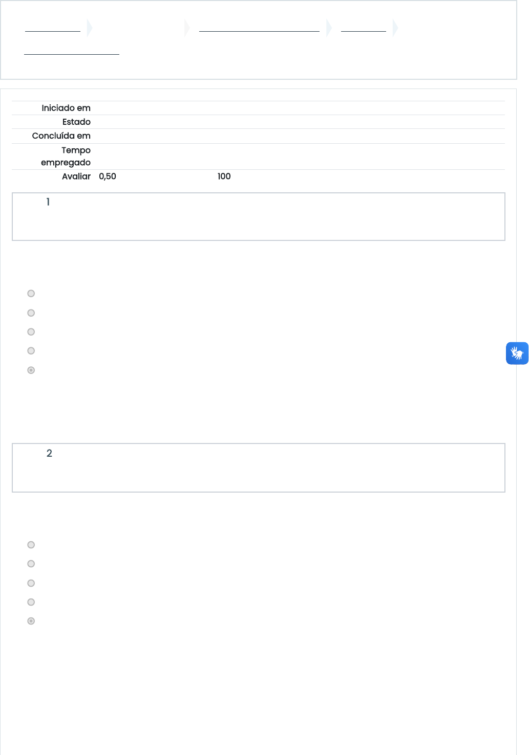 Avaliação - Unidade IV: Revisão da tentativa 1/5 Página inicial Minhas disciplinas 2024/1 - Eletrônica Analógica UNIDADE IV Avaliação - Unidade IV Iniciado em fev 2024 Estado Finalizada Concluída em fev 2024 Tempo empregado minutos segundos Avaliar 0,50 de um máximo de 0,50(100%) Questão 1 Completo Atingiu 0,05 de 0,05 Questão 2 Completo Atingiu 0,05 de 0,05 Numa polarização por divisor de tensão com um transistor pnp, você deve usar: a. Terra. b. Uma fonte de alimentação negativa. c. Fonte CA. d. Uma fonte de alimentação positiva. e. Resistores. A resposta correta é: Resistores. Quando um JFET está em corte, as camadas de depleção estão: a. Conduzindo. b. Bem afastadas. c. Bem juntas. d. Barrado. e. Se tocando. A resposta correta é: Se tocando. https://ambienteonline.uninga.br/ https://ambienteonline.uninga.br/course/view.php?id=23566 https://ambienteonline.uninga.br/course/view.php?id=23566§ion=6 https://ambienteonline.uninga.br/mod/quiz/view.php?id=668311 Avaliação - Unidade IV: Revisão da tentativa 2/5 Questão 3 Completo Atingiu 0,05 de 0,05 Questão 4 Completo Atingiu 0,05 de 0,05 Questão 5 Completo Atingiu 0,05 de 0,05 A transcondutância indica a eficácia da tensão de entrada em controlar a. O ganho de tensão. b. A resistência de entrada. c. A tensão da fonte. d. A corrente de saída. e. A corrente no gate. A resposta correta é: A corrente de saída. O canal de um JFET está entre o a. input and output. b. gate and source. c. gate e drain. d. drain and source. e. coletor – emissor. A resposta correta é: drain and source. A maioria dos FETs de potência é usada em: a. Circuitos mistos. b. Aplicações de alta potência. c. Circuitos Integrados. d. Computadores digitais. e. Estágios de RF. A resposta correta é: Aplicações de alta potência. Avaliação - Unidade IV: Revisão da tentativa 3/5 Questão 6 Completo Atingiu 0,05 de 0,05 Questão 7 Completo Atingiu 0,05 de 0,05 Questão 8 Completo Atingiu 0,05 de 0,05 A impedância de entrada de um JFET a. Aproxima-se do infinito. b. É impossível prever. c. Aproxima-se de 1. d. Aproxima-se de 0. e. 0. A resposta correta é: Aproxima-se do infinito. A transcondutância aumenta quando a corrente no dreno se aproxima de: a. Iv b. 0 c. Id (sat) d. Is e. Idss A resposta correta é: Idss Quando um MOSFET-D canal n tem Id > Idss ele a. Opera no modo de crescimento. b. Opera no modo depleção. c. Modo amplificado. d. É danificado. e. Está polarizada diretamente. A resposta correta é: Opera no modo de crescimento. Avaliação - Unidade IV: Revisão da tentativa 4/5 Questão 9 Completo Atingiu 0,05 de 0,05 Questão 10 Completo Atingiu 0,05 de 0,05 Um amplificador de base comum pode ser aplicado quando: a. Todas acima. b. É preciso amplificar altas frequências. c. É preciso um ganho de tensão sem ganho de corrente. d. Existe necessidade estrita em amplificar baixas frequências . e. Há uma relação de impedância baixa para alta. A resposta correta é: Existe necessidade estrita em amplificar baixas frequências . Um MOSFET-D é considerado um a. Dispositivo passivo. b. Dispositivo controlado por corrente. c. Dispositivo normalmente em corte. d. Dispositivo normalmente em condução. e. Chave de alta potência. A resposta correta é: Dispositivo normalmente em condução. https://ambienteonline.uninga.br/mod/resource/view.php?id=668310&forceview=1 https://ambienteonline.uninga.br/mod/page/view.php?id=668312&forceview=1 https://www.uninga.br/ tel:Mobile : 0800 800 5009