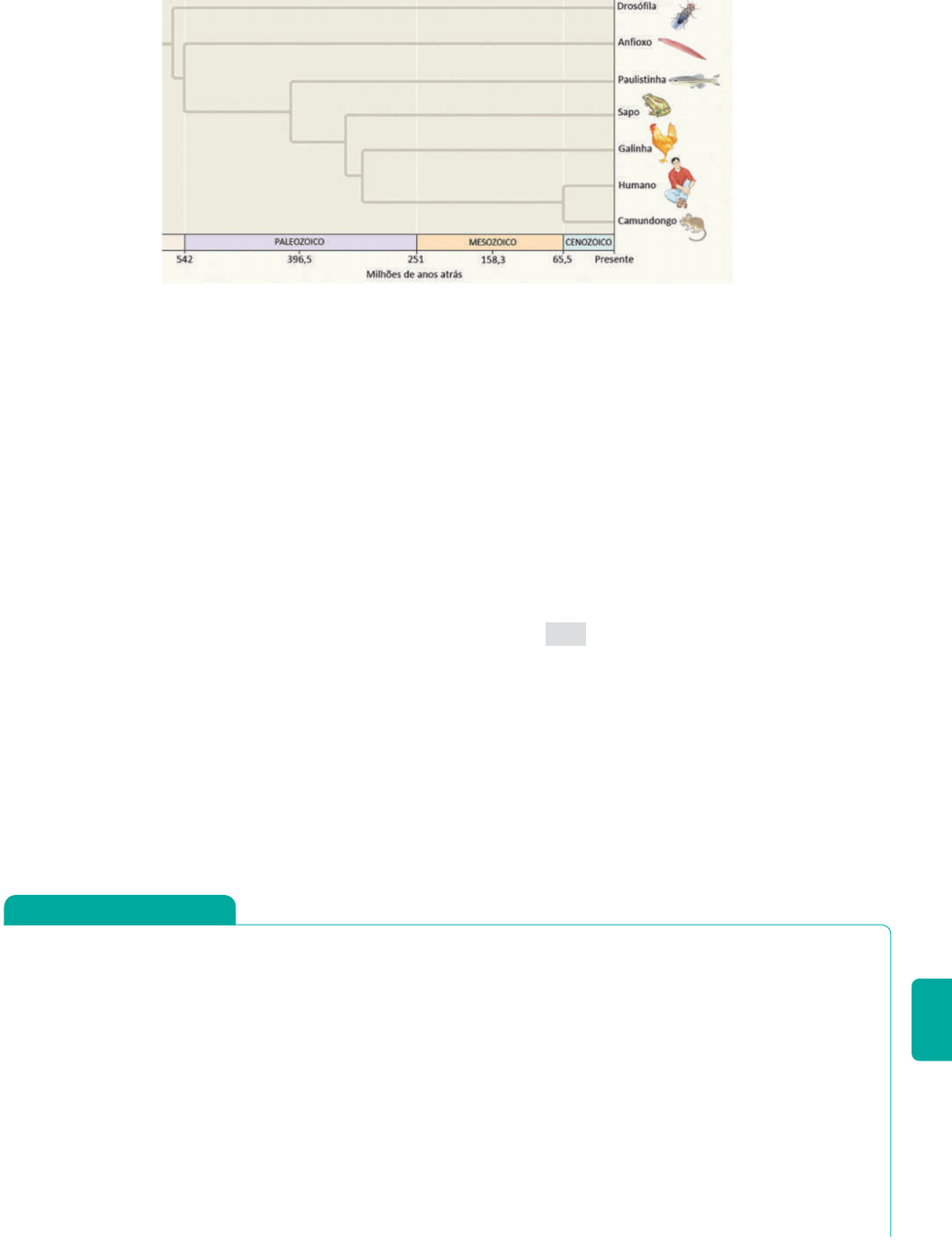 F R E N T E 3 209 25 PUC-SP 2018 Considere a seguinte filogenia. 02 Considerando a estrutura celular e o sequenciamen- to do DNA, os vírus e as bactérias são classificados no Reino Monera. 04 Considerando a classificação zoológica e o sistema binomial, Ursus arctos e Ursus horribilis são espécies pertencentes ao mesmo gênero e à mesma família. 08 Considerando os níveis de classificação botânica, as plantas de milho (Zea mays) e de feijão (Phaseolus vulgaris) são classificadas em famílias, em ordens e em classes de um mesmo reino. 16 Considerando a forma de alimentação, os protozoários estão classificados entre os animais invertebrados, e as algas unicelulares estão incluídas no reino vegetal. Soma: 28 Esal-MG Os cordados são caracterizados pela pre- sença de notocorda, tubo nervoso dorsal e fendas faringeanas. A notocorda é uma estrutura de função: A nervosa. B de sustentação. circulatória. respiratória. sensorial. 29 PUC-Minas Produz a concha dos moluscos: A pé. B rádula. manto. bisso. umbo. De acordo com as informações expressas na logenia, é CORRETO armar que: A a notocorda é uma estrutura que surgiu há cerca de 542 milhões de anos. B a respiração pulmonar nos vertebrados surgiu há mais de 400 milhões de anos. a homeotermia é uma novidade evolutiva surgida no Cenozoico. a coluna vertebral é uma estrutura surgida há cerca de 300 milhões de anos. 26 PUC-SP (Adapt.) As estruturas de defesa denominadas nematocistos são observadas nos animais: A espongiários. B protozoários. moluscos. equinodermos. cnidários. 27 UEM 2017 A nomenclatura e a classificação biológica baseadas em normas e em critérios são importantes para a identificação correta dos organismos. A respei- to dessas normas e desses critérios, assinale o que for correto. 01 Considerando a presença do material genético no interior de um núcleo organizado, os organismos são classificados em eucariontes e em procariontes. Fonte: Reece e cols. Biologia de Campbell. 10a .ed. Porto Alegre: Artmed, 2015. Nomenclatura A nomenclatura científica adota padrões. Por exemplo, para família são indicadas as seguintes terminações: idae (para animais) e aceae (para vegetais). Felidae (felídeos) é a família a que pertence a onça; Palmaceae (palmáceas) é a família dos coqueiros e palmeiras. Também há detalhes acerca do nome científico. Por exemplo, o segundo termo do nome normalmente é escrito com inicial minúscula, mas pode ser indicado com inicial maiúscula se for uma referência à pessoa. O protozoário causador da moléstia de Chagas é o Trypanosoma cruzi, o qual também pode ser indicado por Trypanosoma Cruzi, pois o segundo termo é uma homenagem a Oswaldo Cruz. Mamíferos, aves e répteis pertencem ao filo dos cordados; além disso, são classificados como pertencentes a uma divisão dentro dos cordados, o subfilo vertebrados (pois possuem coluna vertebral). Outras categorias taxonômicas também têm divisões internas seme- lhantes a essas; há, por exemplo, casos de subclasses, subfamílias, subespécies etc. Por outro lado, há categorias taxonômicas acima das principais; há superordens, superclasses etc. Os grupos de animais que foram apresentados serão descritos nos pró- ximos capítulos com base em dois aspectos fundamentais: • adaptações ao ambiente em que se encontram: a estrutura do orga- nismo e seu funcionamento estão relacionados com a adaptação às condições específicas de cada ambiente. Por exemplo, as esponjas são animais aquáticos e fixos; com sua capacidade de promover uma corrente de água por meio de seu corpo, conseguem obter gás oxi- gênio e partículas de alimento. A corrente de água que deixa o corpo arrasta resíduos, como o gás carbônico e excretas nitrogenadas; Texto complementar BIOLOGIA Capítulo 1 Classificação dos seres vivos210 O primeiro passo Taxonomia é a parte da Biologia que classifica os seres vivos. A Sistemática estabelece parâmetros para que a classificação seja realizada. Espécie é um conjunto de indivíduos capazes de se reproduzir em con- dições naturais, gerando descendentes férteis (conceito biológico de espécie). No século XVIII, Lineu criou as bases do sistema de classificação; utilizou o sistema binomial: cada espécie recebe um nome científico escrito em latim, constando de dois termos. Os reinos a) Metazoa ou Animalia b) Metaphyta ou Plantae c) Fungi d) Protoctista e) Monera Os domínios São categorias acima de reino e compreendem: • Eukarya engloba todas os eucariontes: Metazoa, Metaphyta, Fungi e Protoctista. • Archaea • Bacteria Outros grupos taxonômicos Reino, filo, classe, ordem, família, gênero e espécie. Regras básicas de nomenclatura O nome científico da espécie é escrito em latim e deve ser destacado do texto. Consta de dois termos: o primeiro refere-se ao gênero (inicial maiúscula); o segundo termo deve ter inicial minúscula. O conjunto dos dois termos designa a espécie. Um exemplo O nome científico da onça-pintada é Panthera onca; Panthera é o nome do gênero. Família: Felídeos Ordem: Carnívoros Classe: Mamíferos Filo: Cordados Evolução e sistemática Sistemática estabelece parâmetros para a classificação dos seres vivos, envolvendo Filogenia e Cladística. Filogenia e cladística A filogenia ou sistemática evolutiva representa grupos de seres vivos por meio de árvores filogenéticas, que indicam parentesco entre os grupos apresentados. A cladística ou filogenética sistemática é a classificação de seres vivos baseada na tentativa de reconstrução do caminho da evolu- ção, agrupando organismos em função de parentesco próximo (ancestral comum recente). Sua representação é feita por diagramas de linhas retas, os cladogramas. Grupos monofiléticos, parafiléticos e polifiléticos Grupos monofiléticos são provenientes de um mesmo grupo ancestral recente. Grupo parafilético é o que não inclui todos os descenden