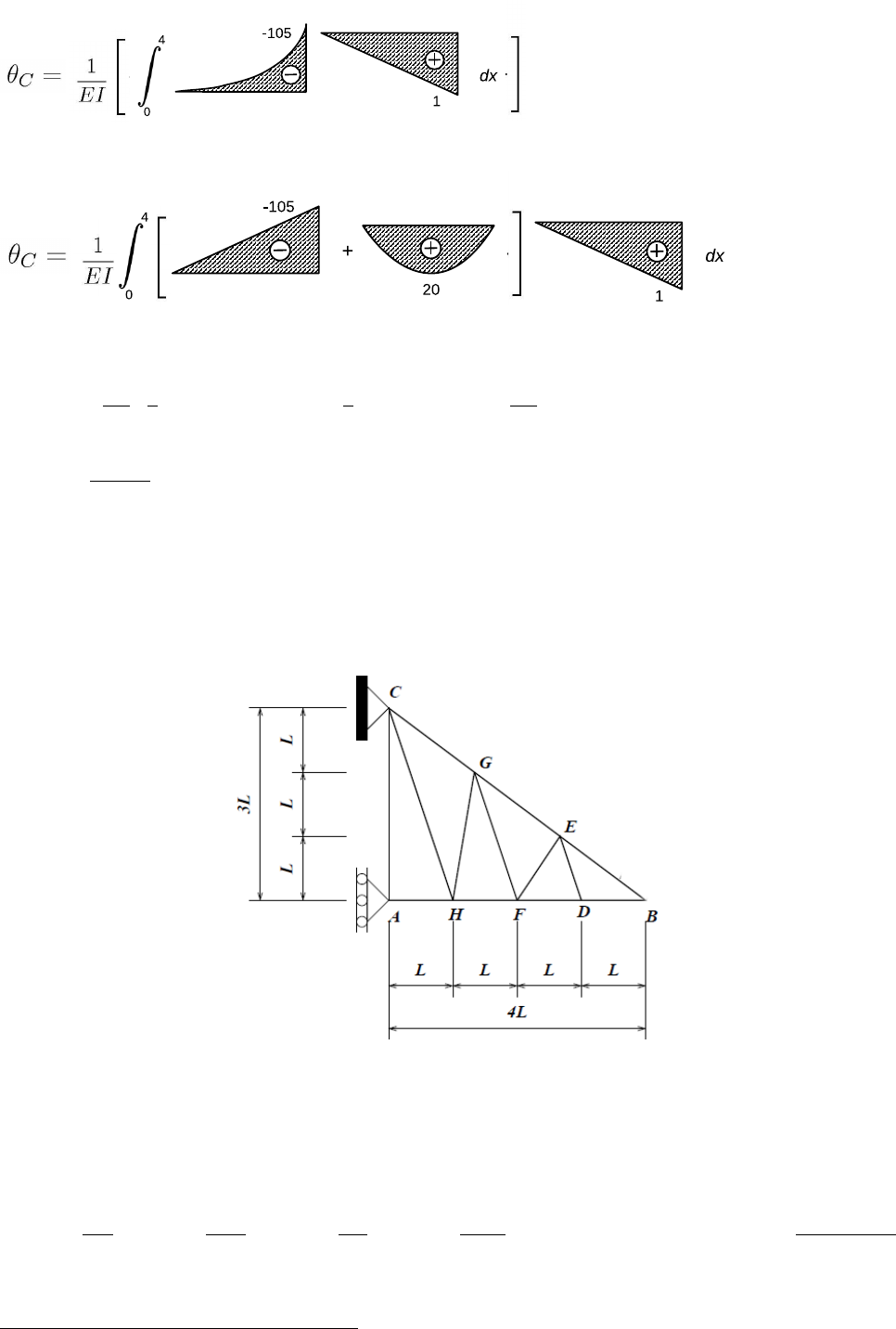 θC = 1 EI [ 1 3 × (−105)× 1× 4 + 1 3 × 20× 1× 4 ] = 1 EI [−140 + 26, 67] = −113, 3350.000 ∴ θC = 2, 267× 10 −3 rad (y) (8.8) 8.5 Prova III (02/2016) 5 Para a treliça representada na Figura 8.23, pede-se para calcular, utilizando o Método da Carga Unitária, o deslocamento vertical no ponto B para uma variação de temperatura uniforme em todas as barras de 20◦C. Informar se ocorre para baixo ou para cima. Figura 8.23: Questão 8.5 Dados do problema: L = 1 m, E = 2× 108 kN.m2, A = 2, 5× 10−3 m2, α = 1× 10−5/◦C ∆ = ∫ est nN EA dx+ ∫ est mM EI dx+ ∫ est tT GJ dx+ ∫ est fsvV GA dx+ ∫ est nα∆TCG dx+ ∫ est mα ∆T2 −∆T1 h dx A ação unitária na fase U corresponde a uma força vertical aplicada sobre o nó B. Desse modo, é 5Thaianne Simonetti de Oliveira 74