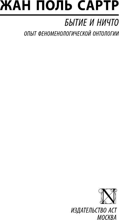 © Editions Gallimard, 1943 © Издание на русском языке AST Publishers, 2020 УДК 1(091)(44) ББК 87.3(4Фра) С20 Серия «Эксклюзивная классика» Jean-Paul Sartre L’ETRE ET LE NEANT Перевод с французского В. И. Колядко Серийной оформление Е. Д. Ферез Компьютерный дизайн А. А. Чаругиной Печатается с разрешения издательства Editions Gallimard. Сартр, Жан Поль. С20 Бытие и ничто / Жан Поль Сартр ; [перевод с французского В. И. Колядко]. — Москва : Из- дательство АСТ, 2020. — 1072 с. — (Эксклюзивная классика). ISBN 978-5-17-133458-1 «Бытие и ничто» (1943 г.) – основополагающий труд Ж.П. Сартра, в котором он рассматривает важнейшие для экзистенциализма вопросы – сущность бытия, особенности сознания, отношение человека к другим людям и к миру вещей. УДК 1(091)(44) ББК 87.3(4Фра) ISBN 978-5-17-133458-1 Предисловие Жан Поль Сартр — один из выдающихся умов XX сто- летия. Он классик французской литературы, драматург, теоретик искусства и политический публицист. Фило- софия была основанием всей его разнообразной творче- ской деятельности. Нельзя понять его художественные произведения, не зная его философии, но вместе с тем более адекватной интерпретации его философских идей можно достичь, лишь обращаясь к его романам, пьесам, рассказам. Отец Сартра, морской офицер, умер, когда мальчи- ку не исполнилось и двух лет. Воспитание он получил в семье отца матери, Карла Швейцера, дяди Альберта Швейцера (1875—1965), знаменитого немецко-француз- ского философа, врача и миссионера. Дед Сартра был профессором немецкого языка в Сорбонне. О своих детских годах философ прекрасно рассказал в повести «Слова», он был удостоен за нее звания лауреата Но- белевской премии (1964), от которой отказался по по- литическим мотивам. Сартр посещал лицей Генриха IV в Париже, а после второго замужества матери — лицей в Ла-Рошели, поступив затем в престижную высшую Нормальную школу. В этом учебном заведении и в Сор- бонне он встретился с такими ставшими впоследствии известными мыслителями, как Р. Арон, К. Леви-Строс, М. Мерло-Понти, С. Вейль, Ж. Ипполит, Э. Мунье. С некоторыми из них он сохранил дружбу на многие годы. Там же он познакомился с Симоной де Бову- 4 ар и хотя был против «буржуазного брака», заключил с ней союз, который продолжался в течение всей его жизни. Симона де Бовуар оставила воспоминания, подробно освещающие многие стороны личной жизни и общественно-политической деятель- ности философа*. После окончания высшей Нормальной школы Сартр с 1931 по 1945 г. преподает в лицеях Гавра, Лиона и Парижа, после чего отказывается от академической карьеры; от случая к случаю он выступает с докладами, дает интервью, занимается политической и обществен- ной деятельностью в соответствии с принципами своей философии активизма. В 1933—1934 гг. Сартр — стипендиат Французского ин- ститута в Германии. Первый год он провел главным образом в Берлине, изучая труды Гуссерля, Хайдеггера, Ясперса, Шелера, а также психоаналитиков. Второй год он находил- ся во Фрейбурге. Во время пребывания в Гавре в 1938 г. Сартр опубликовал философский роман в форме днев- ника «Тошнота», принесший ему известность. В 1939 г. он был призван в армию, попал в плен в 1940 г. и годом позже выпущен из заключения по состоянию здоровья. Перед войной он публикует свои первые философ- ские работы: «Трансцендентность Эго» с подзаголов- ком «Основы феноменологического описания» (1936), «Воображение» (1936), «Очерк теории эмоций» (1939) и «Воображаемое» (1940). Н