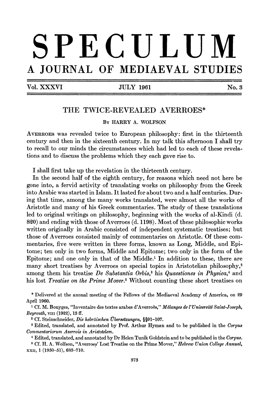 Speculum: A Journal of Mediaeval Studies, Vol. 36, No. 3 (Jul., 1961) pp. 373-549