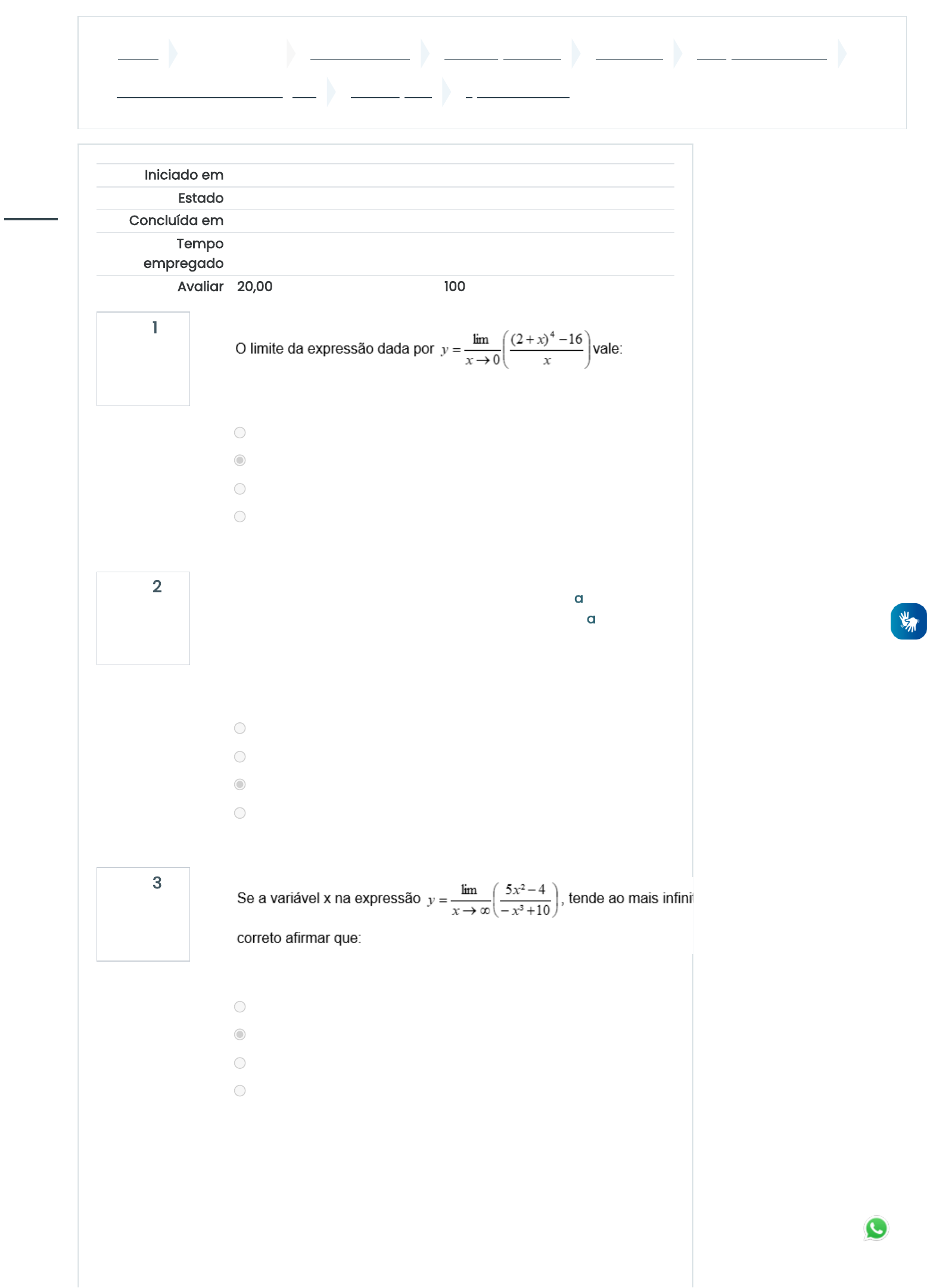 Painel Meus cursos CURSOS FUNEC Graduação - EAD Aluno EAD JUNÇÕES DE TURMA Cálculo Diferencial e Integral I AVALIAÇÕES QUESTIONÁRIO 1 Questão 1 Completo Atingiu 2,00 de 2,00 Questão 2 Completo Atingiu 2,00 de 2,00 Questão 3 Completo Atingiu 2,00 de 2,00 Iniciado em Monday, 21 Aug 2023, 20:59 Estado Finalizada Concluída em Monday, 21 Aug 2023, 21:04 Tempo empregado 5 minutos 44 segundos Avaliar 20,00 de um máximo de 20,00(100%) Escolha uma opção: a. 0 b. 32 c. 23 d. -32 A função do primeiro grau definida por f (x) = (3 – 2a).x + 2, será crescente quando o valor do termo definido por a na equação for: Escolha uma opção: a. a > 3/2 b. a = 3/2 c. a < 3/2 d. a > 0 Escolha uma opção: a. y tende a mais infinito b. Tende a zero c. tende a 5 d. y tende a menos infinito https://ava.funec.br/my/ https://ava.funec.br/course/index.php?categoryid=10 https://ava.funec.br/course/index.php?categoryid=17 https://ava.funec.br/course/index.php?categoryid=19 https://ava.funec.br/course/index.php?categoryid=77 https://ava.funec.br/course/view.php?id=342 https://ava.funec.br/course/view.php?id=342#section-4 https://ava.funec.br/mod/quiz/view.php?id=3761 javascript:void(0); https://ava.funec.br/user/index.php?id=342 https://ava.funec.br/badges/view.php?type=2&id=342 https://ava.funec.br/admin/tool/lp/coursecompetencies.php?courseid=342 https://ava.funec.br/grade/report/index.php?id=342 https://ava.funec.br/my/ https://ava.funec.br/?redirect=0 https://ava.funec.br/calendar/view.php?view=month&course=342 javascript:void(0); https://ava.funec.br/user/files.php https://ava.funec.br/course/view.php?id=342 https://ava.funec.br/course/view.php?id=488 https://ava.funec.br/course/view.php?id=442 https://ava.funec.br/course/view.php?id=613 https://ava.funec.br/course/view.php?id=291 https://ava.funec.br/course/view.php?id=433 Questão 4 Completo Atingiu 2,00 de 2,00 Questão 5 Completo Atingiu 2,00 de 2,00 Questão 6 Completo Atingiu 2,00 de 2,00 O discriminante de uma função do segundo grau, corresponde aos termos que se encontram dentro do radical da formula de Bháskara. A respeito do estudo dos sinais de uma função do segundo grau, é possível afirmar, com certeza, que: Escolha uma opção: a. Se o valor do discriminante for igual a zero e o coeficiente a for positivo, então todos os pontos dessa função do segundo grau estarão sob o eixo x. b. O valor do discriminante não pode ser usado para determinar a quantidade de raízes reais que uma função do segundo grau possui. c. Se o valor do discriminante for igual a zero e o coeficiente a for positivo, então todos os pontos dessa função estarão acima do eixo x, exceto pelo vértice que estará sobre esse eixo. d. Se o valor do discriminante for menor que zero, a função possui duas raízes reais e distintas e outras duas raízes complexas. Escolha uma opção: a. 2,5 b. 3,0 c. – 2,5 d. – 3,0 Escolha uma opção: a. b. c. d. javascript:void(0); https://ava.funec.br/user/index.php?id=342 https://ava.funec.br/badges/view.php?type=2&id=342 https://ava.funec.br/admin/tool/lp/coursecompetencies.php?courseid=342 https://ava.funec.br/grade/report/index.php?id=342 https://ava.funec.br/my/ https://ava.funec.br/?redirect=0 https://ava.funec.br/calendar/view.php?view=month&course=342 javascript:void(0); https://ava.funec.br/user/files.php https://ava.funec.br/course/view.php?id=342 https://ava.funec.br/course/view.php?id=488 https://ava.funec.br/course/view.php?id=442 https://ava.funec.br/course/view.php?id=613 https://ava.funec.br/course/view.php?id=291 https://ava.funec.br/course/view.php?id=433 Questão 7 Completo Atingiu 2,00 de 2,00 Questão 8 Completo Atingiu 2,00 de 2,00 Questão 9 Completo Atingiu 2,00 de 2,00 Questão 10 Completo Atingiu 2,00 de 2,00 Escolha uma opção: a. b. c. d. Escolha uma opção: a. b. c. d. Escolha uma opção: a. Os gráficos de f(x) e g(x) não se interceptam. b. f [g(0)] = f(0) c. f(x) é crescente e g(x) é decrescente. d. g(– 2) . f(– 1) = f(1) Escolha uma opção: a. b. c. d. javascript:void(0); https://ava.funec.br/user/index.php?id=342 https://ava.funec.br/badges/view.php?type=2&id=342 https://ava.funec.br/admin/tool/lp/coursecompetencies.php?courseid=342 https://ava.funec.br/grade/report/index.php?id=342 https://ava.funec.br/my/ https://ava.funec.br/?redirect=0 https://ava.funec.br/calendar/view.php?view=month&course=342 javascript:void(0); https://ava.funec.br/user/files.php https://ava.funec.br/course/view.php?id=342 https://ava.funec.br/course/view.php?id=488 https://ava.funec.br/course/view.php?id=442 https://ava.funec.br/course/view.php?id=613 https://ava.funec.br/course/view.php?id=291 https://ava.funec.br/course/view.php?id=433 Manter contato RA (33) 99986-3935 secretariaead@funec.br Obter o aplicativo para dispositivos móveis tel:RA (33) 99986-3935 mailto:secretariaead@funec.br https://www.facebook.com/caratingaunec https://twitter.com/caratingaunec https://download.moodle.org/mobile?version=2019052001.02&lang=pt_br&iosappid=633359593&androidappid=com.moodle.moodlemobile javascript:void(0); https://ava.funec.br/user/index.php?id=342 https://ava.funec.br/badges/view.php?type=2&id=342 https://ava.funec.br/admin/tool/lp/coursecompetencies.php?courseid=342 https://ava.funec.br/grade/report/index.php?id=342 https://ava.funec.br/my/ https://ava.funec.br/?redirect=0 https://ava.funec.br/calendar/view.php?view=month&course=342 javascript:void(0); https://ava.funec.br/user/files.php https://ava.funec.br/course/view.php?id=342 https://ava.funec.br/course/view.php?id=488 https://ava.funec.br/course/view.php?id=442 https://ava.funec.br/course/view.php?id=613 https://ava.funec.br/course/view.php?id=291 https://ava.funec.br/course/view.php?id=433