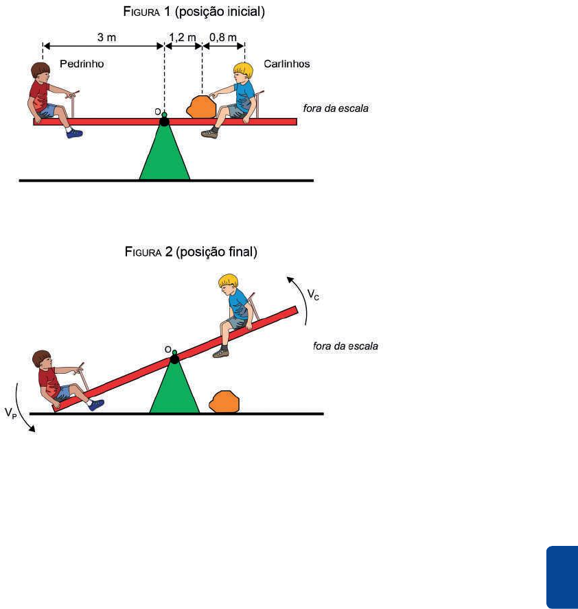 F R E N T E 2 85 a) A mola agindo no ponto C está esticada por um comprimento ∆L. Determine ∆L, supondo que a lei de Hooke seja válida nesse caso. b) O suporte em A exerce uma força de módulo F sobre a prancha. Determine F. 4 Unesp 2017 Pedrinho e Carlinhos são garotos de massas iguais a 48 kg cada um e estão inicialmente sentados, em re- pouso, sobre uma gangorra constituída de uma tábua homogênea articulada em seu ponto médio, no ponto O. Próxima a Carlinhos, há uma pedra de massa M que mantém a gangorra em equilíbrio na horizontal, como representado na figura 1. Quando Carlinhos empurra a pedra para o chão, a gangorra gira e permanece em equilíbrio na posição nal, repre- sentada na gura 2, com as crianças em repouso nas mesmas posições em que estavam inicialmente Calcule o valor da relação VP/VC, sendo VP e VC os módulos das velocidades escalares médias de Pedrinho e de Car- linhos, respectivamente, em seus movimentos entre as posições inicial e nal. Em seguida, calcule o valor da massa M, em kg. FÍSICA Capítulo 11 Estática86 5 Mackenzie (Adapt.) Um designer projeta um móbile usando três hastes rígidas de pesos desprezíveis, interligadas por fios ideais, e quatro bonequinhos, conforme a figura. Cada haste tem 15 cm de comprimento. Para que o conjunto permaneça em equilíbrio, com as hastes na horizontal, qual deve ser a massa do bonequinho X? 6 Fuvest 2020 Uma equilibrista de massa M desloca se sobre uma tábua uniforme de comprimento L e massa m apoia- da (sem fixação) sobre duas colunas separadas por uma distância D (D < L) de modo que o centro da tábua esteja equidistante das colunas. O ponto de apoio da equilibrista está a uma distância d (tal que D/2 < d < L/2) do centro da tábua, como mostra a figura. L dg D Coluna A Tábua Coluna a) Considerando que a tábua está em equilíbrio, faça um diagrama indicando todas as forças que atuam sobre a tábua e seus respectivos pontos de aplicação. b) Calcule o torque resultante exercido pelos pesos da equilibrista e da tábua em relação ao ponto A (ponto de apoio da tábua na coluna mais próxima da equilibrista). Escreva sua resposta em termos de grandezas menciona- das no enunciado (M, L, m, D, d) e da aceleração da gravidade g. c) Calcule a distância máxima dmáx da equilibrista ao centro da tábua para que o conjunto permaneça em equilíbrio estático. Considere os seguintes dados: comprimento da tábua: L = 5 m; massa da tábua:m = 20 kg, massa da equilibrista: M = 60 kg, distância entre as colunas: D = 3 m. Note e adote: Despreze as espessuras da tábua e da coluna. Use g = 10 m/s 2 5 cm X 10 cm 5 cm 10 cm 5 cm 10 cm 10 g F R E N T E 2 87 Exercícios propostos 1 UFPE A figura mostra uma estrutura vertical que con- siste de oito blocos cúbicos idênticos, com densidade de massa uniforme. Os pontos A, B, C, D, E e F são localizados nos centros de cinco cubos. Podemos afirmar que o centro de massa da estrutura está loca- lizado ao longo do segmento de reta: A B C E D F a BD b BE c BF d AE e CE 2 UFMS Centro de massa (CM) e centro de gravidade (CG) são dois conceitos físicos importantes para o estudo da dinâmica dos corpos rígidos. Com rela- ção a esses pontos em um corpo rígido, é correto afirmar: 01 Se uma força resultante está aplicada no centro de massa de um corpo rígido, essa força não causará efeito de rotação nesse corpo. 02 Se imaginarmos um plano que secciona um corpo rígido, passando pelo seu CM, esse plano dividirá o corpo em duas partes que sempre contêm massas iguais. 04 A posição do CM em um corpo depende de como a matéria que constitui o corpo é distribuída no espaço, enquanto que a posição de seu CG, além da condição anterior, depende também do campo gravitacional que permeia o espaço ocupado pelo corpo. 08 A posição do CM de um corpo coincide com a po- sição do CG desse corpo, se o campo gravitacional onde esse corpo está imerso for uniforme. 16 Independente da forma do corpo rígido, sempre existe massa do corpo na posição do seu CM. Soma:�� 3 Unesp Duas esferas homogêneas, de raios R1 e R2 e massas m1 e m2, foram fixadas uma à outra de modo a formar um sistema rígido, indicado na figura a seguir. Sendo R1 = 2R2 e m1 = m2/2, o centro do sistema assim constituído encontra-se: O1 O2 a no centro da esfera maior. b no centro da esfera menor. c no ponto de fixação das esferas. d a meia distância entre o centro O1 e o ponto. e a meia distância entre o centro O2 e o ponto de fixação. 4 Unesp 2011 Um lustre está pendurado no teto de uma sala por meio de dois fios inextensíveis, de mesmo comprimento e de massas desprezíveis, como mostra a figura 1, onde o ângulo que cada fio faz com a verti- cal é 30o. As forças de tensão nos fios têm a mesma intensidade. 30° Figura 1 60° Figura 2 Considerando cos 30 o ≅ 0,87, se a posição do lustre for modicada e os os forem presos ao teto mais dis- tantes um do outro, de forma que o ângulo que cada um faz com a vertical passe a ser o dobro do origi- nal, como mostra a gura 2, a tensão em cada o será igual a: a 0,50 do valor original. b 1,74 do valor original. c 0,86 do valor original. d 2,00 do valor original. e 3,46 do valor original. 5 Acafe 2020 A tecnologia tem ajudado na realização de nossas atividades diárias dando-nos objetos que dão mais praticidade e conforto. A cadeira é um desses objetos. Hoje há cadeiras construídas com vários ma- teriais e objetivos, e que apresentam mais tecnologia incorporada que antigamente. Recentemente, apare- ceu no mercado a cadeira gamer para quem deseja ficar muito tempo sentado, jogando vídeo game ou estudando. As figuras 1, 2, 3 e 4 mostram uma pessoa sentada e imóvel em uma cadeira gamer, em quatro posições distintas e com os pés sem tocar no chão. FÍSICA Capítulo 11 Estática88 Com base no exposto, analise as armativas a seguir. I. A força total aplicada pela pessoa sobre a cadeira é maior na figura 1 qu