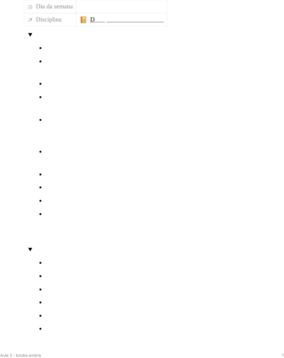 Aula 3 bouba aviária 1 Aula 3 - bouba aviária Dia da semana Disciplina 📔 Doenças das aves domésticas ba doença infecciosa viral das aves domésticas e silvestres domiciliadas disseminação lenta - muitas vezes vê-se em uma área só, e não chega a atingir todo o galpão grande distribuição em criações aviárias lesões crostosas e nodulares em regiões sem pena - cabeça, barbela, crista, em torno dos olhos lesões fibro-necróticas e proliferativas na memb mucosa do trato resp superior (narina e traqueia), boca e esôfago (forma diftérica) - tipo de infecção depende da quantidade de vírus no animal precisa de porta de entrada para acontecer - canibalismo, picada de inseto, lesões de pele começa como lesão úmida e depois fica mais seco, pode virar úlceras isolar os animais doentes e vacinar os demais ave pode ficar de boca aberta por conta do tamanho que fica a língua epitelioma contagioso/difteria aviária/varíola aviária (antigo, não usa-se mais)/pipoca ou caroço (antigo, não usa-se mais) etiologia poxvírus f poxviridae subf chordopoxviridae g avipoxvirus vírus dna fita dupla (vírus dna tem menos mutações que vírus rna) várias cepas - afetam espécies diferentes, são específicos https://www.notion.so/Doen-as-das-aves-dom-sticas-afe703a3ff0c4497a4b70dd3d3ec5c88?pvs=21 https://www.notion.so/Doen-as-das-aves-dom-sticas-afe703a3ff0c4497a4b70dd3d3ec5c88?pvs=21 https://www.notion.so/Doen-as-das-aves-dom-sticas-afe703a3ff0c4497a4b70dd3d3ec5c88?pvs=21 Aula 3 bouba aviária 2 vírus do pombo consegue levar à imunidade em aves domésticas - galinha, peru grande 258x354 nm replica no citoplasma da célula envelopado galinhas - poxvírus galinha; menos patogênico em aves adultas pouca importância p codornas fowlpox importância econômica em aves comerciais diminui produção de ovos mortalidade baixa perus - poxvírus peru pombo - poxvírus pombo avestruzes - PVO infecta cél epiteliais em dias de frio → aves muito amontoadas p esquentar, andam umas sob as outras = lesão = porta de entrada inclusões citoplasmáticas eosinofílicas (corpúsculos de bollinger) forma cutânea leve → mortalidade baixa, morbidade de até 50% forma diftérica + infecções secundárias → alta mortalidade até 80%, princ se tiver infecções secundárias; normalmente usado atb junto forma sistêmica → alta mortalidade em canários (muitas vezes não causam nem forma cutânea e nem diftérica; pneumonia grave, pode apresentar apatia e morrer rápido) resistência do vírus bastante resistente no ambiente e desinfetantes podem sobreviver em descamações de pele por meses ou anos resistente: solução de fenol 1%, formalina 0,1%, éter inativado: soda cáustica 1%, aquecimento 30’ 50° ou 8’60° Aula 3 bouba aviária 3 ocorrência distribuição mundial disseminação lenta descrita em mais de 60 espécies machos e fêmeas de qlq idade visualização a partir da 3 semana de idade incubação 4-10d lenta difusão sem importância em saúde pública mais importante em galinhas e perus patogênese e epidemiologia porta de entrada: lesões cutâneas, canibalismo - perus princ, ação mecânica, insetos hematófagos - moscas/mosquitos em áreas sem penas aparecimento da doença e lesões depende do tipo de vírus envolvido e espécie