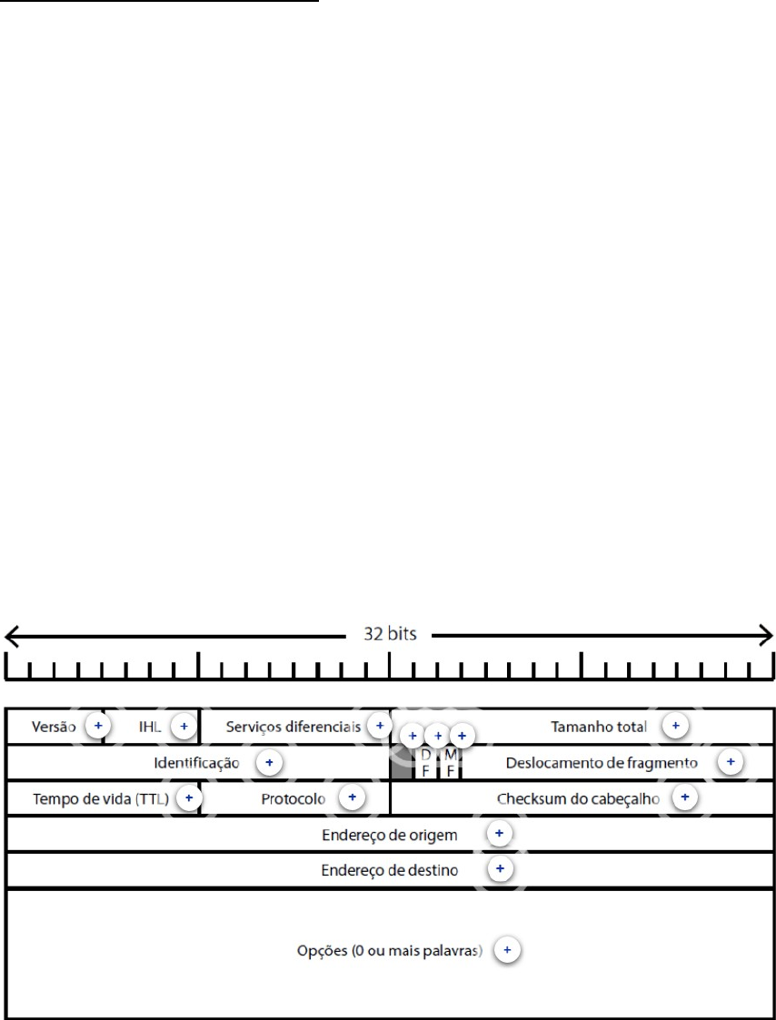 Protocolos IPV4 e IPV6 Endereços IPV4 – 1 byte = 8 bits O protocolo IP foi definido para transmissão de dados com base em endereços virtuais, usados para interconexão de redes de comunicação de chaveamento de pacotes. Ele opera na camada de rede e é responsável pela transmissão de conjuntos de dados chamados de datagramas, desde o nó de origem até o nó de destino. Para longos datagramas, o protocolo na versão IPv4 encarrega-se de fragmentá-los na origem e reconstruí-los no destino. A fragmentação foi excluída da versão IPv6. Cada pacote de dados enviado pelo IP convencionou-se chamar de datagrama. Um datagrama é formado por duas partes, sendo uma fixa de 20 bytes, que é nominada header, e outra variável, que contém os dados da comunicação. A estrutura do header (cabeçalho) de um datagrama do IPv4 e os campos do header do datagrama são apresentados: Estrutura e Campos do Header · Versão: 4 bits. Versão no Protocolo IP no IPV4, tem o valor 4. · IHL: 4 bits. Comprimento do header em palavras de 32 bits. Seu valor varia de 5 a 15. · Serviços Diferenciais: 8 bits. Os 6 bits superiores designam a classe do serviço e os 2 bits inferiores designam sinalizações de congestinamento de pacotes · Tamanho Total: 16 bits. Informa o tamanho total do datagrama, que é a soma do tamanho do header com a áera de dados, com valor máximo de 65.535 bytes. · Identificação: 16 bits. Contém a identificação de um bloco de dados recebido pela origem. No caso de um bloco de dados muito grande que é fragmentado em pedaços menores, essa identificação é a mesma para todos os datagramas que contenham fragmentos do bloco original, permitindo que seja reconstruído no destino. · Bit Nulo: 1 bit. Não utilizado · DF: 1 bit. Bit de impedimento de fragmentação. Quando ativado, indica que, se a área de dados for muito grande, ela não deve ser fragmentada e uma mensagem de erro deve ser enviada para o nó de origem. · MF: 1 bit. Bit de idenficação do último fragmento. Quando ativado, indica que mais fragmentos ainda estão por serem enviados. Quando desativado, indica que esse é o último fragmento. · Deslocamento de Fragmento: 13 bits. Indica a posição do fragmento no bloco de dados original. · Tempo de Vida: 8 bits. Contador do tempo de vida de um datagrama. Toda vez que um datagrama passa por um roteador (hop), esse contador é decrementado. Caso siga a zero, esse datagrama é descartado e uma mensagem de erro é enviada para o nó de origem. · Protocolo: 8 bits. Indica a qual protocolo de nível superior o datagrama pertence. · Checksum de Cabeçalho (Header): 16 bits. Valor de verificação da integridade do header, calculado com base num algoritmo específico. Existe um erro de repetição caso um valor indicado no header seja diferente do calculado. O valor de checksum é calculado a cada trajeto do datagrama (hop), até chegar ao nó de destino. · Endereço de Origem: 32 bits. Endereço de IP do nó de origem. · Endereço de Destino: 32 bits. Endereço de IP do nó de destino. · Opções: o campo opção varia de 0 a mais bytes, em múltiplos de 4 bytes. É usado para especificar aspectos de segurança, roteando os registros de controle de desempenho da rede. Está em desuso atualmente. O endereço de um nó na rede IPv4 é composto de 4 bytes, ou 32 bits. Portanto, o número máximo é de 4.294.967.296 (232) endereços distintos. A princípio, basta ter um endereço IP válido e conhecer o endereço IP do nó de destino da internet para que se consiga estabelecer uma conexão, não importa o quão distante estejam entre si. Cada endereço IPv4 pode ser decomposto em duas partes. A primeira refere-se ao endereço da rede, e a segunda, ao endereço do nó na rede. Esses endereços são organizados em classes, conforme apresentado: Classes de endereços do IPV4 Nos endereços da classe A, temos um menor número de redes e um maior número máximo de nós (hosts) na rede. Já nas redes de classe C, temos um maior número de redes, compostas por um menor número máximo de nós em cada uma. A classe D é usada para comunicação multicast, isto é, de um nó para muitos nós simultaneamente. A classe E foi reservada para o futuro. Na prática Numa rede classe C, com endereço 192.168.2.0, teremos, por exemplo, os seguintes endereços válidos: · 192.168.2.0 – primeiro endereço IP da faixa é interpretado como sinônimo do próprio endereço do nó. Ele é usado em tabelas internas de configuração de rede desse nó. · 192.168.2.1 – primeiro endereço disponível para um nó da rede. · 192.168.2.21 – exemplo de outro endereço disponível. · 192.168.2.254 – último endereço disponível para um nó dessa rede. · 192.168.2.255 – último endereço IP da faixa (todos os bits do endereço de host com valor 1) é usado para endereçar todos os nós da faixa. Enviando uma mensagem para esse endereço, todos os nós daquela rede interpretarão que a mensagem foi endereçada para eles, individualmente. Suponha que a rede 192.168.2.0 deva ser subdividida em outras 2 redes, chamadas de sub-redes: · Sub-rede 1: 192.168.2.0, com 126 endereços disponíveis, de 192.128.2.1 a 192.168.2.126. · Sub-rede 2: 192.168.2.128, com 126 endereços disponíveis, de 192.128.2.129 a 192.168.2.254. Para esses casos, foi criada uma notação chamada de “máscara de sub-rede” para indicar explicitamente em um endereço IP o que faz parte do endereço da rede e o que faz parte do endereço dos nós. Essa notação é obtida adicionando-se ao final do endereço um caractere “/” seguido de um número decimal. Esse número que denominaremos “L” corresponde ao número de bits do campo de endereço de rede, contados da esquerda para a direita, conforme exemplificado: Máscara de sub-rede Por questões históricas de implementação, a máscara de sub-rede assim chamada era composta de números 1 consecutivos correspondentes aos bits que faziam parte do ender