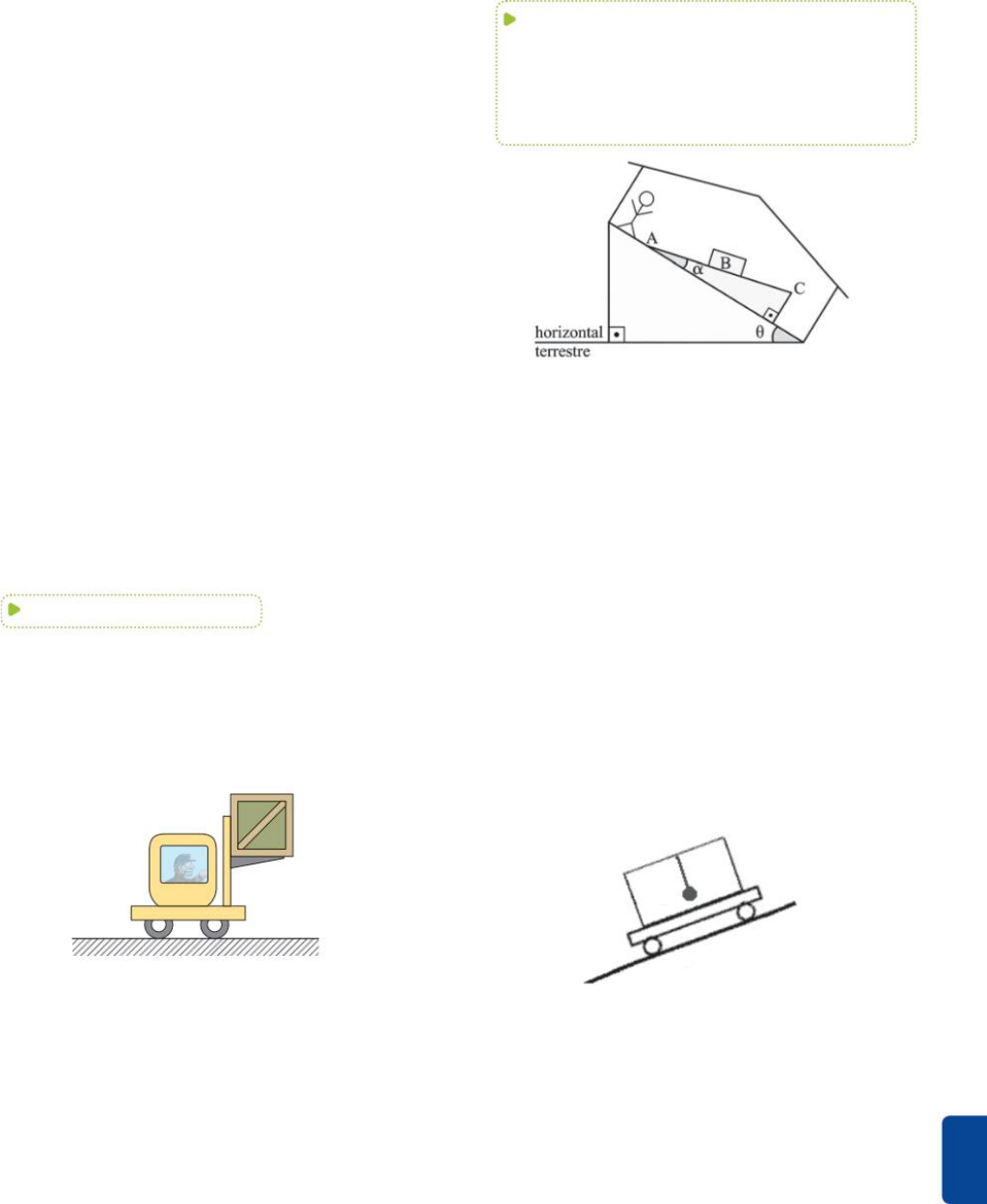 F R E N T E 1 121 Considerando como dados m1, m2 e o módulo da ace- leração da gravidade g, calcule, no instante em que a esfera de massa m1 perde o contato com o chão: a) a tensão no fio. b) a aceleração da esfera de massa m2. 40 PUC-Minas Uma pessoa está dentro de um elevador em repouso, sobre uma balança que acusa uma leitu- ra igual a P. Se o elevador subir com aceleração igual a duas vezes a aceleração da gravidade, a nova lei- tura será: A P 2P C 3P d 4P e 5P 41 Unifei Um corpo está suspenso por um dinamômetro, ligado ao teto de um elevador (g = 10,0 N/kg). a) Se o elevador possui uma aceleração, na direção vertical e sentido para cima, de 2,0 m/s 2 e se a leitura no dinamômetro for de 960 N, qual é o peso desse corpo quando em repouso na superfície da Terra? b) Se o elevador desce acelerado com uma acelera- ção a= 5,0 m/s2, qual será a leitura no dinamômetro? 42 FCMS Um homem cujo peso é 600 N toma um elevador na metade de um edifício e pisa sobre uma balança. Quando o elevador começa a se mover, ele observa que a balança marca 720 N durante 5 segundos, a se- guir marca 600 N durante 10 segundos, e, finalmente, 480 N durante 5 segundos, passados os quais o eleva- dor para numa das extremidades do seu trajeto. Calcule a altura aproximada do edifício. Dado: g = 10 m/s 2 . 43 UFRJ Um operário usa uma empilhadeira de massa to- tal igual a uma tonelada para levantar verticalmente uma caixa de massa igual a meia tonelada, com uma aceleração inicial de 0,5 m/s2, que se mantém cons- tante durante um curto intervalo de tempo. Use g = 10 m/s 2 e calcule, neste curto intervalo de tempo: a) a força que a empilhadeira exerce sobre a caixa. b) a força que o chão exerce sobre a empilhadeira. (Des- preze a massa das partes móveis da empilhadeira). 44 EEAR 2018 Em alguns parques de diversão há um brin- quedo em que as pessoas se surpreendem ao ver um bloco aparentemente subir uma rampa que está no piso de uma casa sem a aplicação de uma força. O que as pessoas não percebem é que o piso dessa casa está sobre um outro plano inclinado que faz com que o blo- co, na verdade, esteja descendo a rampa em relação a horizontal terrestre. Na figura a seguir, está representada uma rampa com uma inclinação a em relação ao piso da casa e uma pessoa observando o bloco (B) “subindo” a rampa (desloca-se da posição A para a posição C). Dados: 1) a pessoa, a rampa, o plano inclinado e a casa estão todos em repouso entre si e em relação à horizontal terrestre. 2) considere P = peso do bloco. 3) desconsidere qualquer atrito. Nessas condições, a expressão da força responsá- vel por mover esse bloco a partir do repouso, para quaisquer valores de θ e a que fazem funcionar corre- tamente o brinquedo, é dada por A Psen (θ + a) Psen (θ a) C Psen a d Psen θ 45 EBMSP 2018 Transportar pessoas doentes em uma am- bulância é uma grande responsabilidade, por isso não é qualquer motorista que está pronto para desempenhar esse tipo de atividade. Além de conduzir o veículo, com atenção, o profissional precisa guiar pensando sempre no bem-estar do paciente. Disponível em: https://www.guiadecursos.net/curso-de-condutor- de-veiculos-de-emergencia/. Acesso em: set. 2017. A gura representa um pêndulo simples que se en- contra preso ao teto de uma ambulância que se move ao longo de um plano inclinado, que forma um ângulo de 30 o com a superfície horizontal. Sabendo que as condições do movimento da ambu- lância estão reproduzidas na gura e caracterizado pela posição do pêndulo, que o módulo da aceleração da gravidade local é igual a 10 m/s2 e desprezando as forças dissipativas, ⇒ descreva o tipo do movimento realizado pela am- bulância nesse instante; ⇒ determine o valor da grandeza física que caracteri- za o movimento da ambulância. FÍSICA Capítulo 8 Dinâmica122 46 Uerj 2017 Um reboque de 16 toneladas é puxado por um caminhão através de um cabo de aço. Sabe-se que a aceleração do conjunto caminhão-reboque cor- responde a 200 cm/s2, e que a massa do cabo de aço é desprezível em relação às massas do caminhão e do reboque. Estime, em newtons, a tração no cabo de aço. 47 Unigranrio 2017 Para manter um carro de massa 1 000 kg sobre uma rampa lisa inclinada que forma um ângulo θ com a horizontal, é preso a ele um cabo. Sabendo que o carro, nessas condições, está em re- pouso sobre a rampa inclinada, marque a opção que indica a intensidade da força de reação normal da rampa sobre o carro e a tração no cabo que sustenta o carro, respectivamente. Despreze o atrito. Dados: sen θ = 0,6; cos θ = 0,8 e g = 10 m/s 2 . A 8 000 N e 6 000 N b 6 000 N e 8 000 N C 800 N e 600 N d 600 N e 800 N e 480 N e 200 N 48 Fuvest A figura I, a seguir, indica um sistema composto por duas roldanas leves, capazes de girar sem atrito, e um fio inextensível que possui dois suportes em suas extremidades. O suporte A possui um certo número de formigas idênticas, com 20 miligramas cada. O sistema está em equilíbrio. Todas as formigas migram então para o suporte B e o sistema movimenta-se de tal forma que o suporte B se apoia numa mesa, que exerce uma força de 40 milinewtons sobre ele, con- forme ilustra a figura II. A Figura I Figura II B A B Determine: a) o peso de cada formiga. ) o número total de formigas. 49 Na máquina de Atwood da figura a seguir, o fio (inex- tensível) e a polia têm pesos desprezíveis, a resistência do ar é insignificante e a aceleração da gravidade tem módulo g. As massas dos blocos A e B são, respecti- vamente, M e m, com M > m. g A B (1) (2) Sendo a o módulo da aceleração dos blocos e D1 e D2 as indicações dos dinamômetros ideais (1) e (2), anali- se as proposições seguintes. I. a < g II. = + D 2Mm M m g 1 III. D2 = (M + m)g IV. mg < D1 < Mg Responda mediante o código. A Todas as proposições são corretas. b Todas as proposições são erradas. C Apenas as proposições I e III 