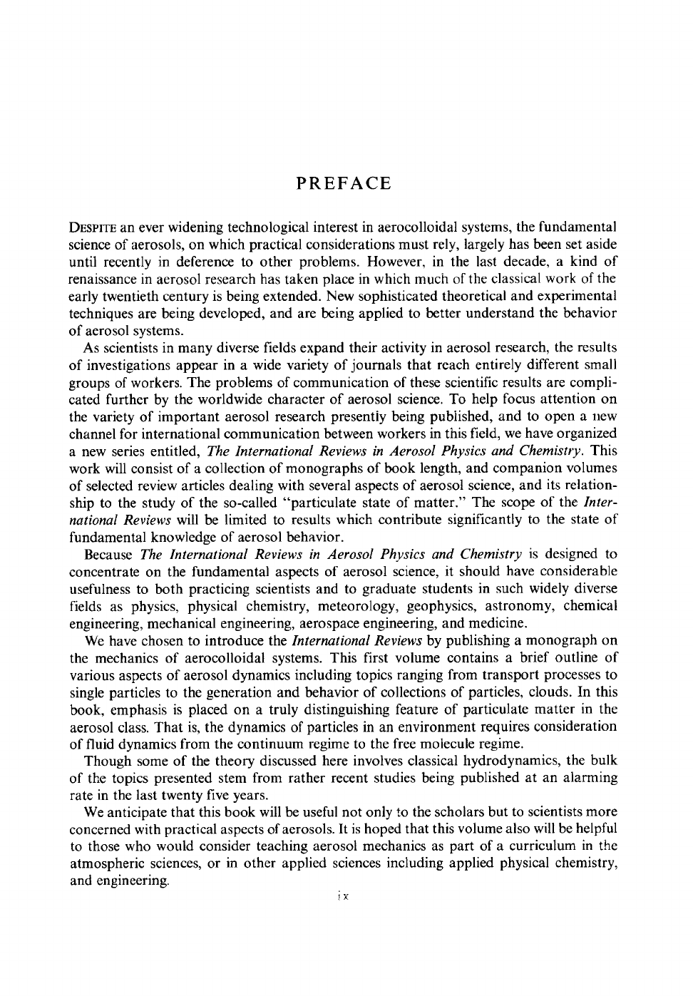 P R E F A C E DESPITE an ever widening technological interest in aerocolloidal systems, the fundamental science of aerosols, on which practical considerations must rely, largely has been set aside until recently in deference to other problems. However, in the last decade, a kind of renaissance in aerosol research has taken place in which much of the classical work of the early twentieth century is being extended. New sophisticated theoretical and experimental techniques are being developed, and are being applied to better understand the behavior of aerosol systems. As scientists in many diverse fields expand their activity in aerosol research, the results of investigations appear in a wide variety of journals that reach entirely different small groups of workers. The problems of communication of these scientific results are compli- cated further by the worldwide character of aerosol science. To help focus attention on the variety of important aerosol research presently being published, and to open a new channel for international communication between workers in this field, we have organized a new series entitled, The International Reviews in Aerosol Physics and Chemistry. This work will consist of a collection of monographs of book length, and companion volumes of selected review articles dealing with several aspects of aerosol science, and its relation- ship to the study of the so-called "particulate state of mat ter ." The scope of the Inter- national Reviews will be limited to results which contribute significantly to the state of fundamental knowledge of aerosol behavior. Because The International Reviews in Aerosol Physics and Chemistry is designed to concentrate on the fundamental aspects of aerosol science, it should have considerable usefulness to both practicing scientists and to graduate students in such widely diverse fields as physics, physical chemistry, meteorology, geophysics, astronomy, chemical engineering, mechanical engineering, aerospace engineering, and medicine. We have chosen to introduce the International Reviews by publishing a monograph on the mechanics of aerocolloidal systems. This first volume contains a brief outline of various aspects of aerosol dynamics including topics ranging from transport processes to single particles to the generation and behavior of collections of particles, clouds. In this book, emphasis is placed on a truly distinguishing feature of particulate mat ter in the aerosol class. That is, the dynamics of particles in an environment requires consideration of fluid dynamics from the continuum regime to the free molecule regime. Though some of the theory discussed here involves classical hydrodynamics, the bulk of the topics presented stem from rather recent studies being published at an alarming rate in the last twenty five years. We anticipate that this book will be useful not only to the scholars but to scientists more concerned with practical aspects of aerosols. It is hoped that this volume also will be helpful to those who would consider teaching aerosol mechanics as part of a curriculum in the atmospheric sciences, or in other applied sciences including applied physical chemistry, and engineering. ix χ P R E F A C E It is a pleasure to acknowledge the support during the writing of this book of the National Science Foundat ion through its contract with the National Center for Atmo- spheric Research, and of the Public Health Service through its grant N o . AP00479-01 to J. R. Brock. Thanks go to the many people who helped us with preparat ion and review of this manuscript. We are also grateful to those who kindly made the figures, plates and other data available to us for illustrating the many facets of aerosol dynamics. G .M.H. J .R.B.