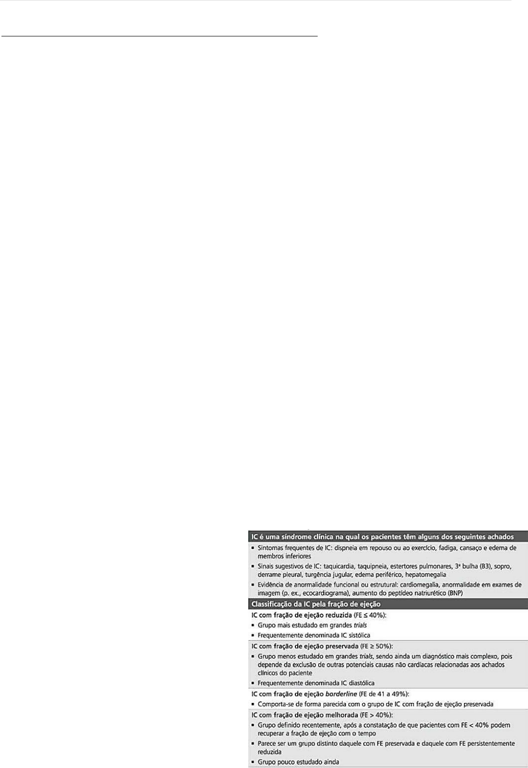 P á g i n a | 1 URGÊNCIA E EMERGÊNCIA I DESCOMPENSAÇÃO AGUDA DA INSUFICIÊNCIA CARDÍACA: ICC é uma doença grave, com altas taxas de mortalidade e morbidade, e descompensaçõess são parte de sua evolução natural. Paciente que chega com dispneia e suspeita de IC de e ter uma história clínica e exame físico bem feitos. Deve-se avaliar os fatores que precipitaram a descompensação da IC, pois é fundamental para decidir o tratamento. Pacientes idosos e/ou diabéticos possuem achados clínicos mais sutis. Lembrar também dos diagnósticos diferenciais (TEP, DPOC, etc). OBJETIVOS DO TRATAMENTO: reverter as alterações hemodinâmicas agudas, alívio rápido dos sintomas, investigar causas tratáveis da descompensação, evitar a morte a curto prazo e iniciar tratamentos que desacelerem a progressão da doença. • Pode-se classificar os pacientes em quatro perfis de acordo com a presença ou não de congestão e a qualidade da perfusão periférica. A FE é importante para classificar a IC em com FE preservada ou FE reduzida. EXAMES COMPLEMENTARES: ECG, Rx de tórax, eletrólitos, função renal e exames conforme a suspeita clínica da causa precipitante do quadro para auxílio do diagnóstico e prognóstico (ex: troponinas). • Pacientes congestos e bem perfundidos são tratados com furosemida IV e vasodilatadores VO como o captopril. Alguns entretanto podem estar muito congestos e dispneicos, não respondendo bem a isso, e necessitam de uma conduta mais agressiva com vasodilatadores e diuréticos parenterais, e até mesmo inotrópicos por um curto tempo. A nitroglicerina melhora os sintomas do quadro, especialmente se SCA concomitante – ela alivia a congestão pulmonar e melhora a perfusão coronariana. Não se justifica a prescrição de dopamina e outros por enquanto. Antigamente se suspendiam o beta-bloqueador sempre que houvesse uma descompensação aguda, mas hoje a tendência é mantê-lo, desde que não haja hipotensão e hipoperfusão graves (choque cardiogênico) CHOQUE CARDIOGÊNICO ocorre quando a disfunção cardíaca gera uma perfusão tecidual inadequada, tendo alta mortalidade. Sua principal causa é um IAM extenso ou IAM menores em um miocárdio já comprometido. Pacientes com SCA + choque cardiogênico devem passar por RVM imediatamente. Internar os pacientes com manifestações mais intensas ou que não responderem bem ao tratamento inicial. Receber alta quando próximo do peso seco, estável hemodinamicamente e sem dispneia em repouso ou aos mínimos esforços. Alta para pacientes sintomáticos aumenta a chance de reinternação breve e mortalidade. Sempre explicar ao paciente as medidas terapêuticas que podem melhorar sua sobrevida. INTRODUÇÃO E DEFINIÇÕES: IC é um estado em que a capacidade cardíaca não é capaz de fornecer perfusão adequada para as demandas periféricas, ou quando é capaz de fornecer um débito adequado, mas apenas às custas de uma pressão de enchimento ventricular aumentada. É uma síndrome complexa, resultado de qualquer dano estrutural ou funcional ao pericárdio, miocárdio, endocárdio, valvas ou grandes vasos, e ainda desordens metabólicas. Não é sinônimo de cardiomiopatia ou de disfunção do VE. A fração de ejeção (FE) é muito importante pra classificá-la – preservada ou reduzida. P á g i n a | 2 CLASSIFICAÇÃO DA NYHA E AHA/ ACC - critérios mais adequados para classificar pacientes ambulatoriais. New York Heart Association (NYHA): classifica os pacientes de acordo com o grau de limitação funcional American Heart Association (AHA)/American College of Cardiology (ACC): focaliza nos estágios de desenv. da IC EPIDEMIOLOGIA: As pessoas com mais de 40 anos têm mais de 20% de risco de desenvolver IC ao longo da vida. A incidência aumenta com a idade. O gasto com a doença é muito alto, principalmente com o grande número de hospitalizações frequentes (muitos episódios de descompensação). A mortalidade é alta. A necessidade de internação por IC é um evento sentinela, marcando este paciente como de alta mortalidade (cerca de 30% em 1 ano) ETIOLOGIA E FISIOPATOLOGIA: A descompensação da IC se caracteriza por pressões de enchimento do ventrículo direito e esquerdo elevadas, queda do débito cardíaco (FE normal ou diminuída) e aumento da resistência vascular periférica. Com a queda do DC a resposta inicial é a de aumentar a pré-carga (pressão de enchimento ventricular) e a pós-carga (resistência vascular periférica), para manter a PA e a perfusão sistêmica. Entretanto, ao invés da performance ventricular aumentar, ela fica ainda mais comprometida por causa desse aumento na pré e pós-carga, pois o aumento do volume sistólico aumenta desproporcionalmente a regurgitação de sangue pelas valvas AV. O aumento das cargas aumenta o estresse da parede ventricular e o miocárdio consome mais O2, piorando sua função e a descompensação do quadro. DO PONTO DE VISTA PRÁTICO, É BOM CLASSIFICAR OS PACIENTES EM: • IC com fração de ejeção reduzida (FE≤40 %) ou IC sistólica: A queda do DC se deve a um problema na contratilidade miocárdica que reduz a fração de ejeção do VE. • IC com fração de ejeção preservada (FE≥50%) ou IC Diastólica: A função sistólica está preservada; O débito cardíaco cai pois há uma redução na complacência ventricular, e o coração não se enche adequadamente. Grande parte das descompensações agudas da IC associadas à hipertensão, particularmente ao edema agudo de pulmão hipertensivo, se deve a essa disfunção diastólica aguda. Prevalência mediana dos estudos é de 36%. Há poucos dados para o tratamento farmacológico desta IC, ao contrário da IC sistólica. PRINCIPAIS CAUSAS OU CONDIÇÕES QUE LEVAM À IC SÃO: Doença cardíaca isquêmica; HAS; doenças infiltrativas do coração (amiloidose, hemocromatose, diabetes mellitus), taquiarritmias sustentadas, doenças valvares congênitas ou adquiridas (como a febre reumá